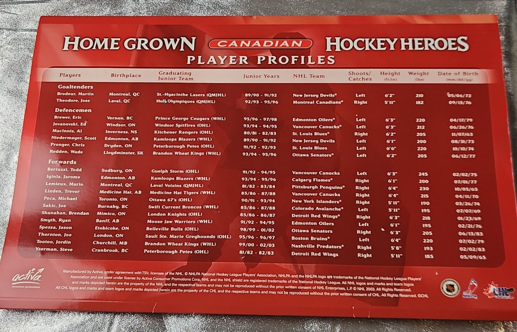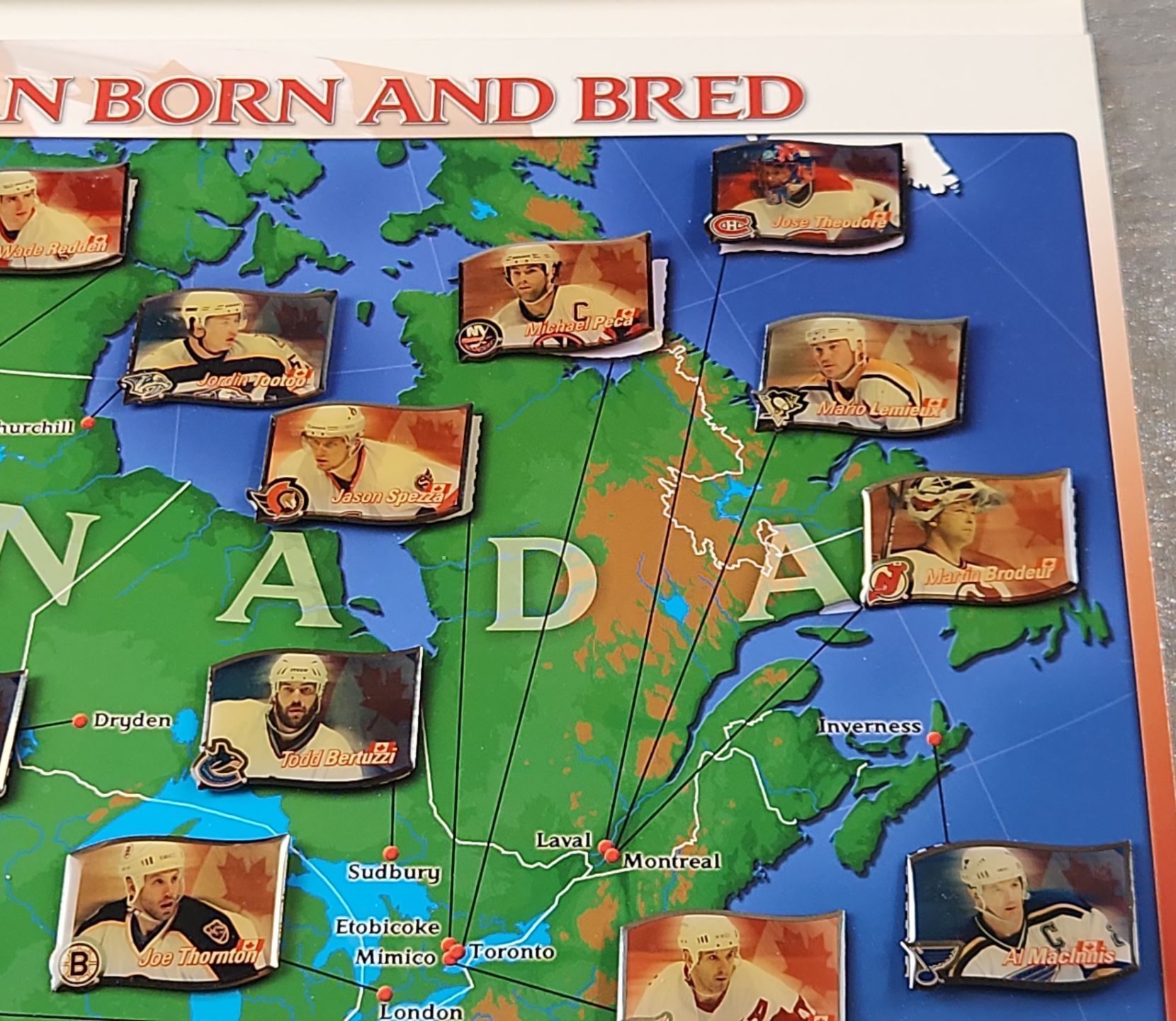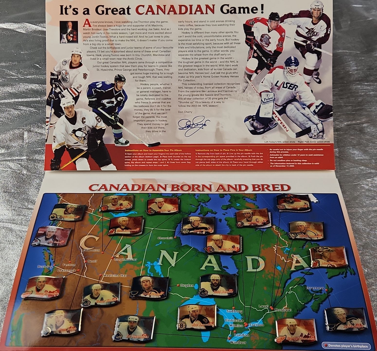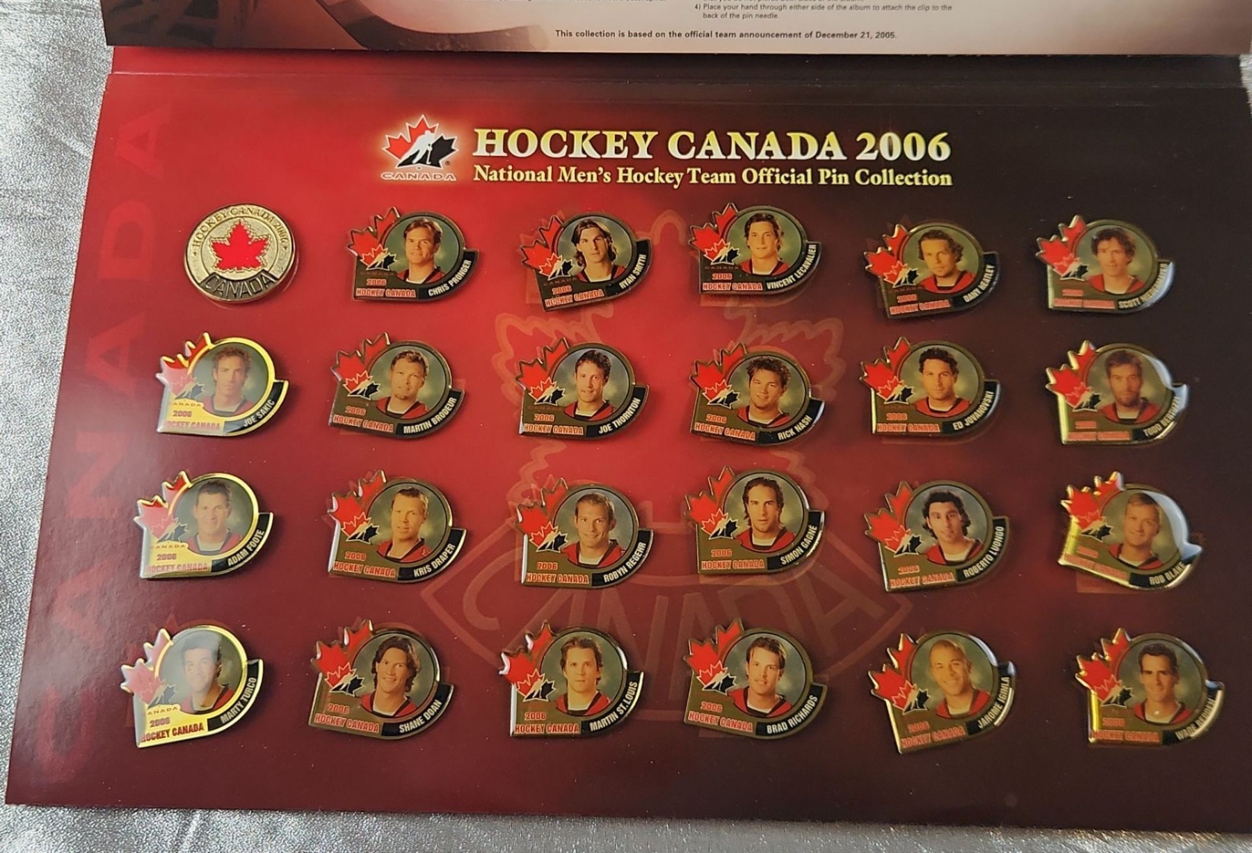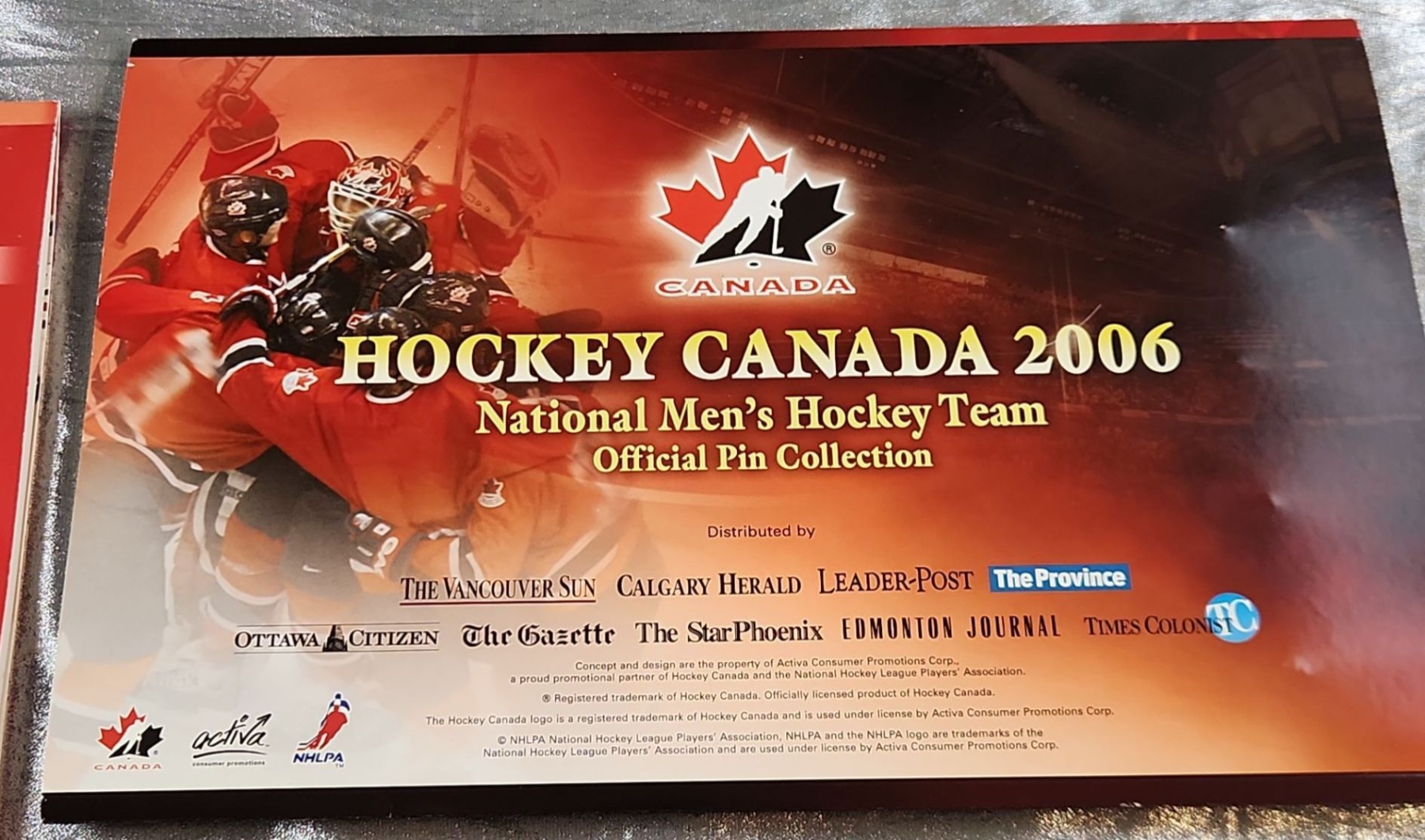 Collectible memorabilia, specifically the "Home Grown Canadian Hockey Heroes 2003/04 Pin Collection" and the "Hockey Canada 2006 National Men's Hockey Team Official Pin Collection"