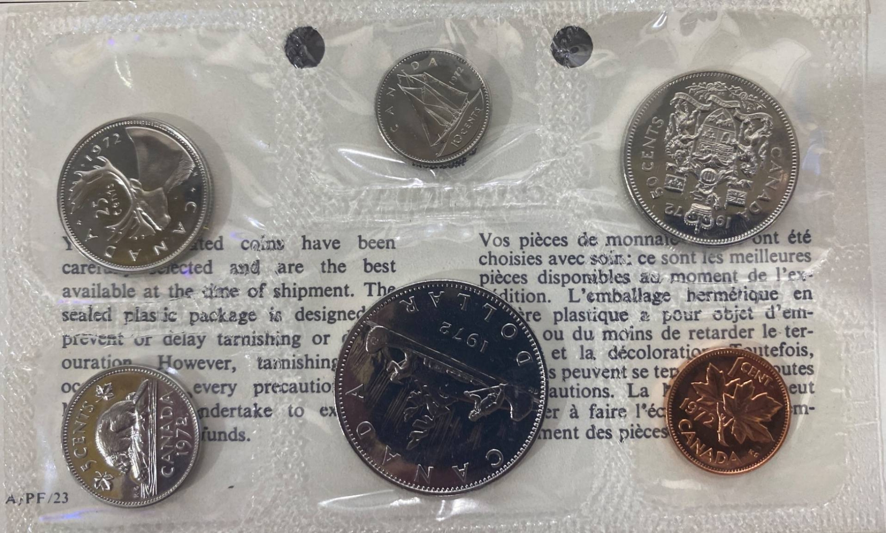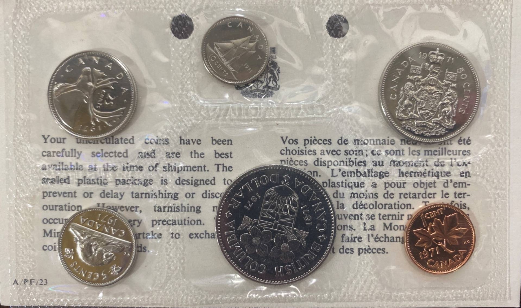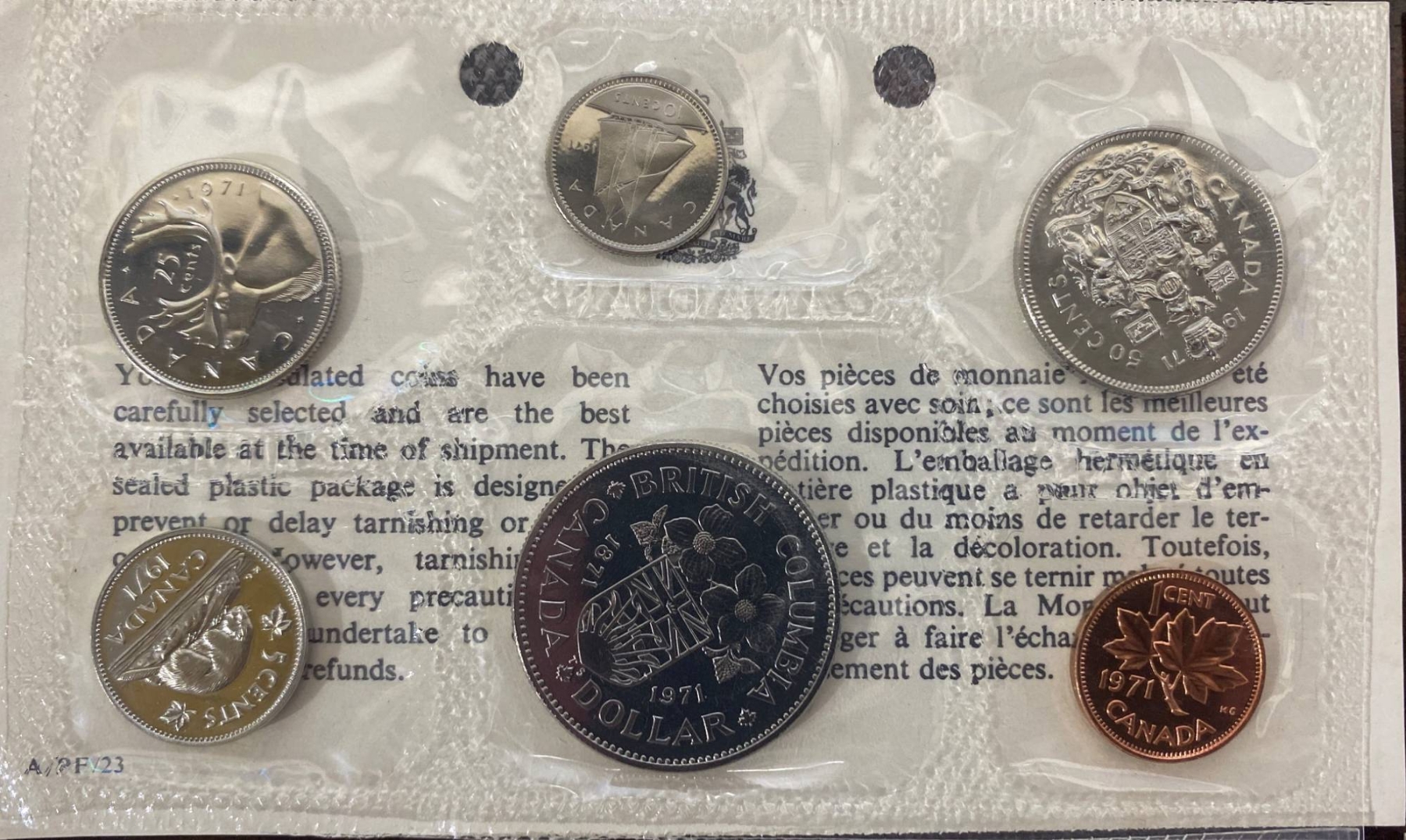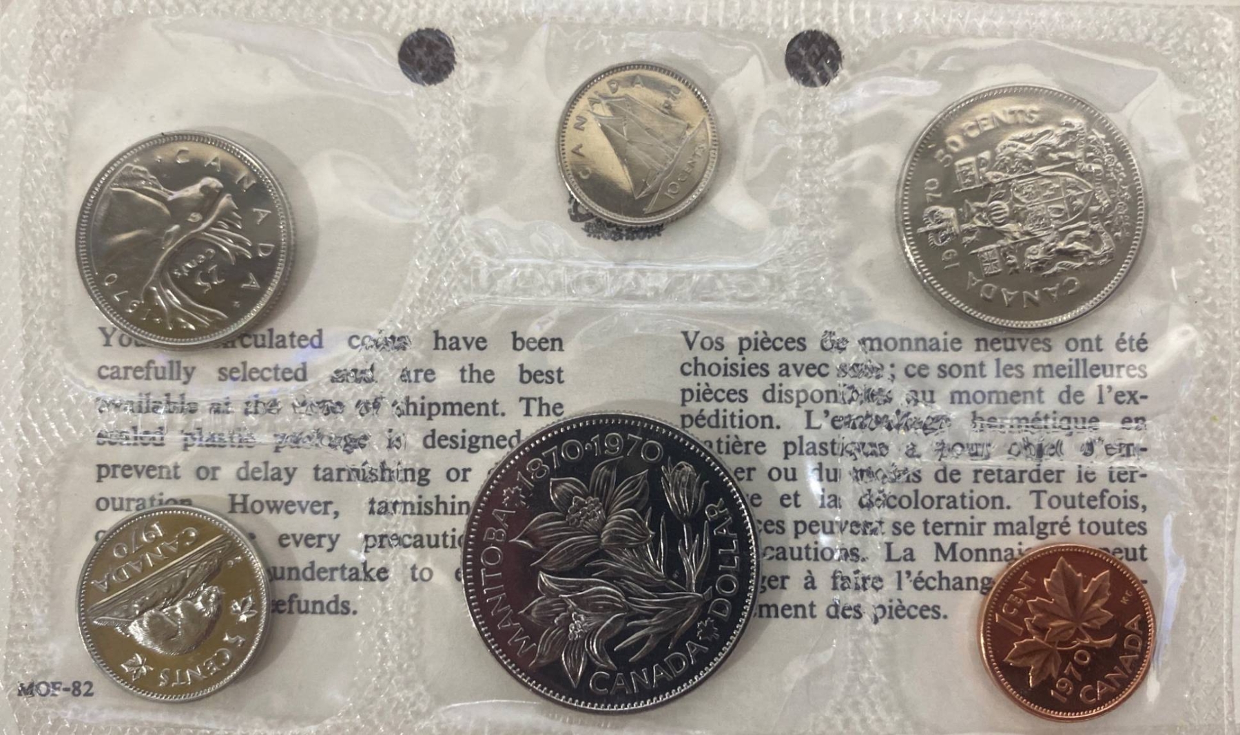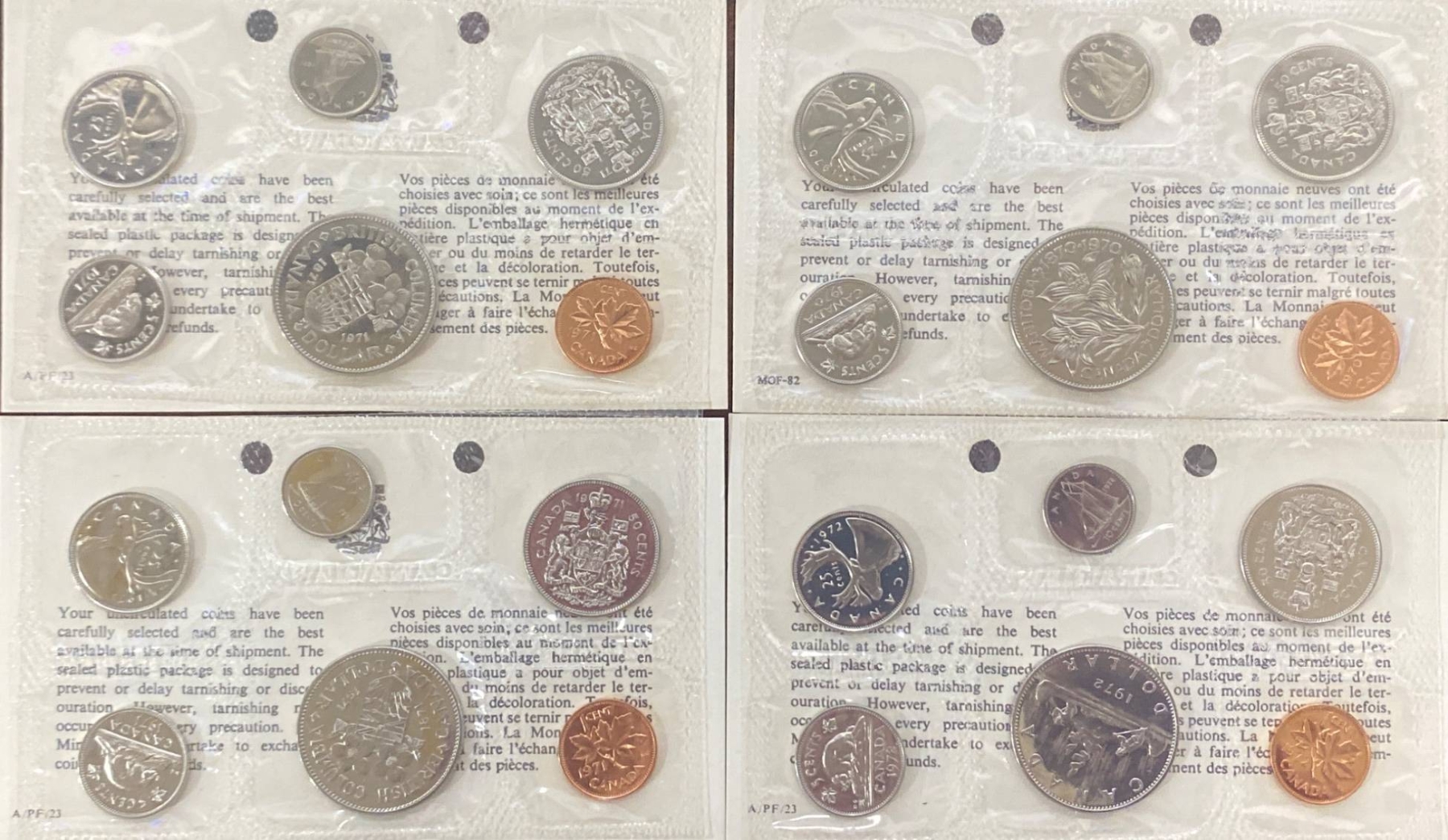 Four Royal Canadian Mint proof-like coin sets from the 1970s. Each set contains six coins sealed in original packaging, including one cent to special edition one-dollar coins. Highlights include commemorative dollars such as British Columbia (1971), Manitoba (1970), and 1972 issue designs. Coins are preserved in excellent condition alongside the accompanying descriptive cardbacks.