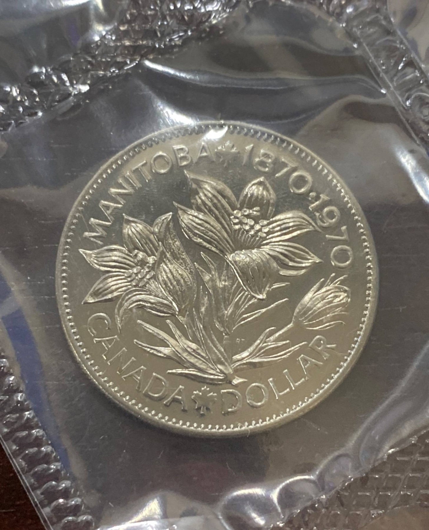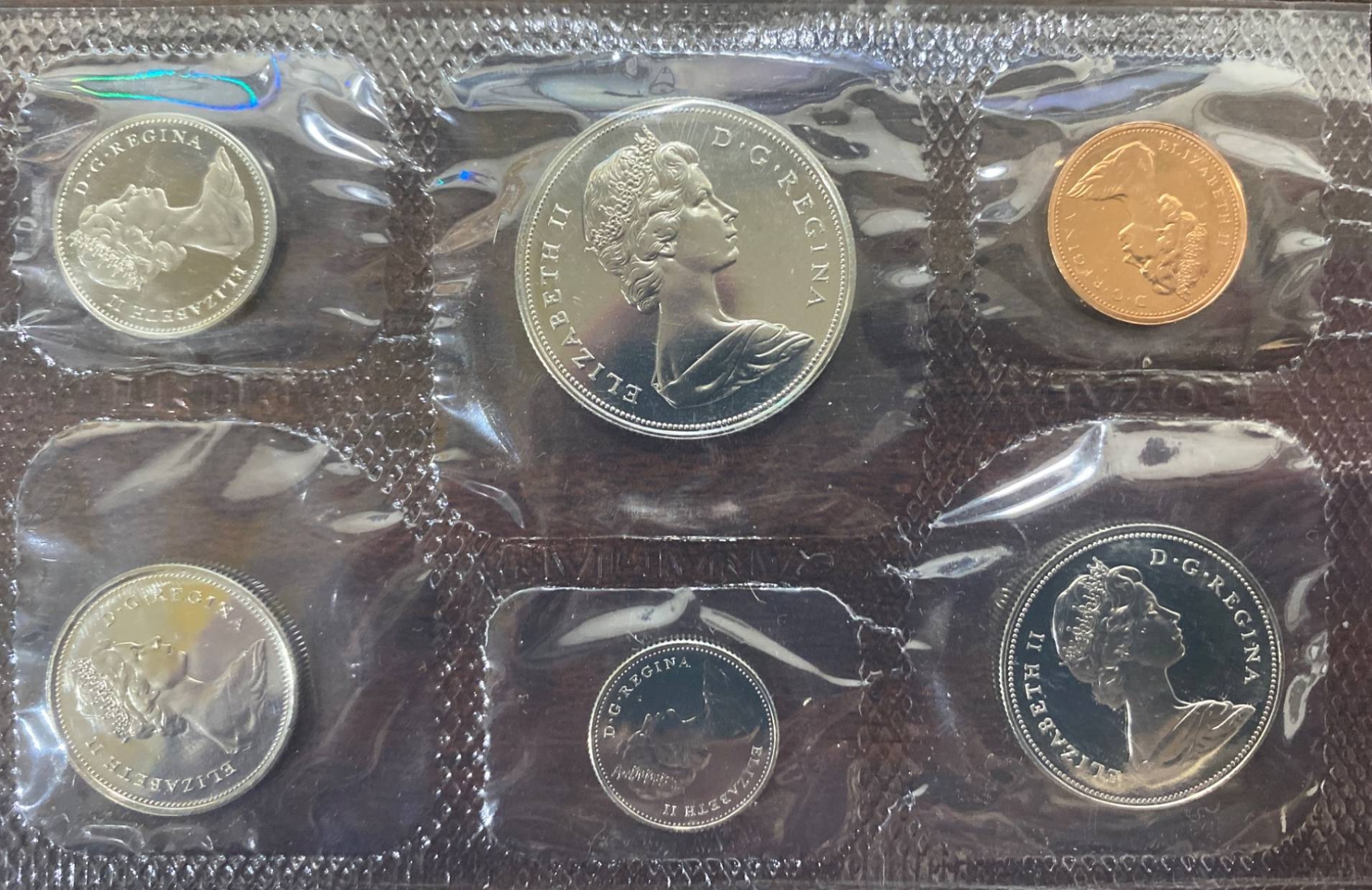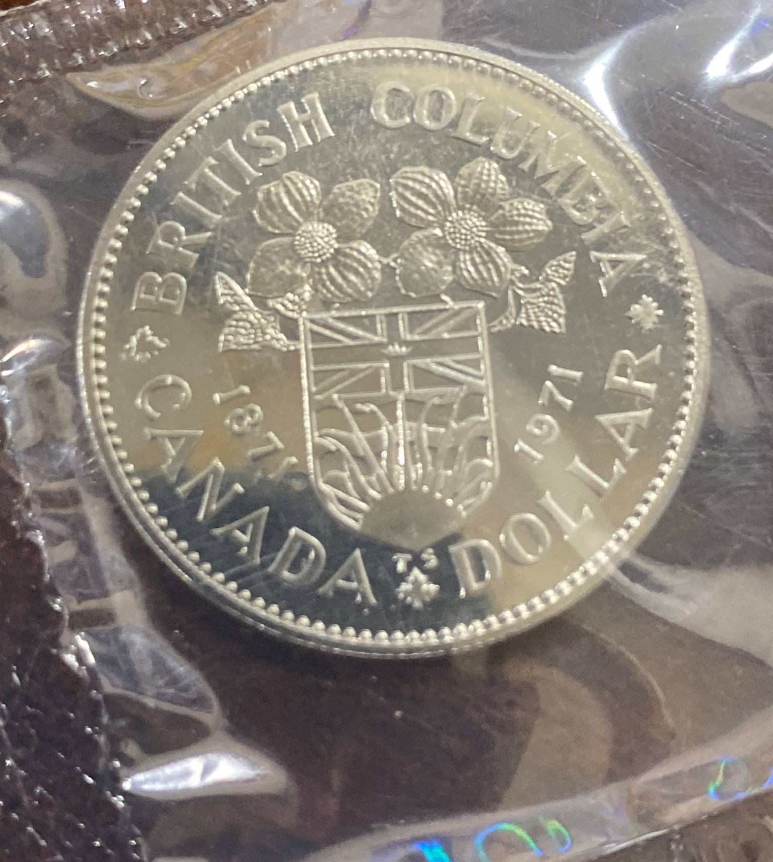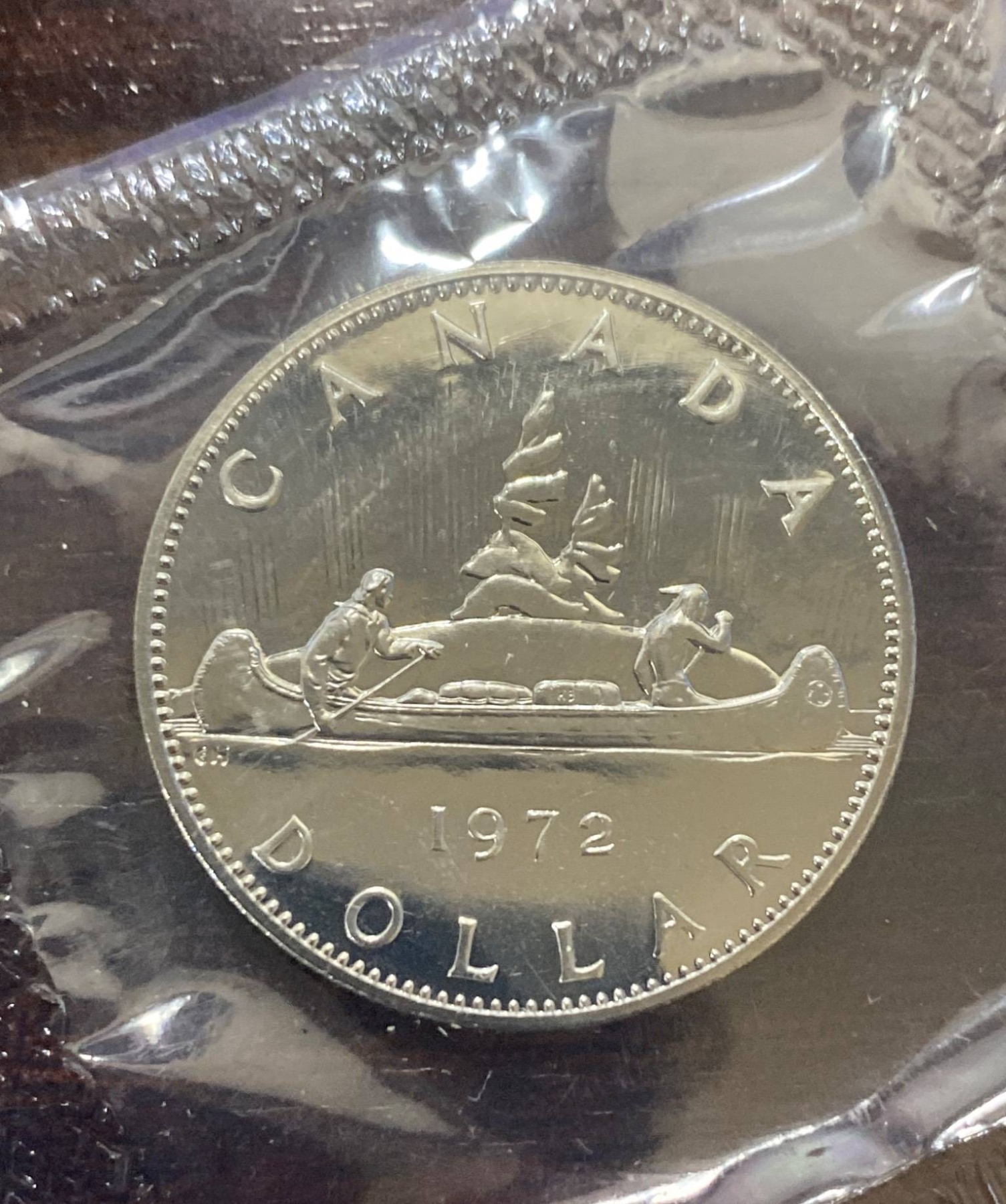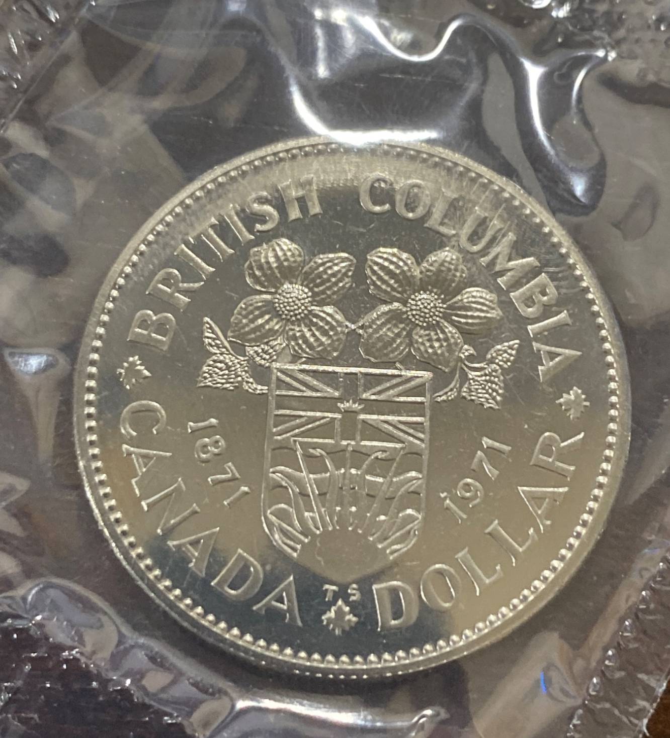Four Royal Canadian Mint proof-like coin sets from the 1970s. Each set contains six coins sealed in original packaging, including one cent to special edition one-dollar coins. Highlights include commemorative dollars such as British Columbia (1971), Manitoba (1970), and 1972 issue designs. Coins are preserved in excellent condition alongside the accompanying descriptive cardbacks.