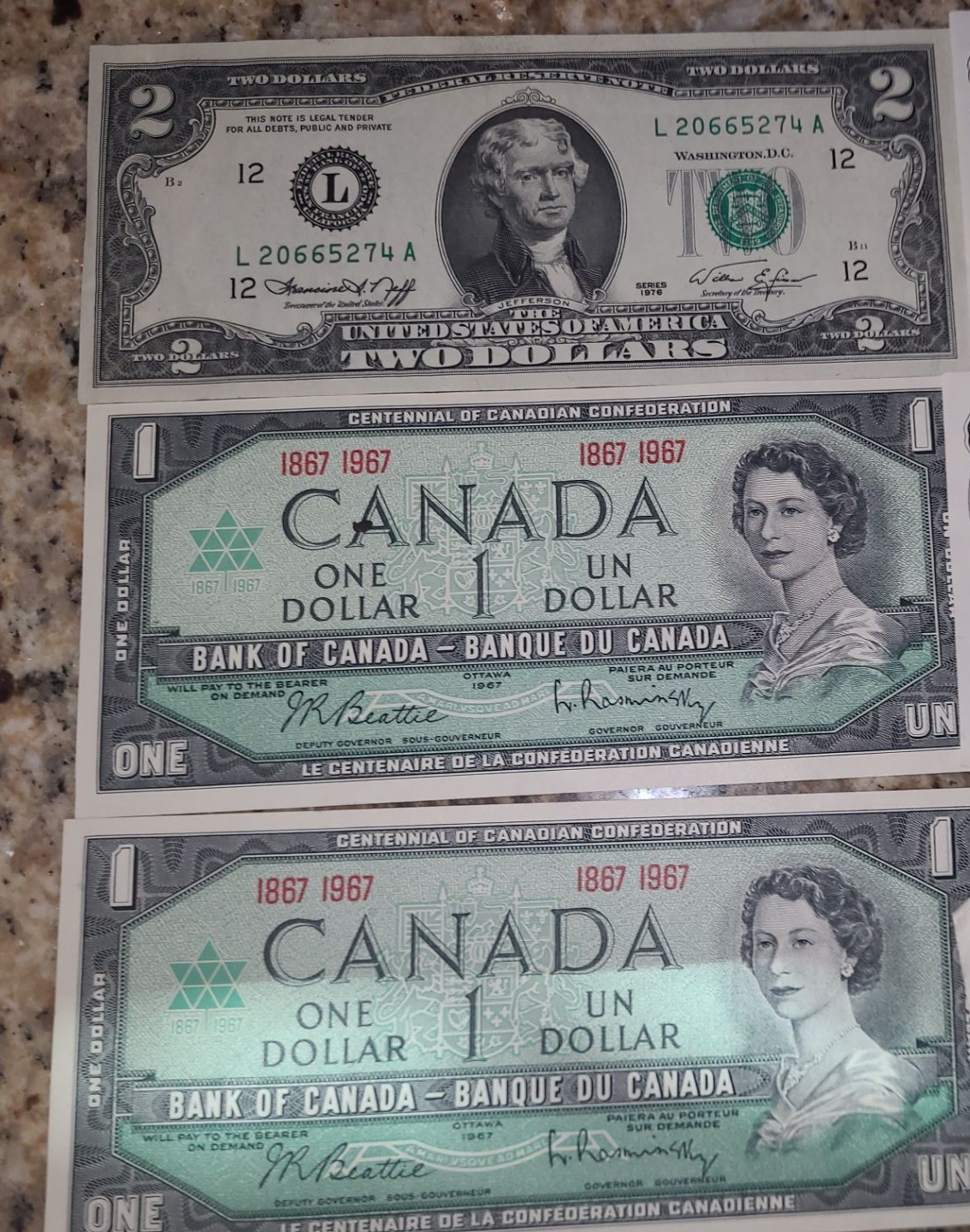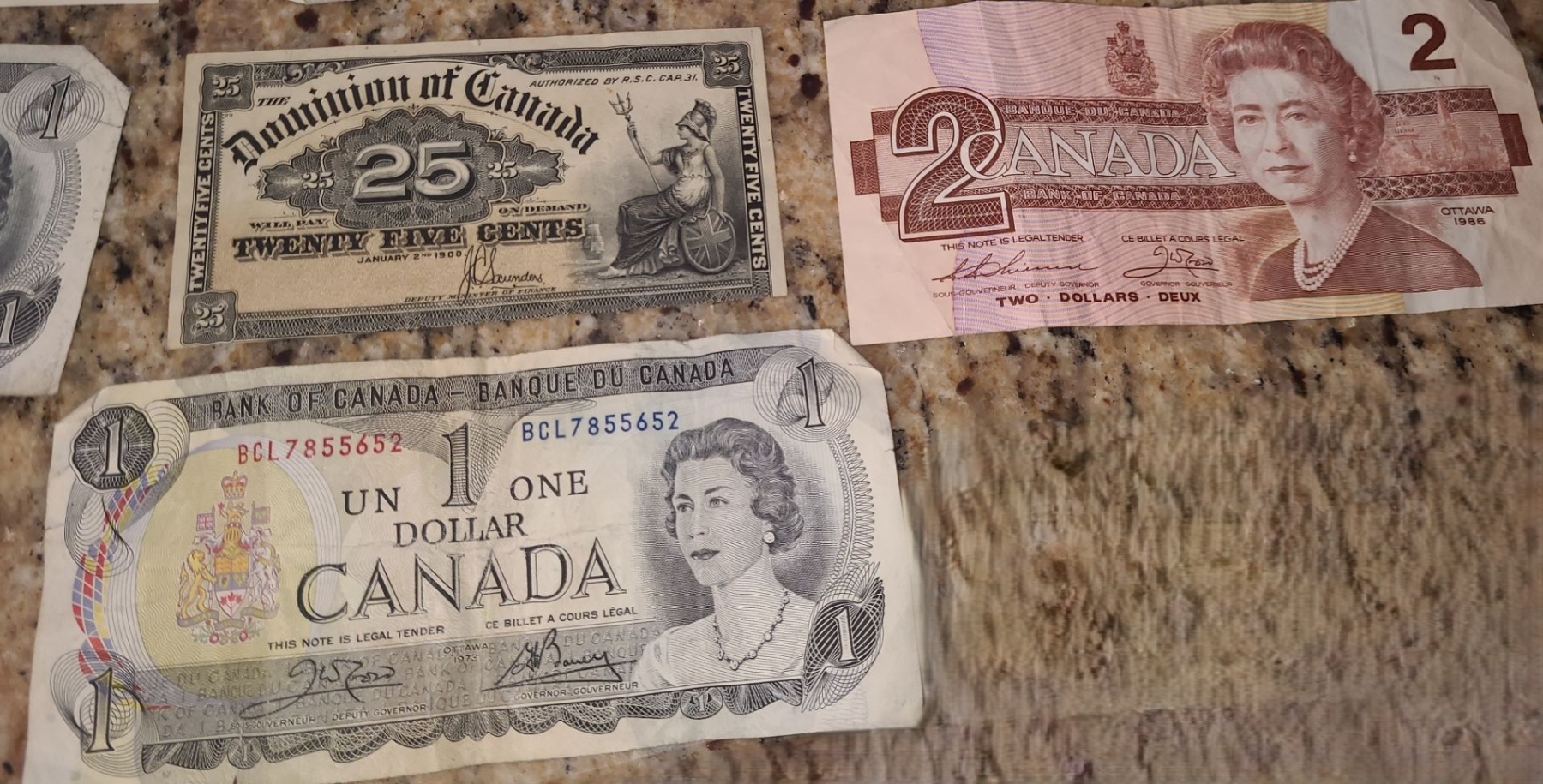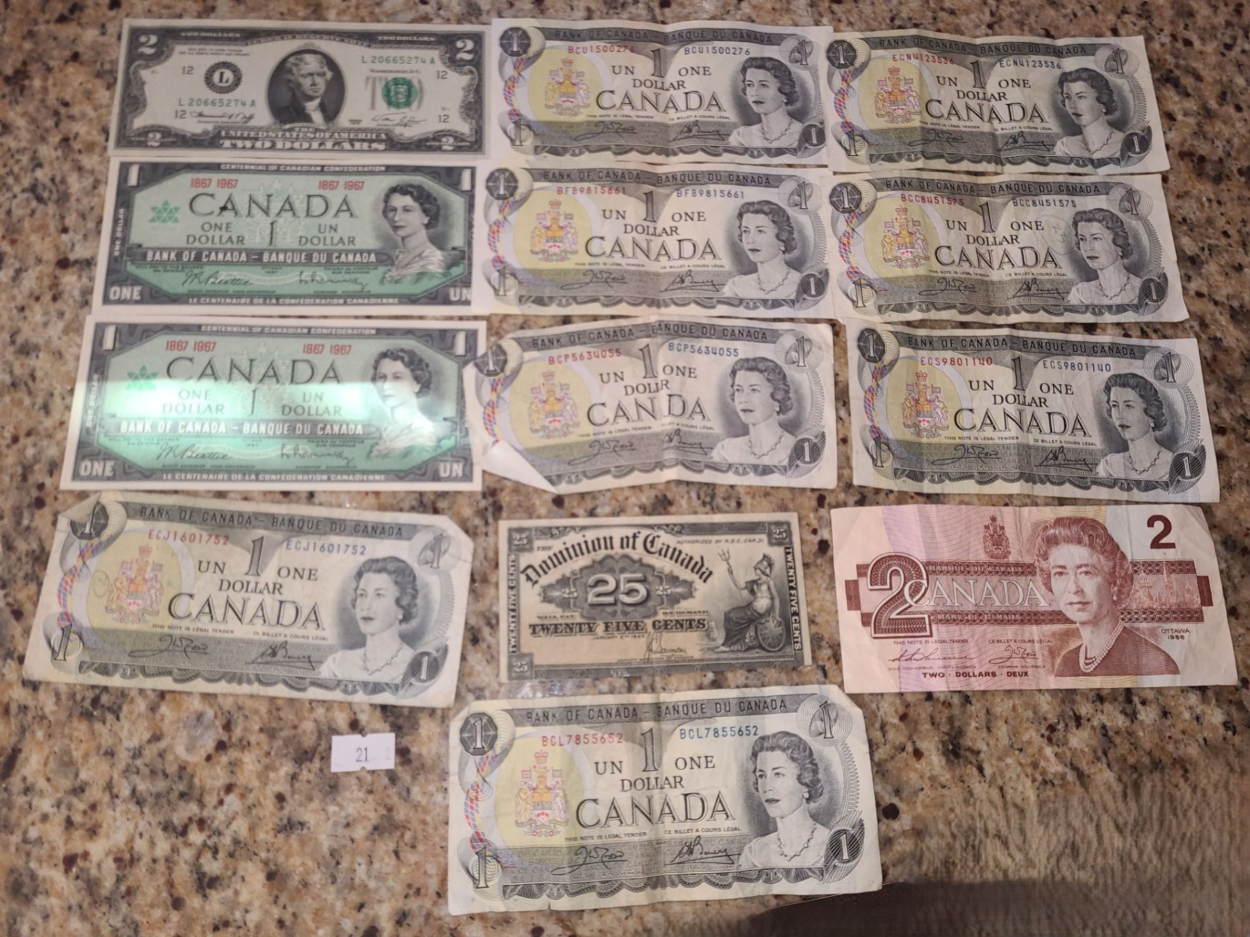 Canadian One Dollar X 10, American Two Dollar, Canadian Two Dollar, Dominion of Canada 25 Cents