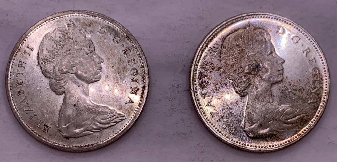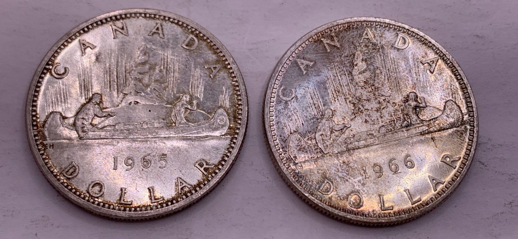 Canadian Silver Dollar 1966 (80% Pure Ag) 23.5 g & Canadian Silver Dollar 1965 23.4 g (80% Pure Ag)