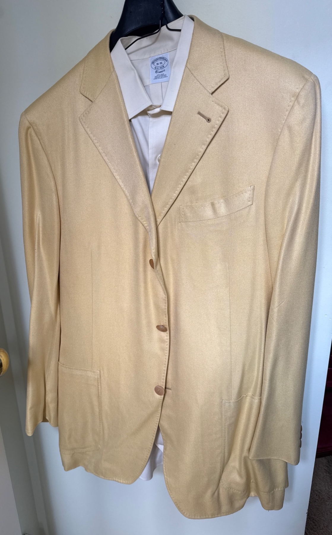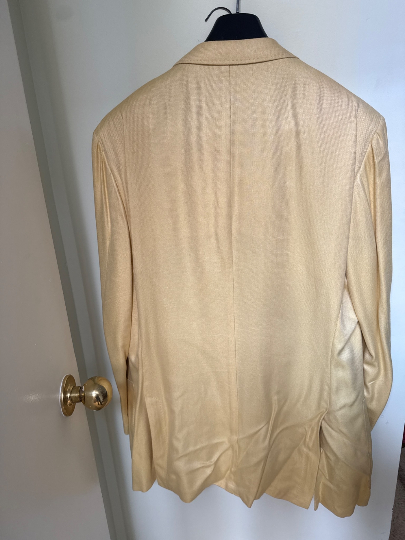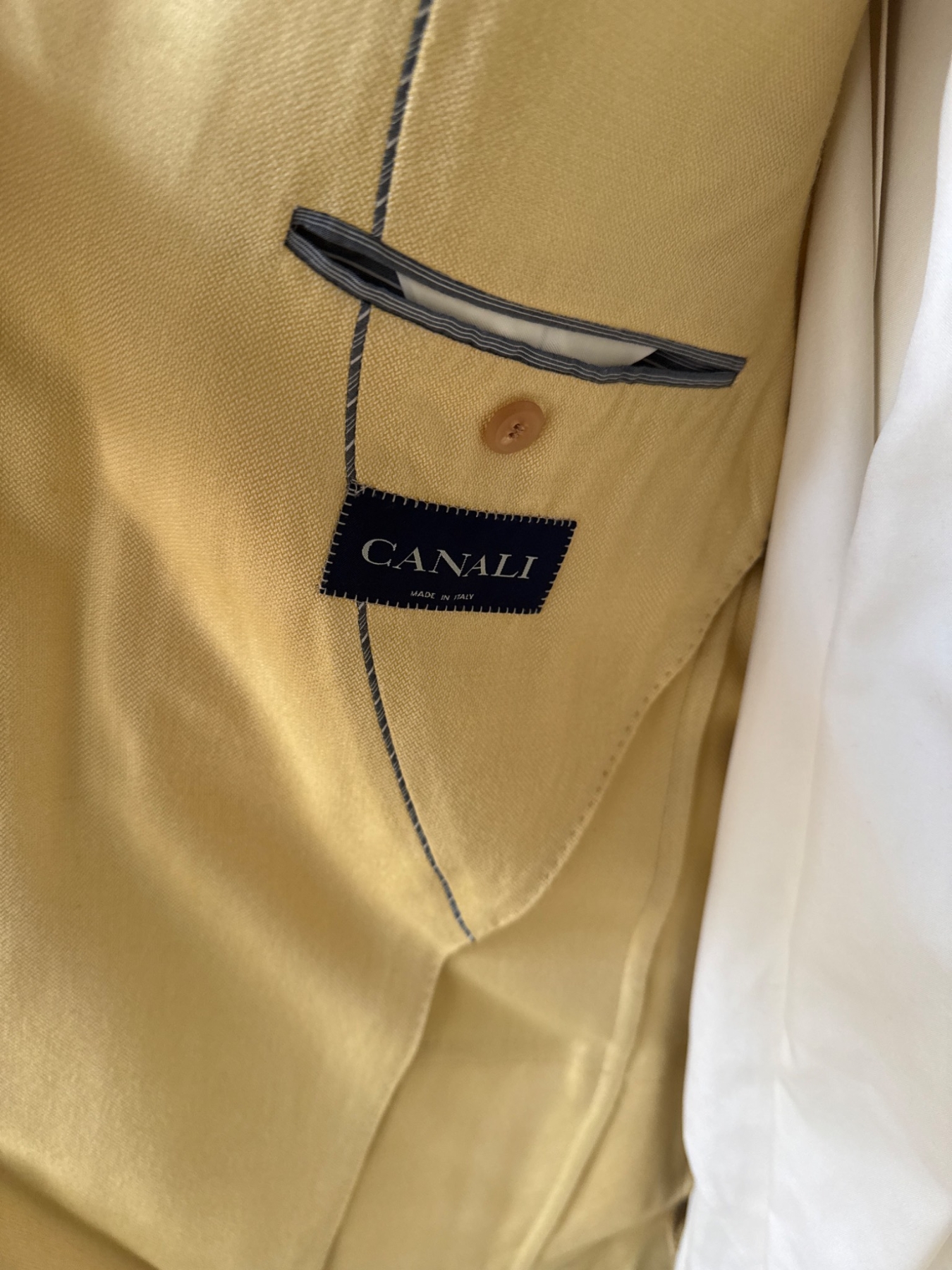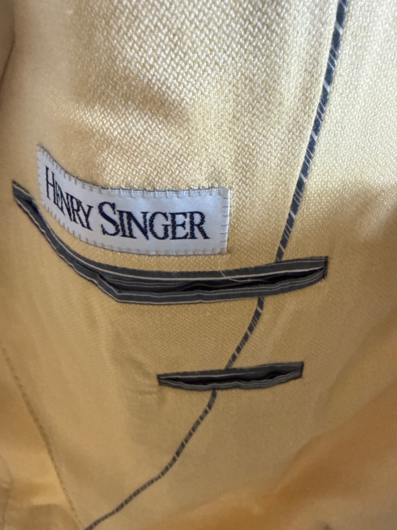 Sophisticated Canali blazer designed exclusively for Henry Singer. Crafted in a striking yellow fabric, this stylish jacket features a notch lapel, three-button front closure, a chest pocket, and two front pockets. Sized as 42 Tall, it is tailored for a taller frame. Excellent craftsmanship with a fully lined interior. A refined piece that adds an elegant flair to formal or semi-formal attire.