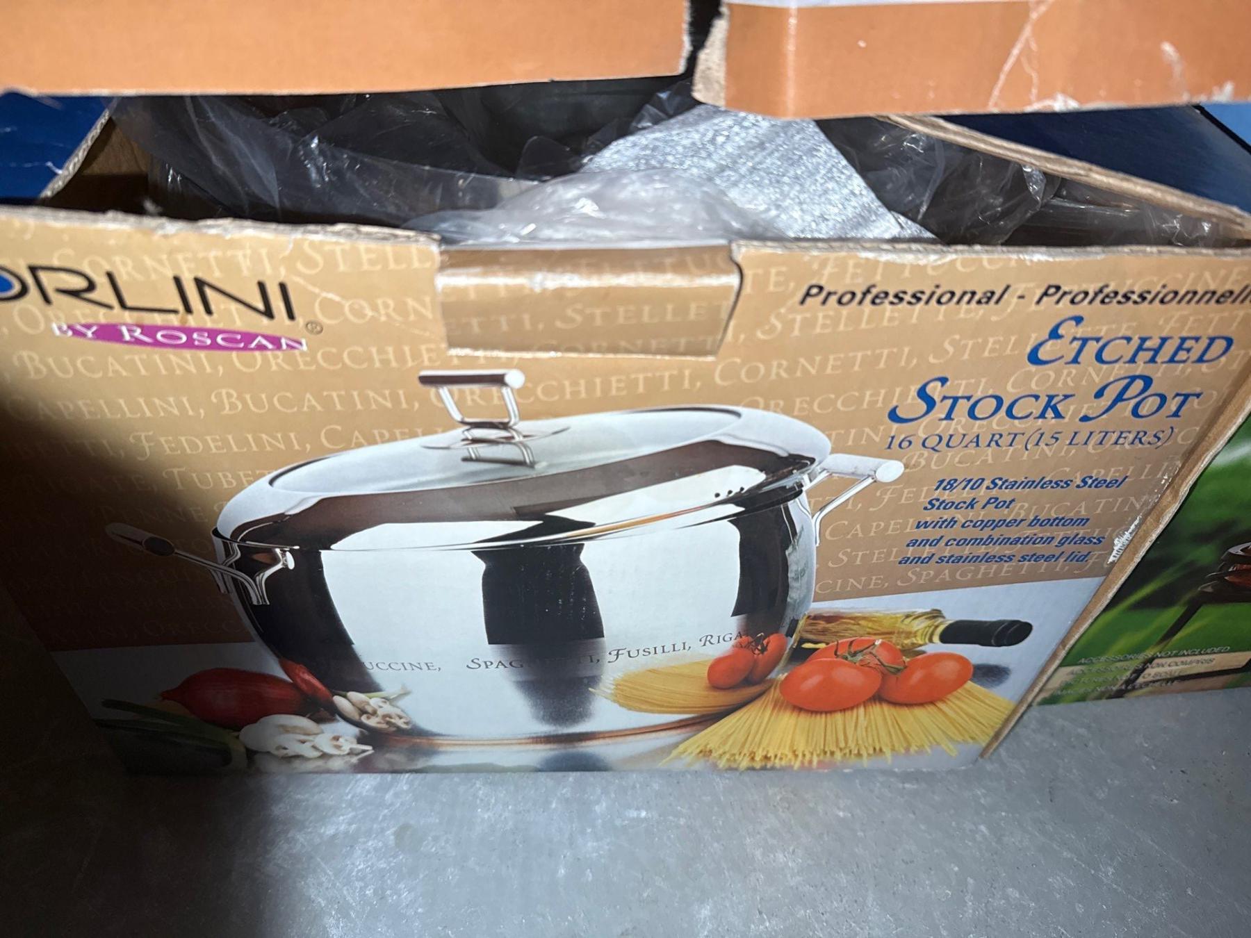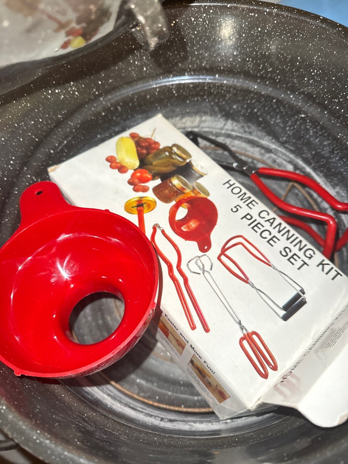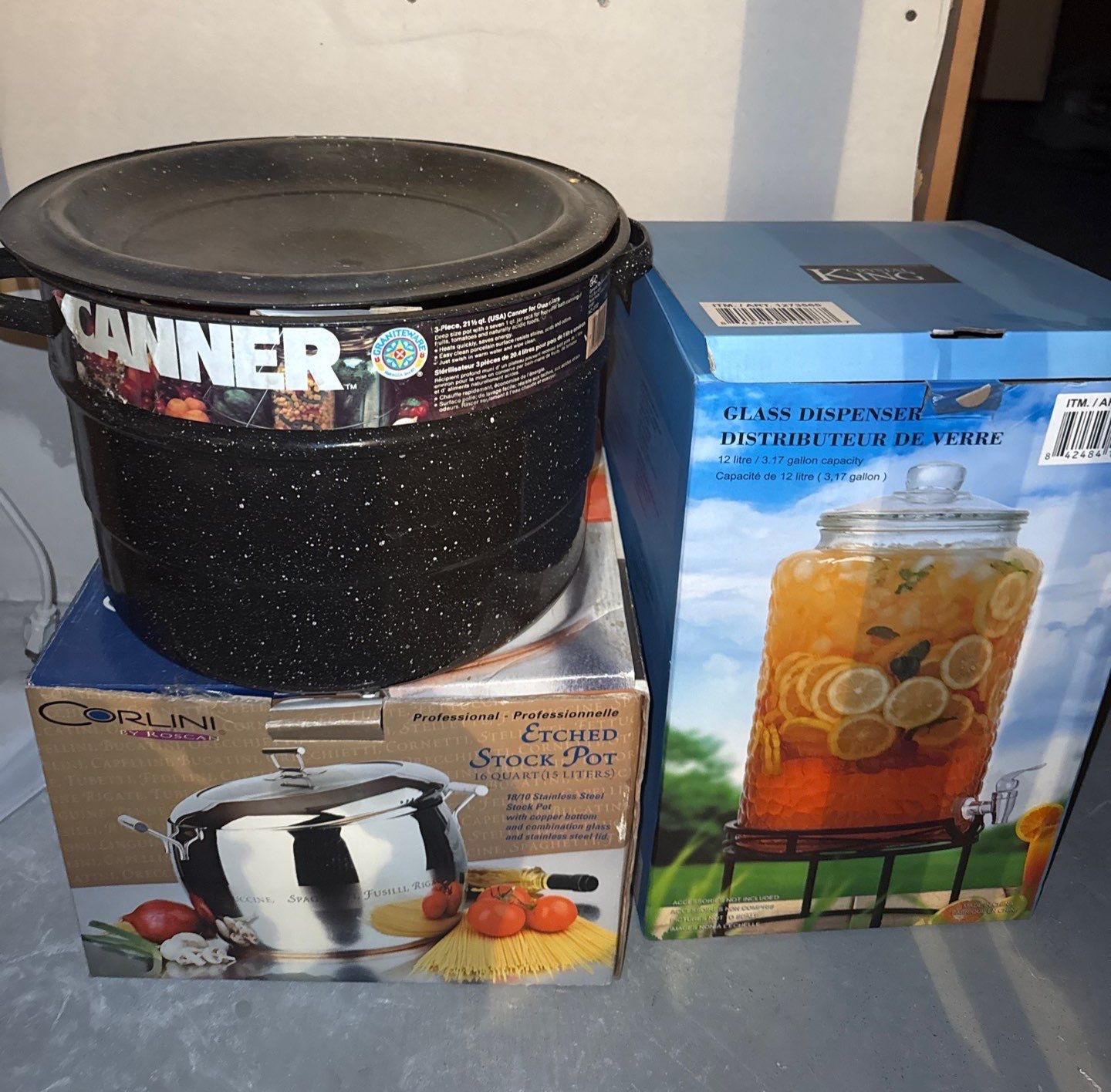 Canner Large Pot w/ Tools, Glass Dispenser In Box, Etched Stock Pot In Box
