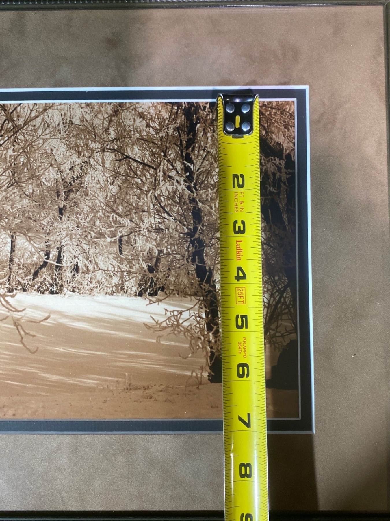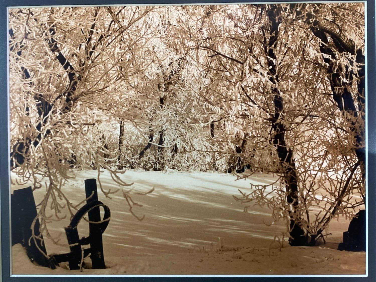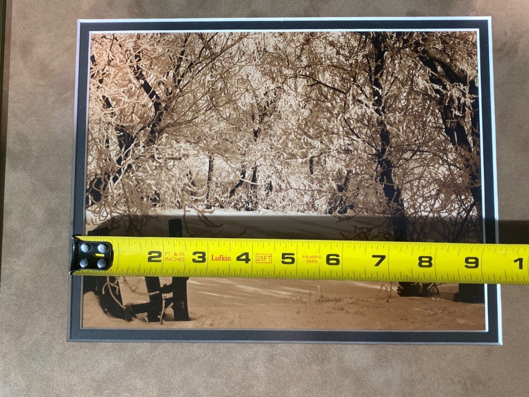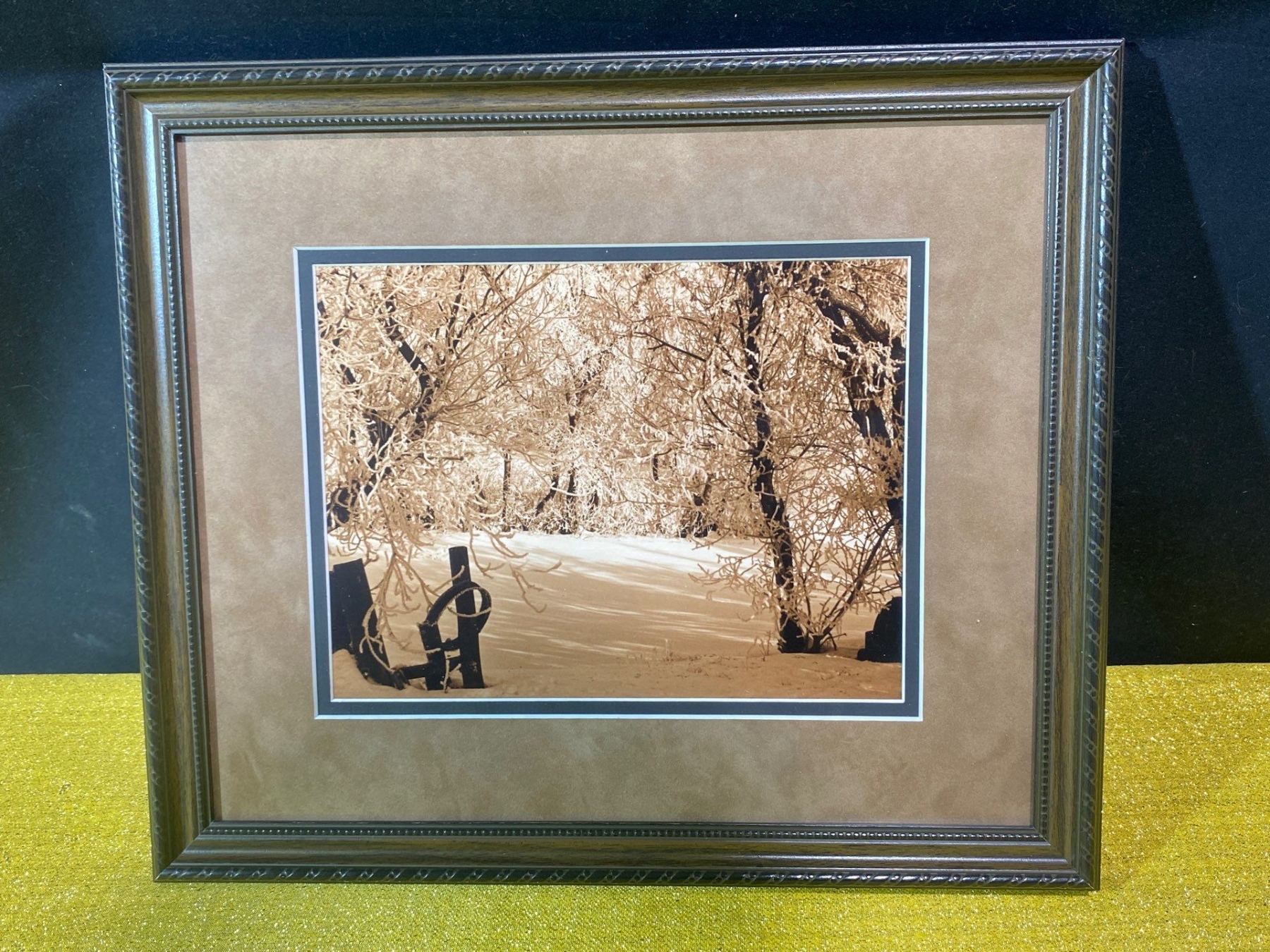 This framed photo print captures a serene winter landscape, with bare trees dusted in snow stretching across a tranquil scene. The composition emphasizes the stark beauty and quiet stillness of the season, creating a peaceful, evocative image. Ideal for collectors of nature photography or those seeking elegant, seasonal décor.