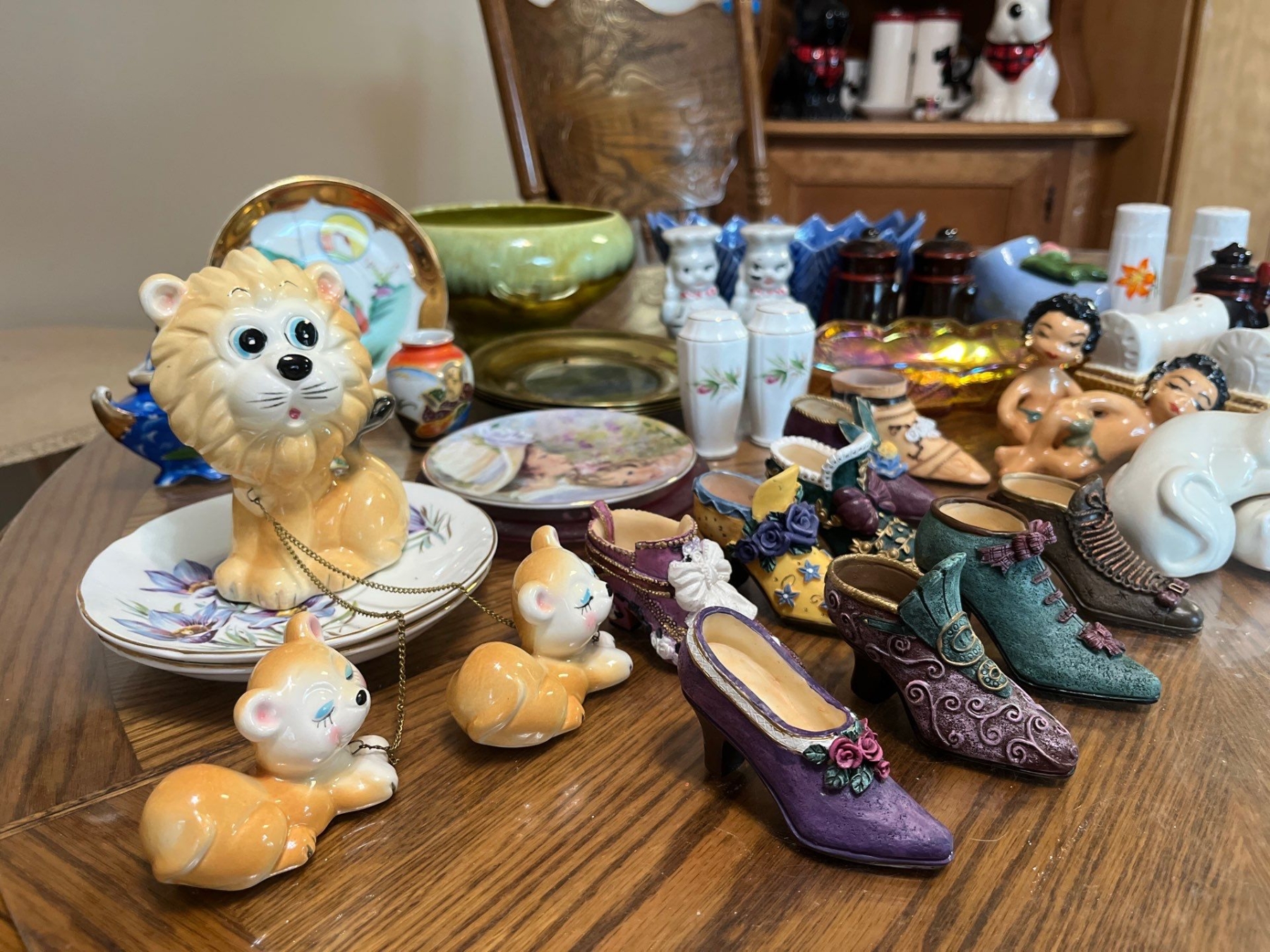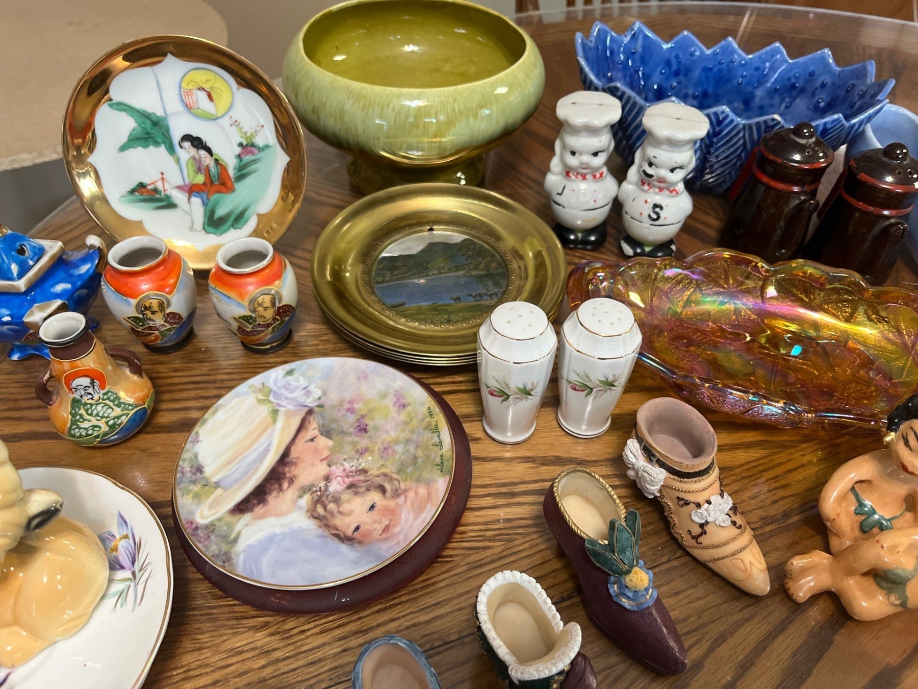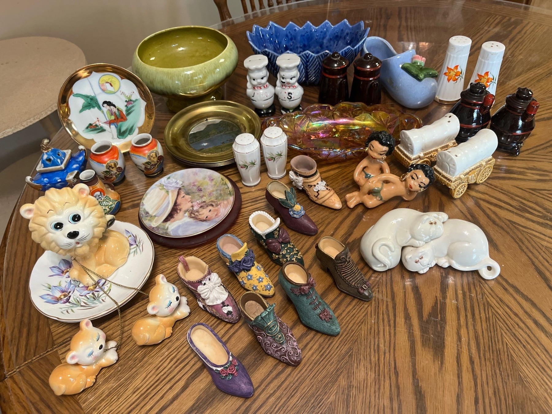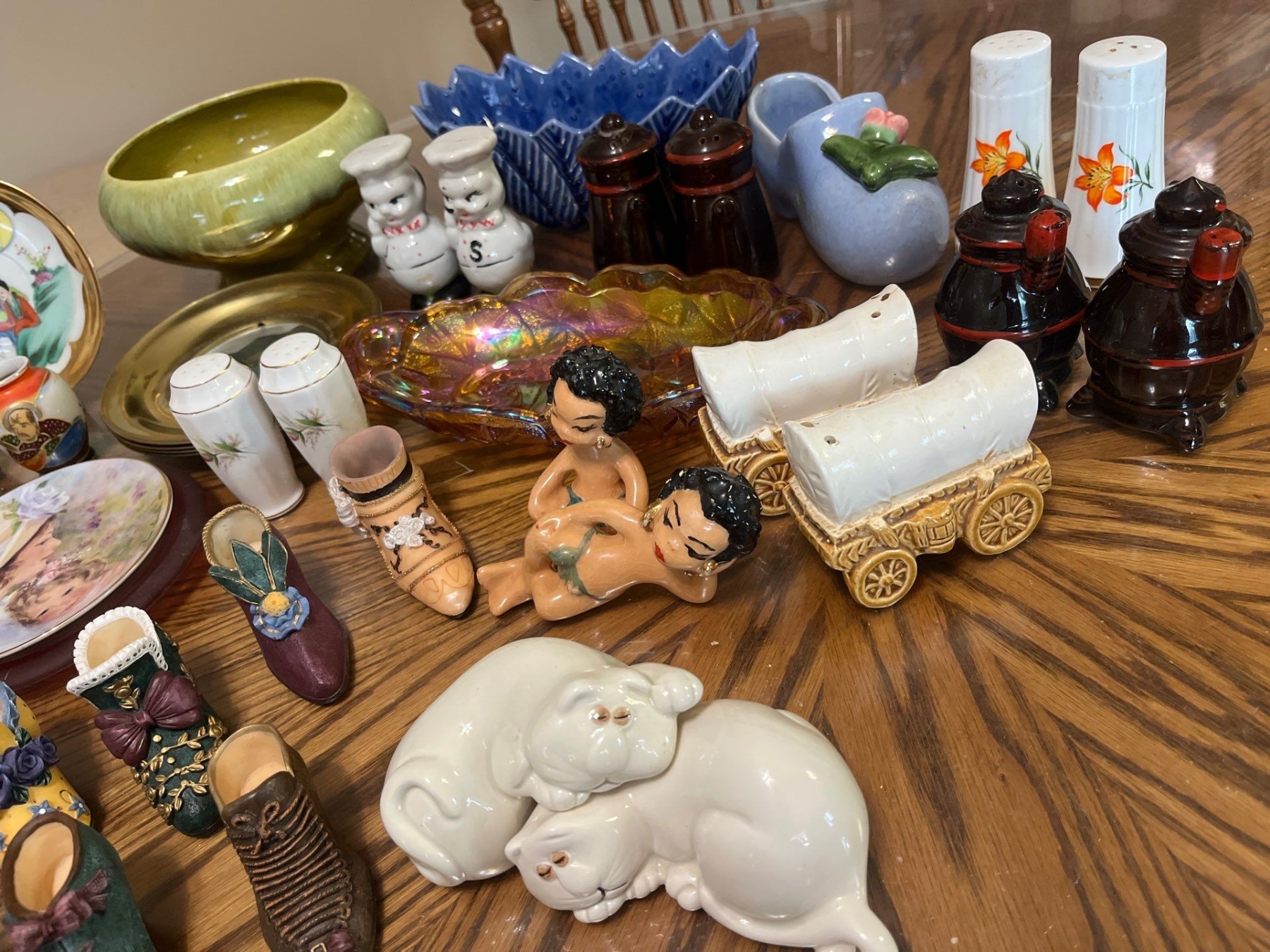 Carnival glass, serving dish, several sets of vintage and retro salt and pepper shakers, and a small decorative shoe collection