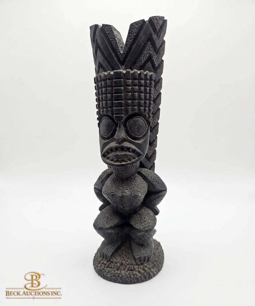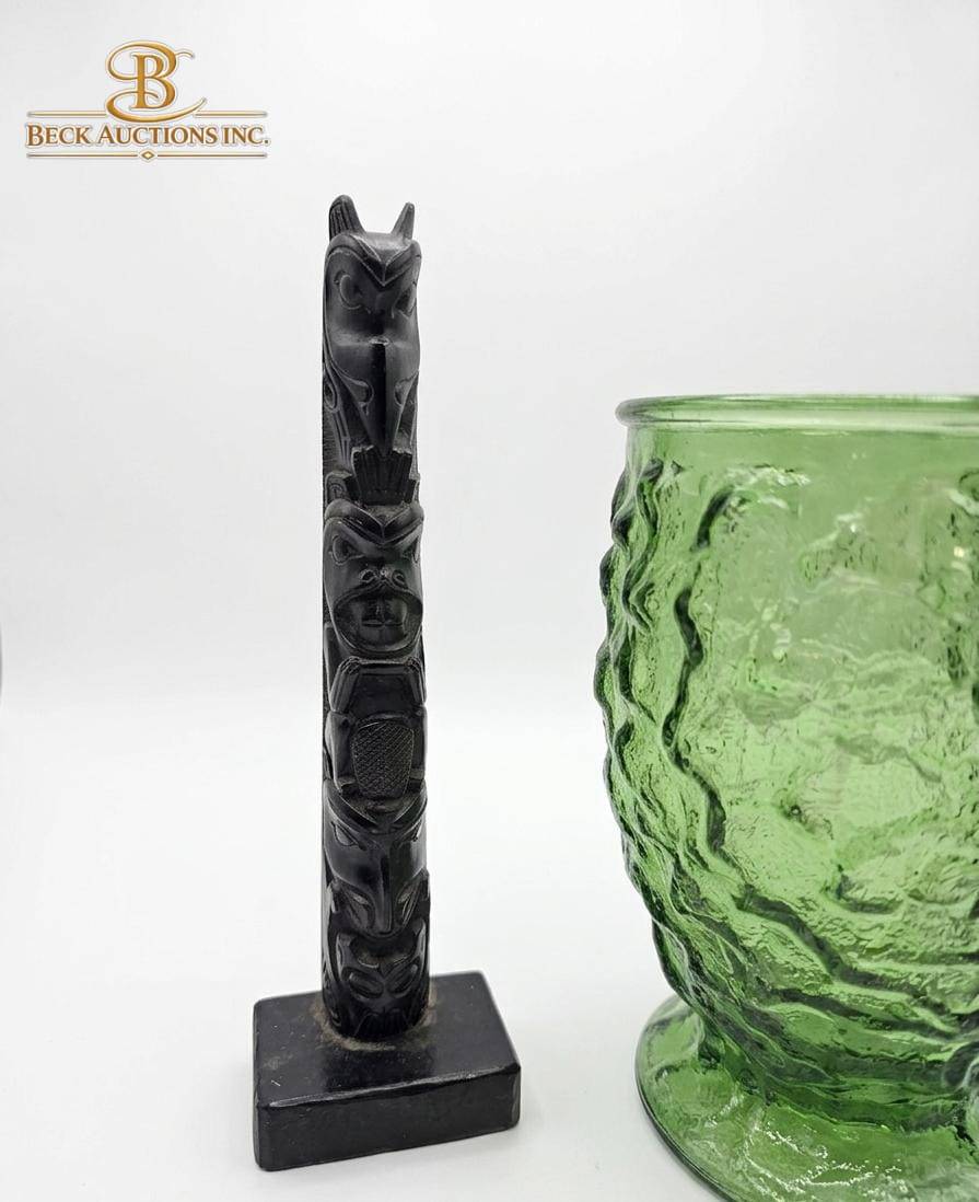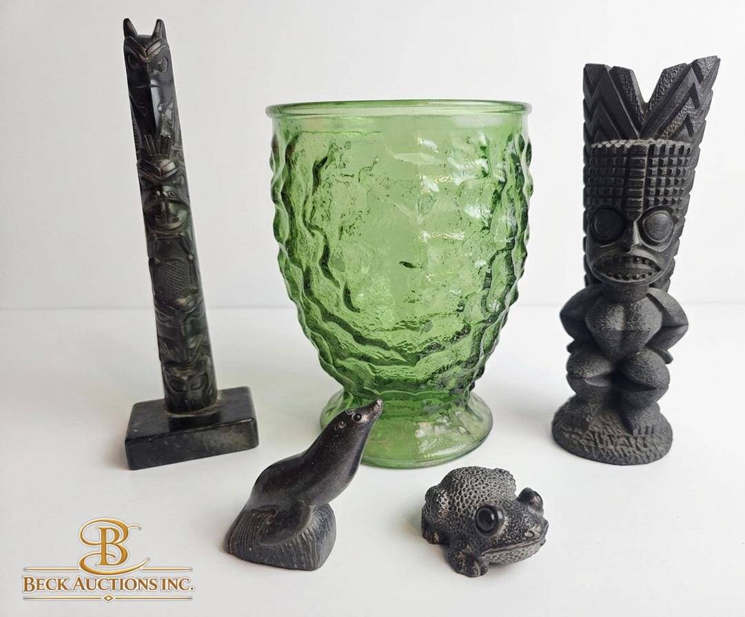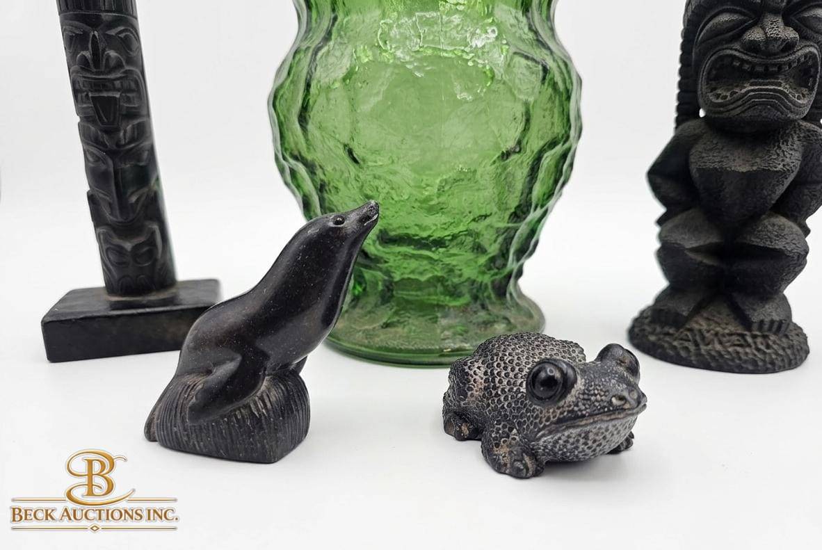 This lot features a unique assortment including four carved figurines and a textured green glass vase. The figurines showcase cultural and fauna artistry with materials like stone or similar materials, featuring a tiki design (8 inches tall) and seal carvings. The green vase, measuring 9 inches tall, is detailed with a textured finish, ideal for decor or collection.