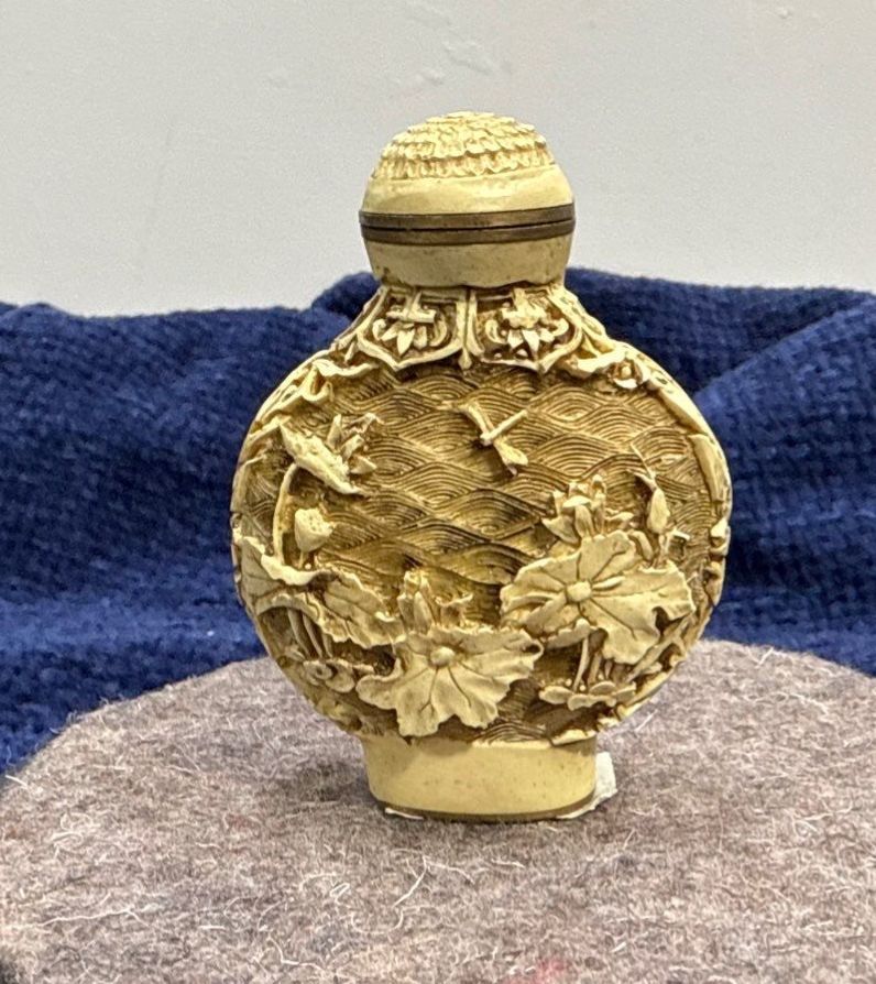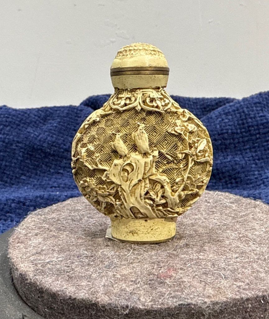 Carved Floral Snuff Bottle with Spoon  2.5H