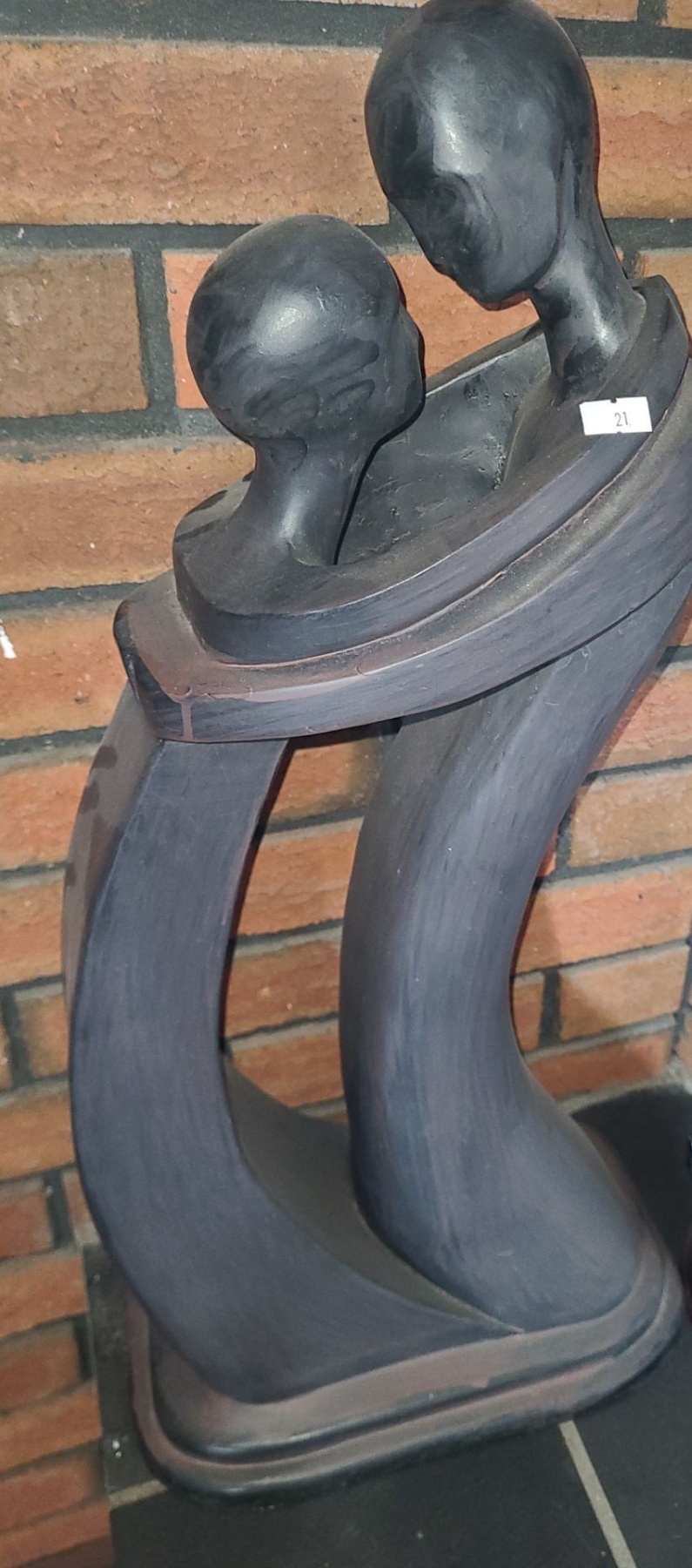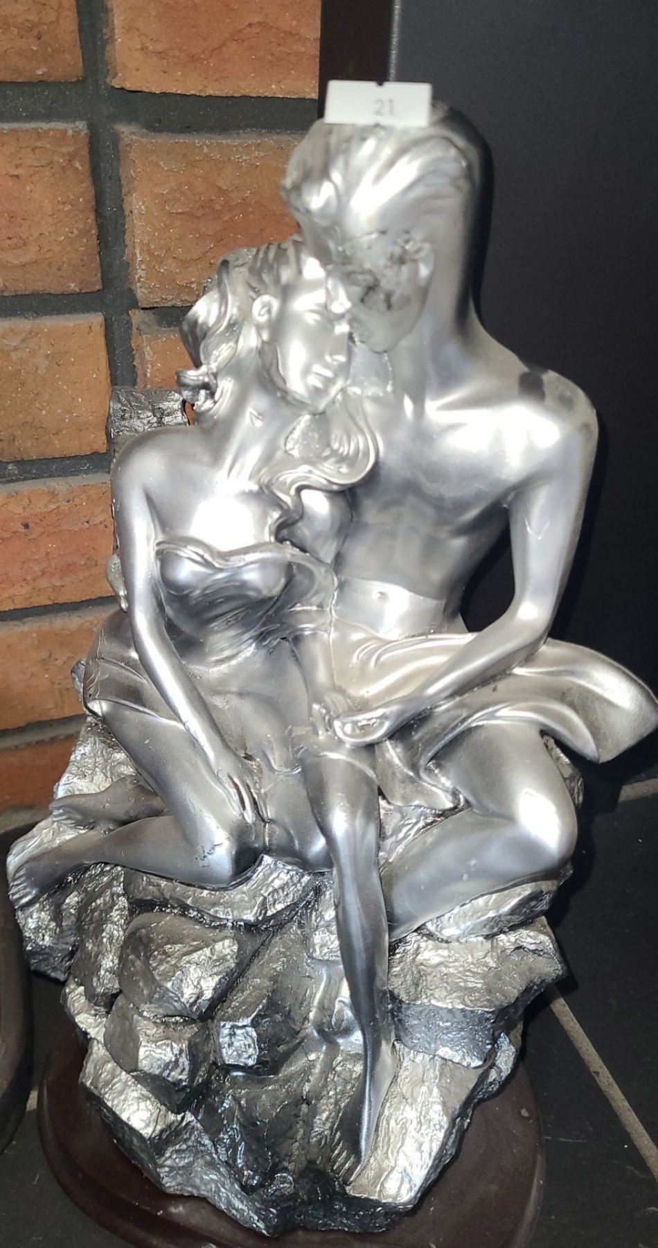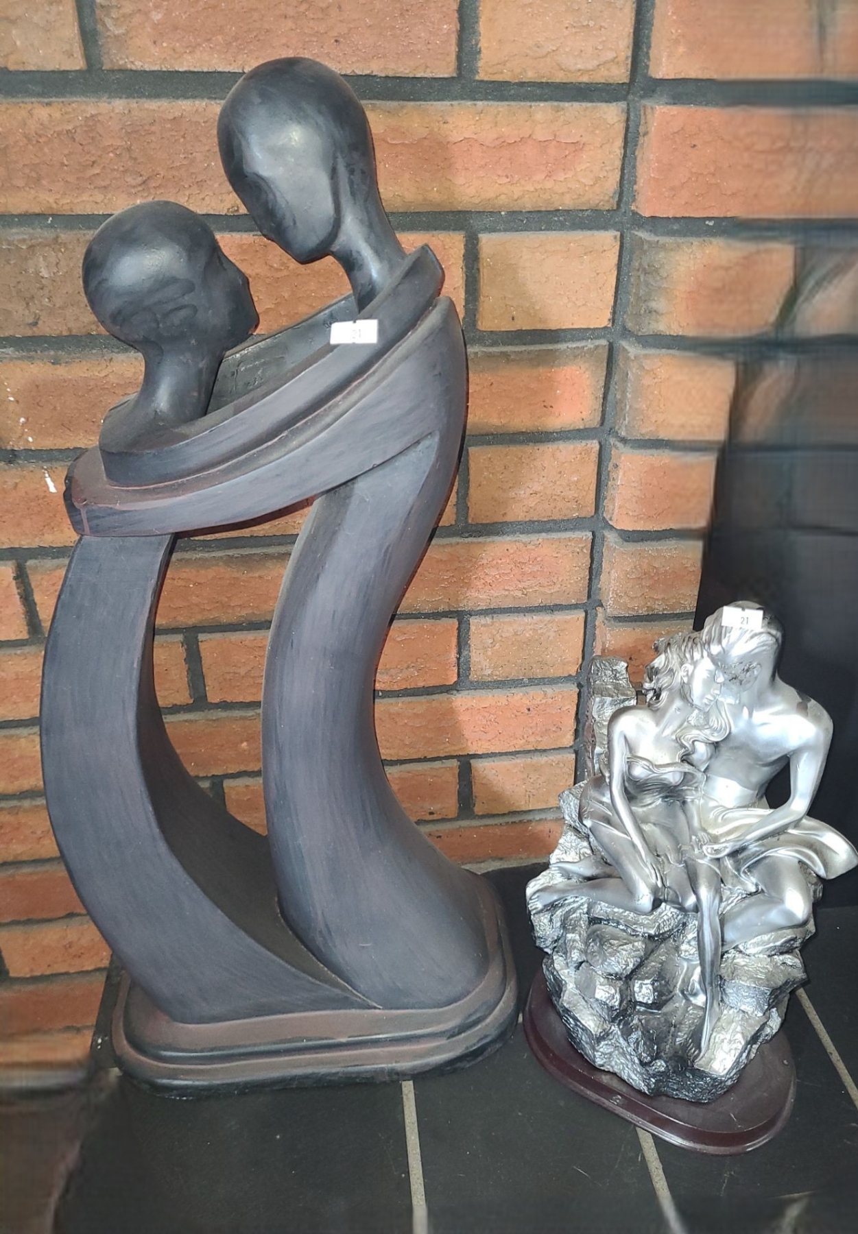Carved Statue of Embracing Couple 11 W, 7 D, 25 T and Silver Painted Statue 13 T