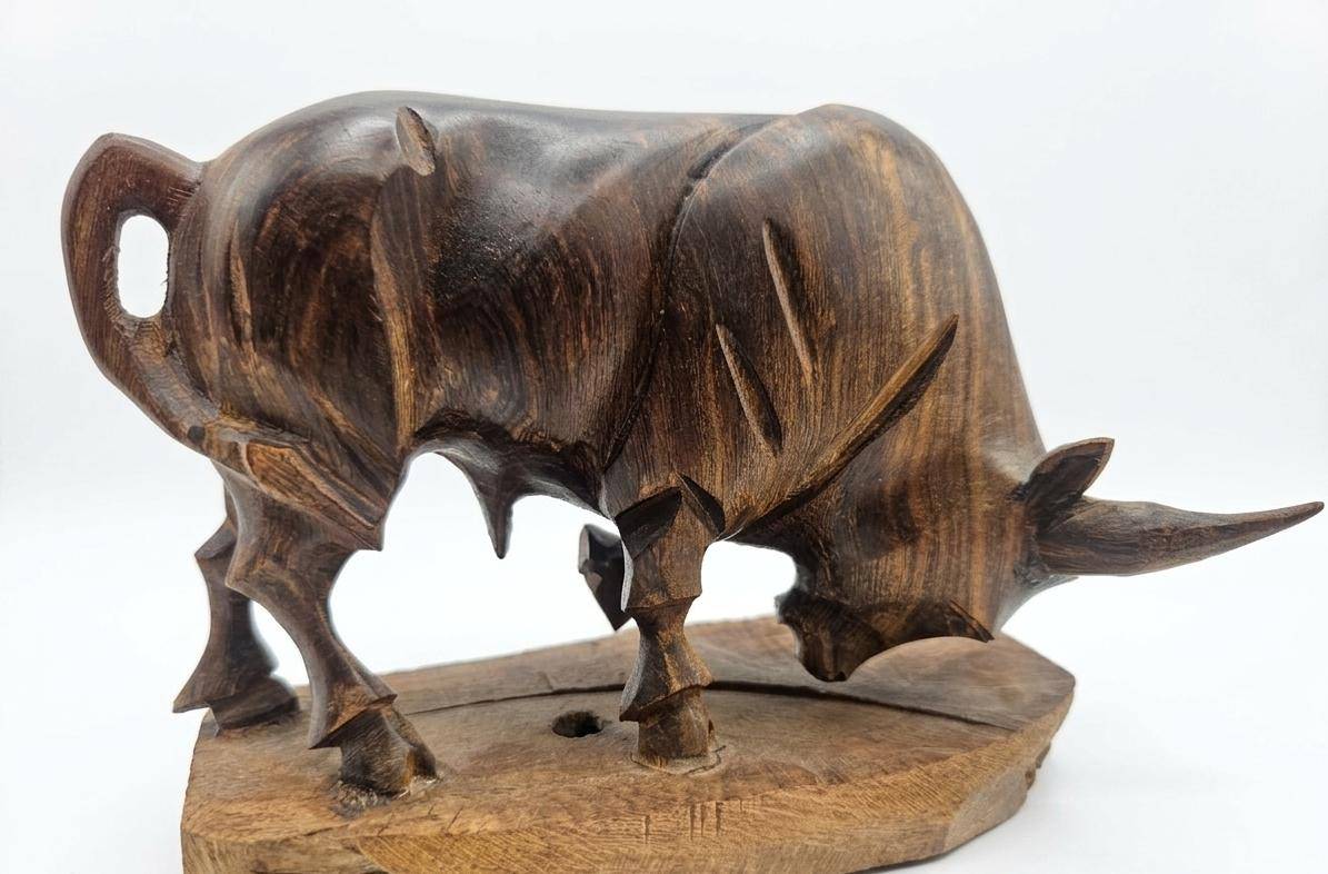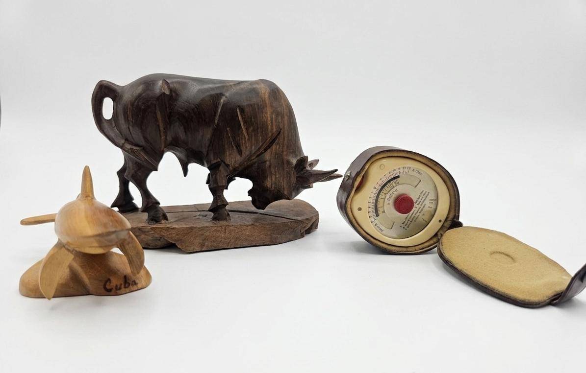 This lot features a carved wooden bull figurine paired with a built-in thermometer encased within a circular compartment at its base. The bull stands approximately 5 inches long and 3 inches tall, showcasing thoughtful craftsmanship in its details. This piece elegantly combines form and function, serving as both decor and a practical temperature gauge. A unique collectible.