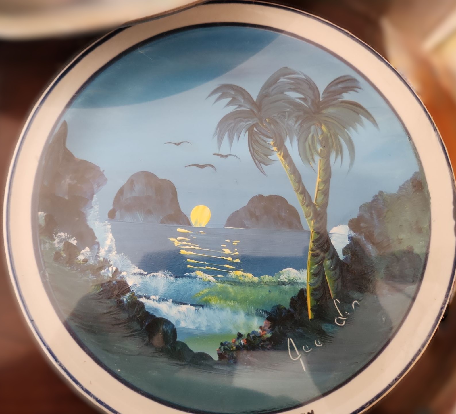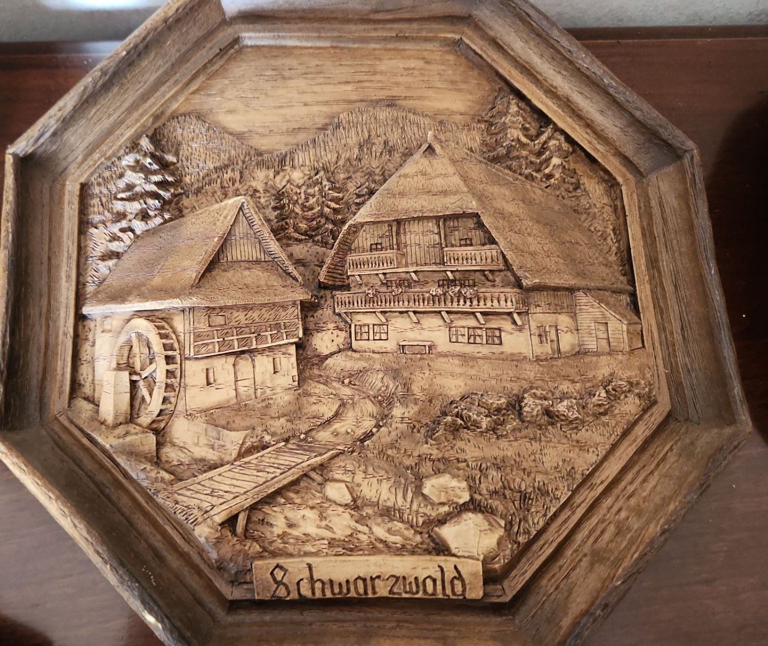 Carved Wooden Plates Largest 9  Diameter, Candle 11 T,  Painted Pan/Plate 12.5 and 8  Diameters