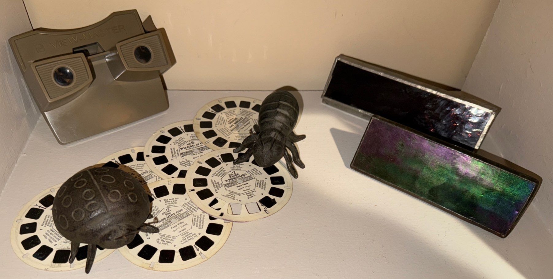Cast Iron Bugs, Stained Glass Pieces, & Veiw-Finder w/ Discs