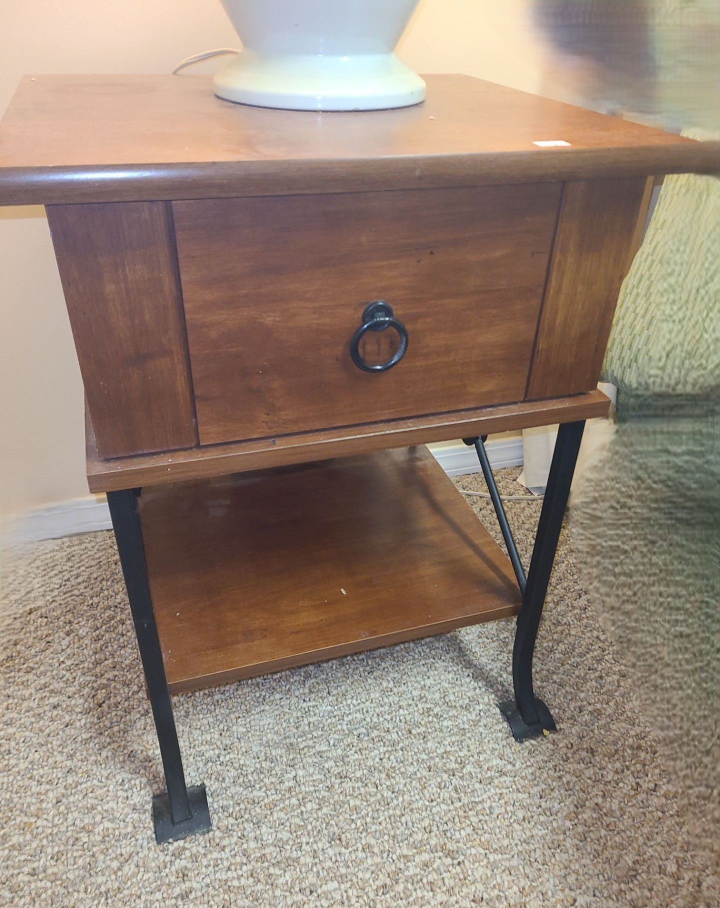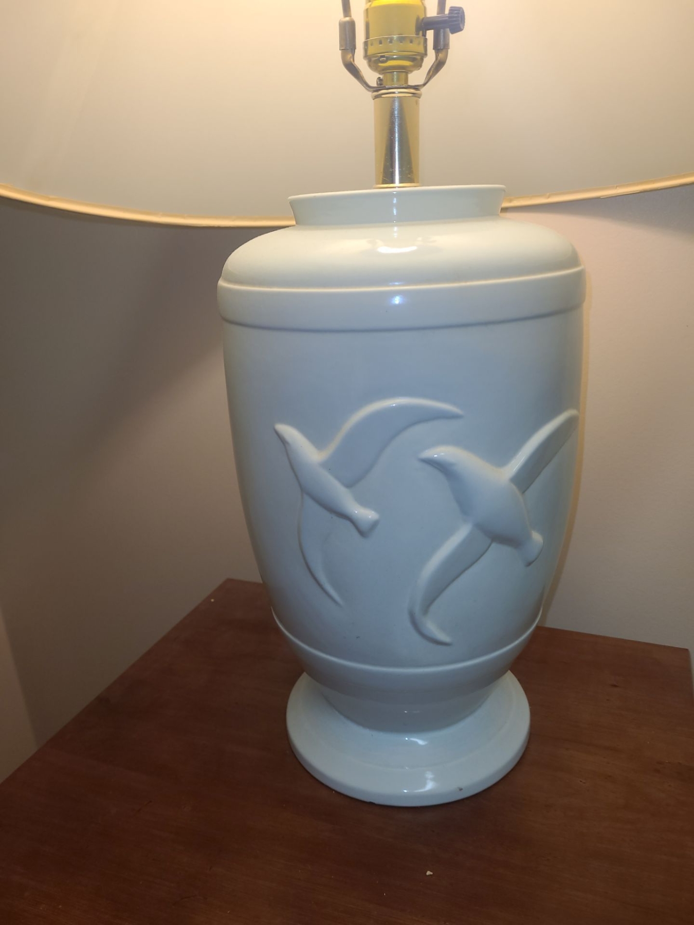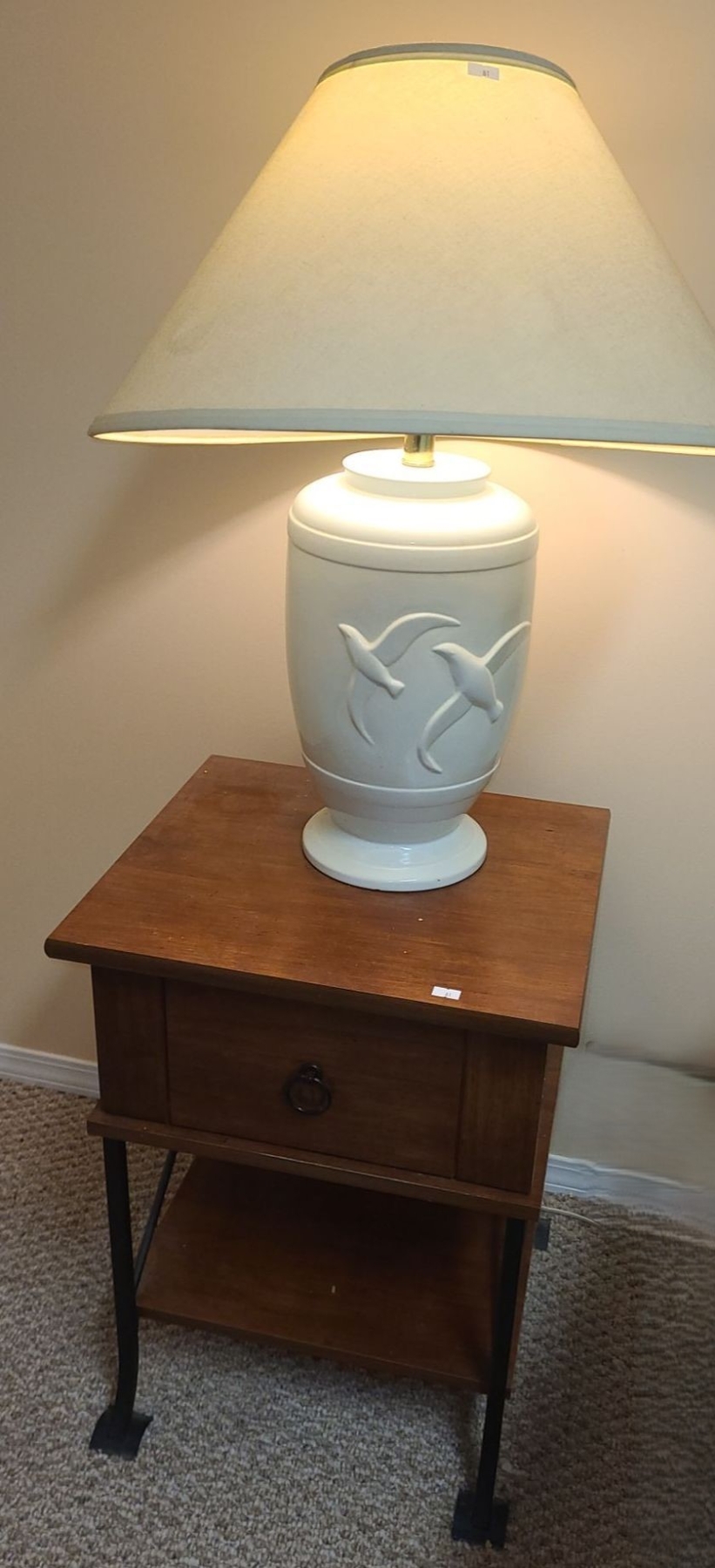 Ceramic Birds Lamp 27 T to Finial and Bed Side Table w/ Drawer and Shelf 18 W, 16 D, 23 T