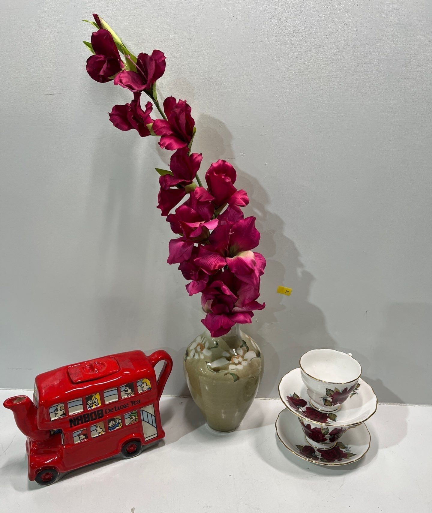 Ceramic Vase, Vintage Nabob Deluxe Bus Teapot and Teacup and Saucer Set
