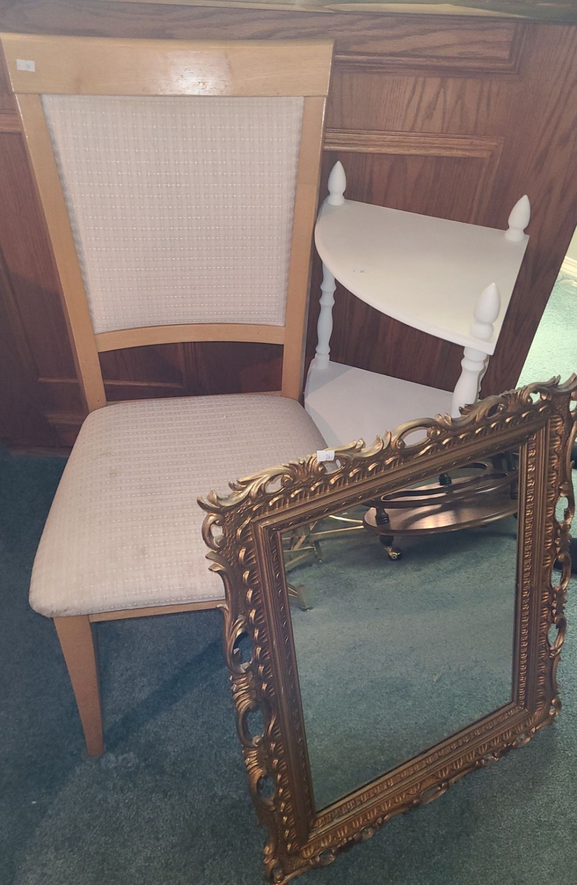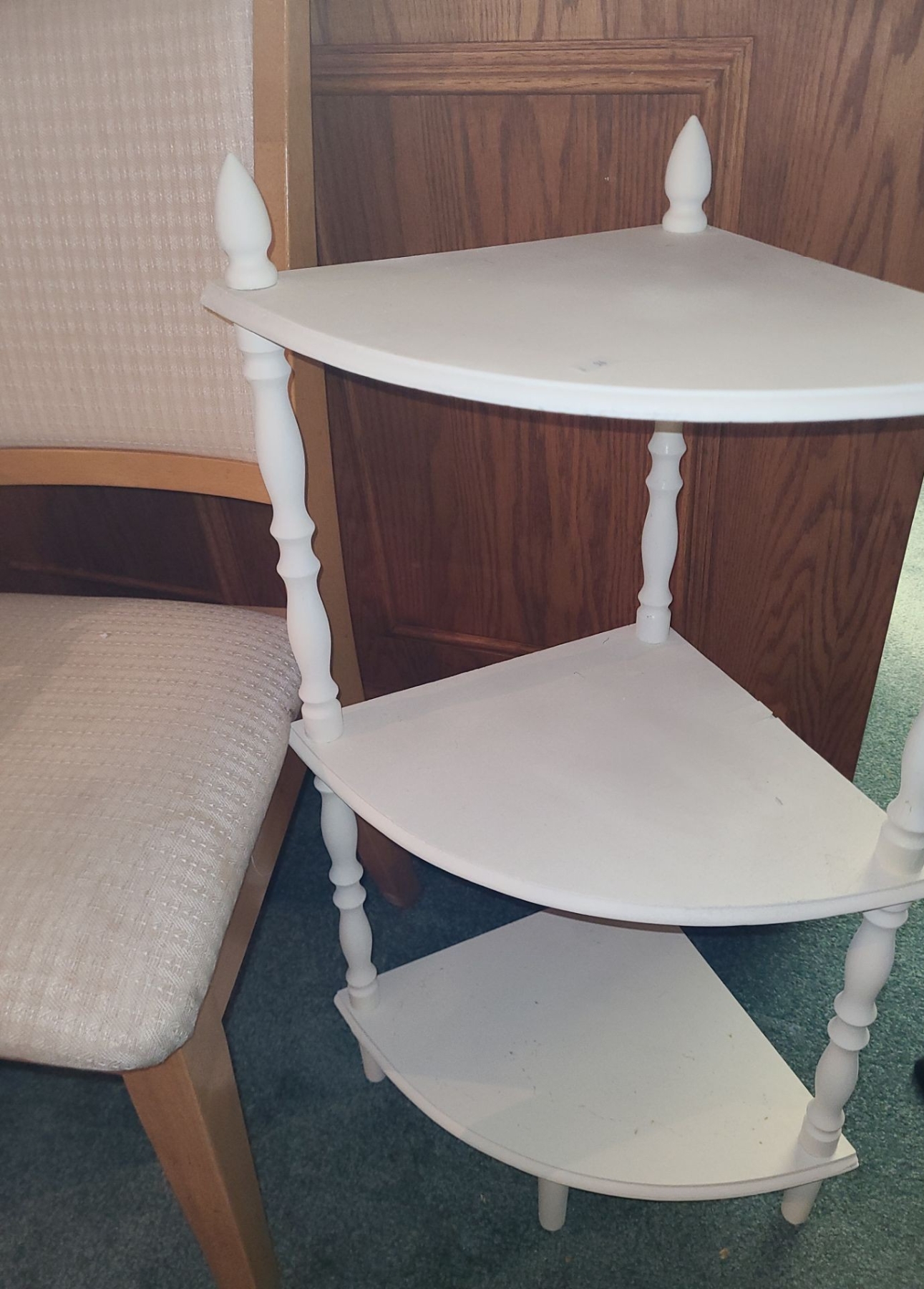 Chair 18 W, 17 D, 30.5 T, Corner Shelf 18.5 W, 12.5 D, 31 T, Mirror 22.5 X 26.5