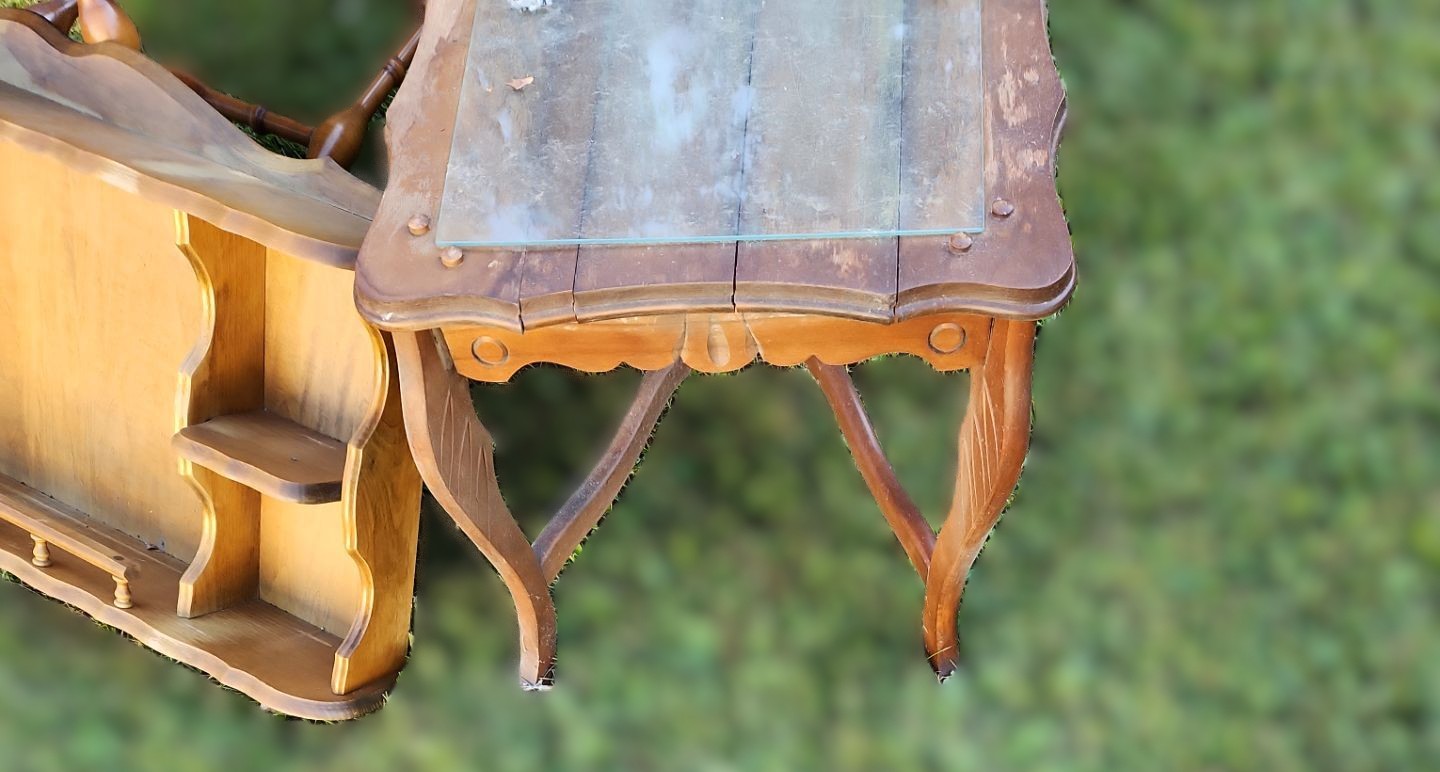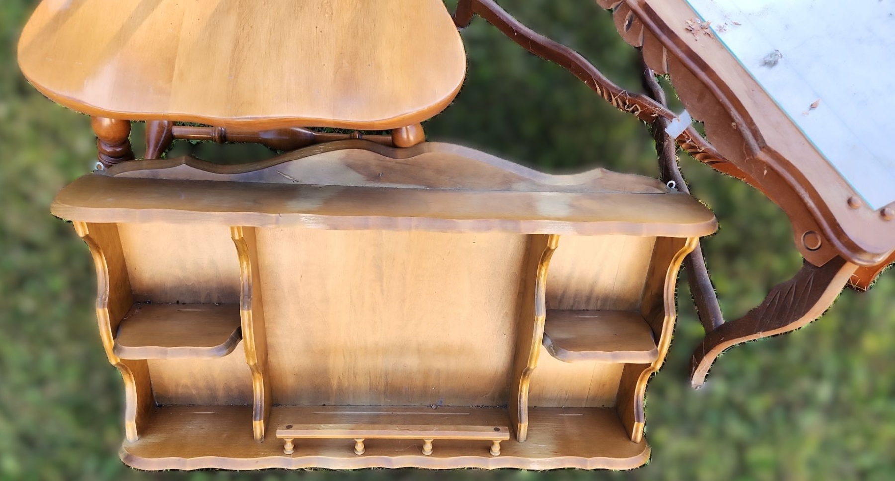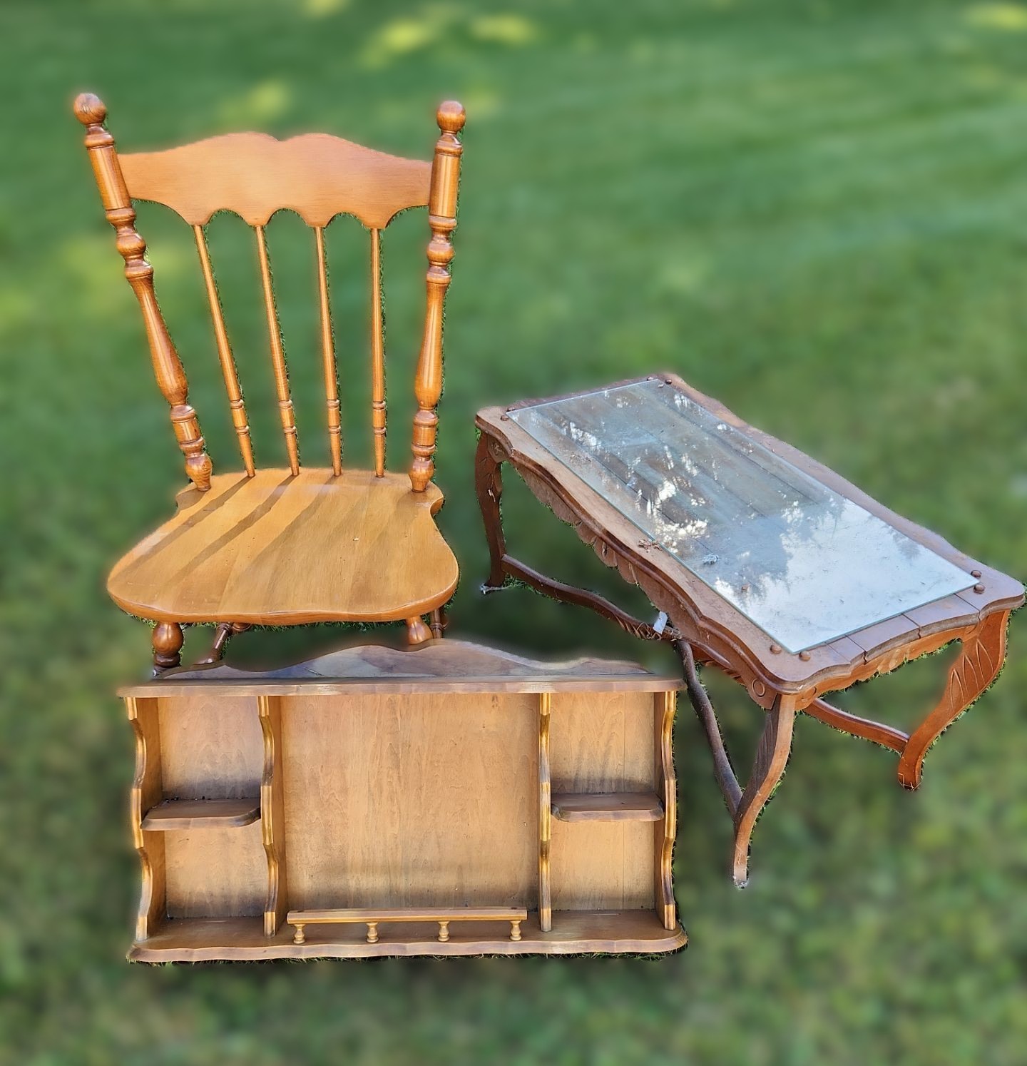 Chair 19 W, 17 D, 35 T, Wall Shelf 31 W, 5 D, 17 T, Table w/ Glass Top 34 W, 17.5 D, 17 T