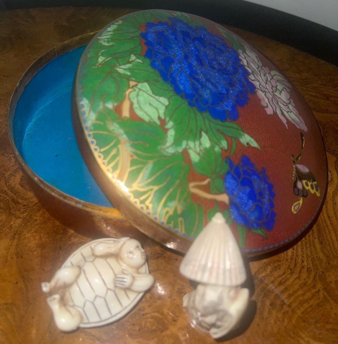 Charming Enamel Chinese Bowl w/Two Asian Bone Miniatures