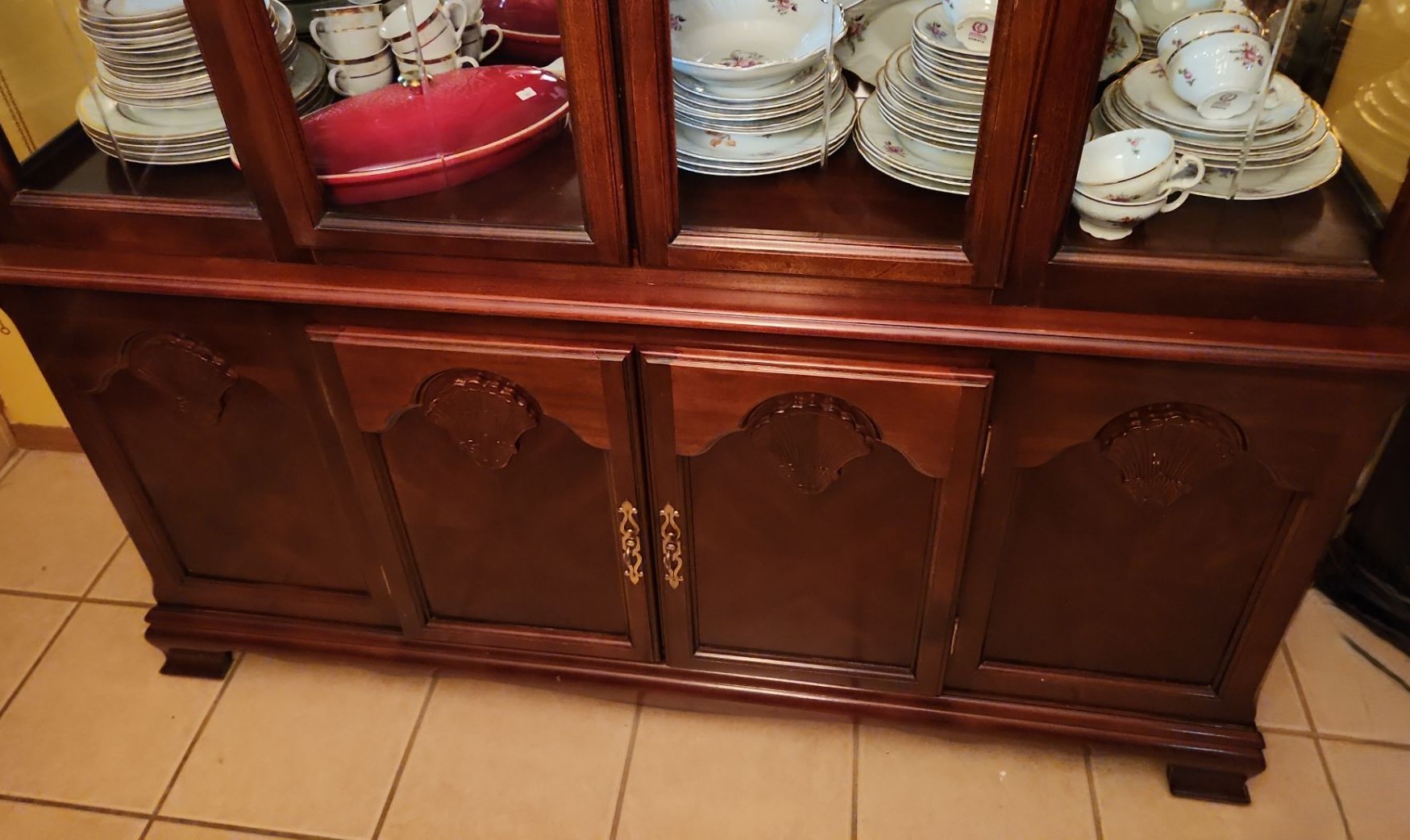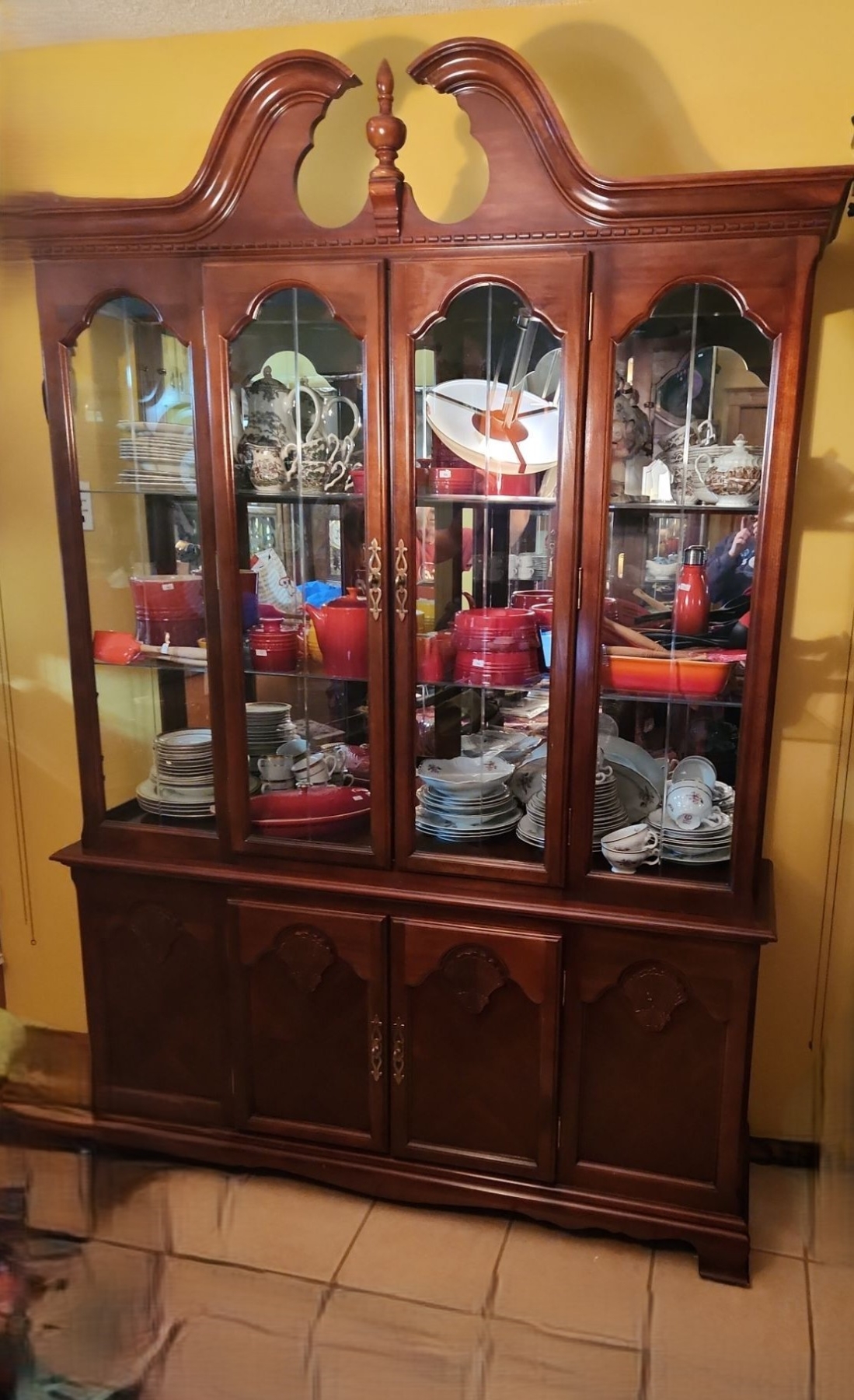 Cherry Finish China Cabinet with Bottom Cupboard, Glass Shelves, and Light 87 T, 60 L, 16 W