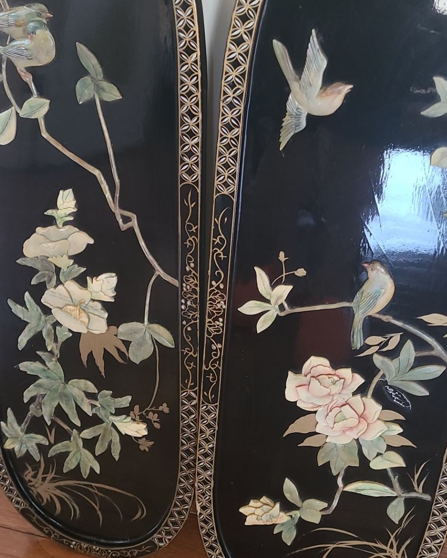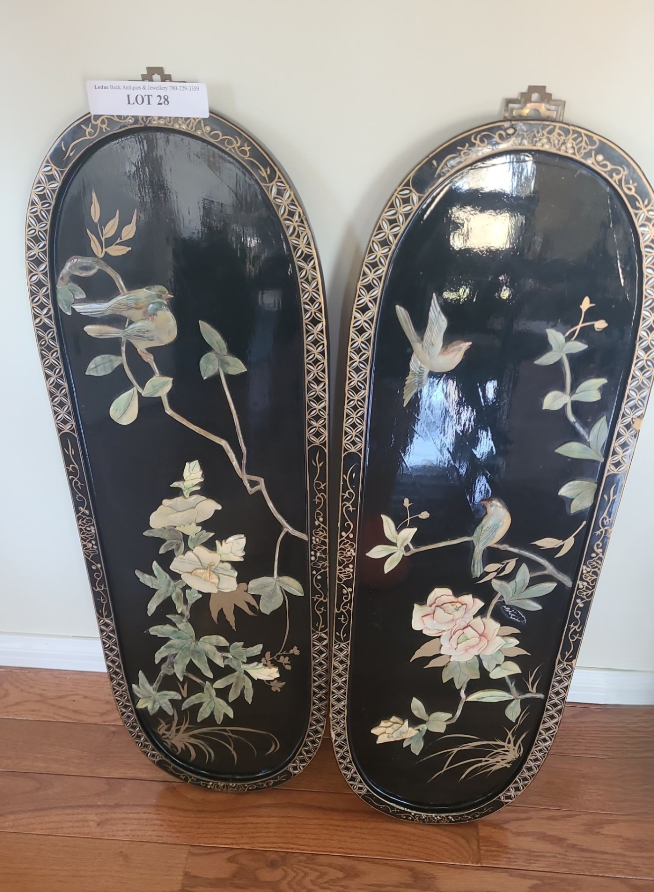 Chinese Floral Black Laquer Wall Decor 2nd Set, 11 1/2 w, 36 h