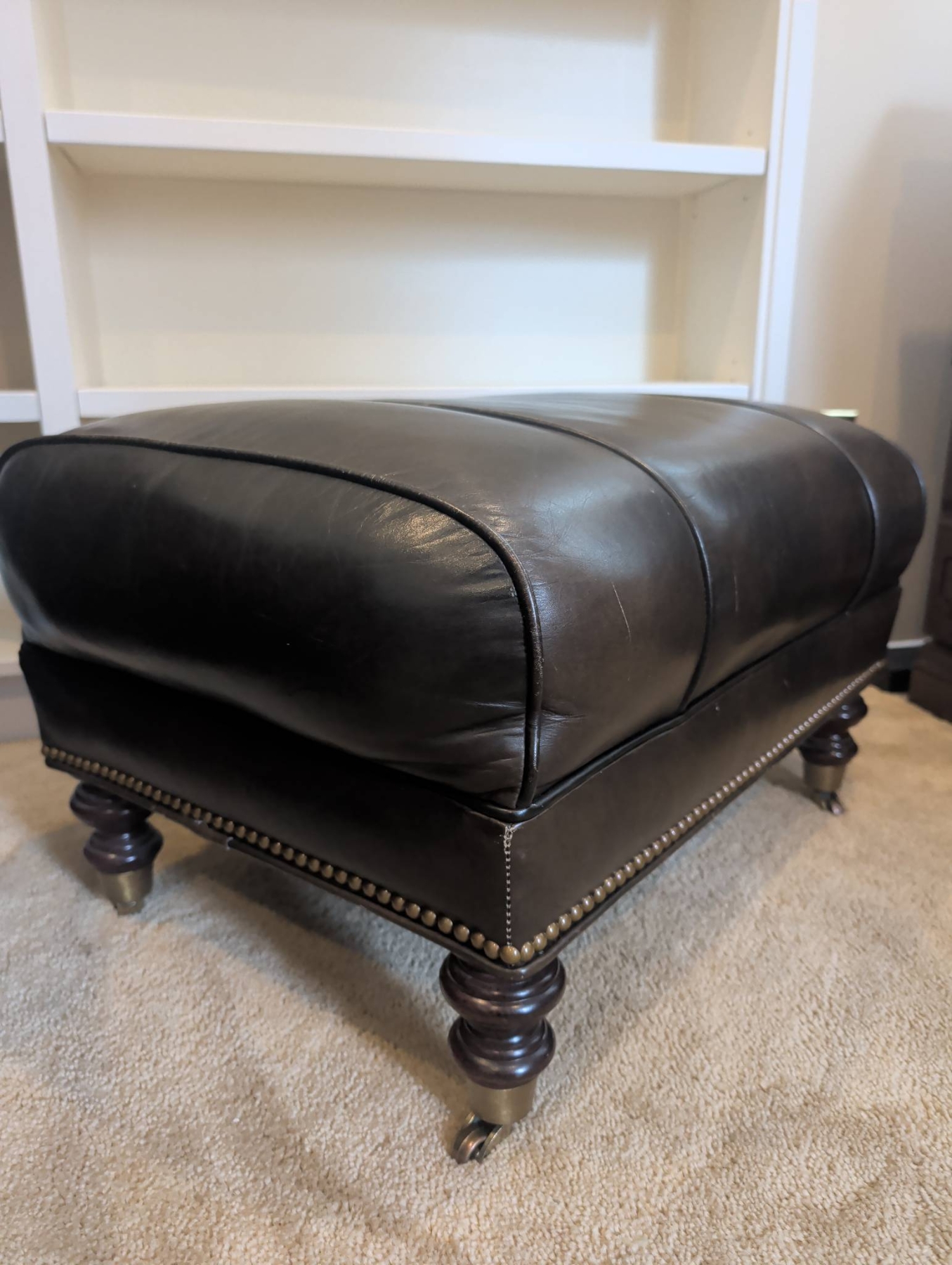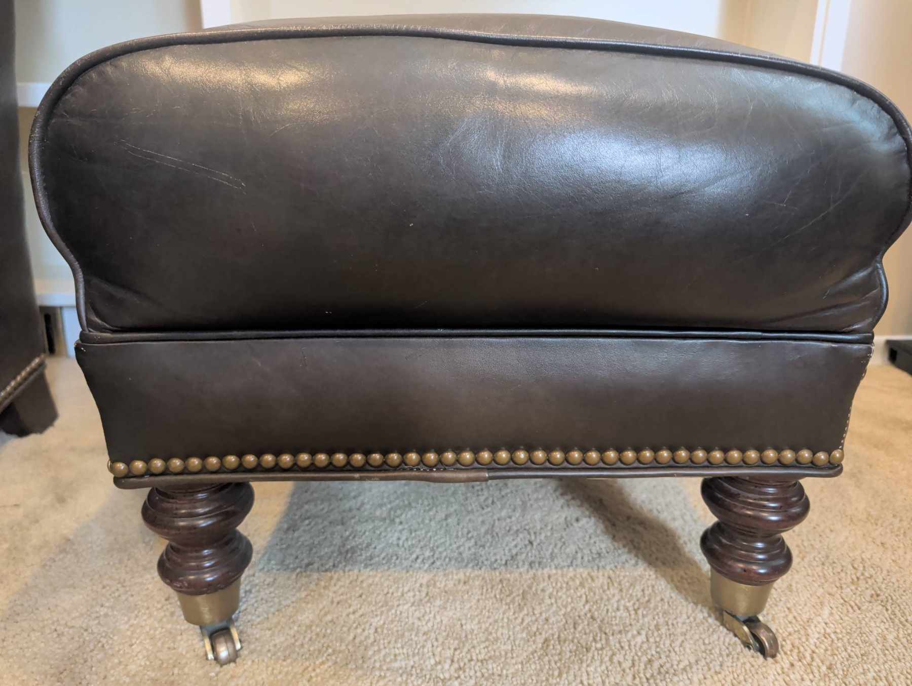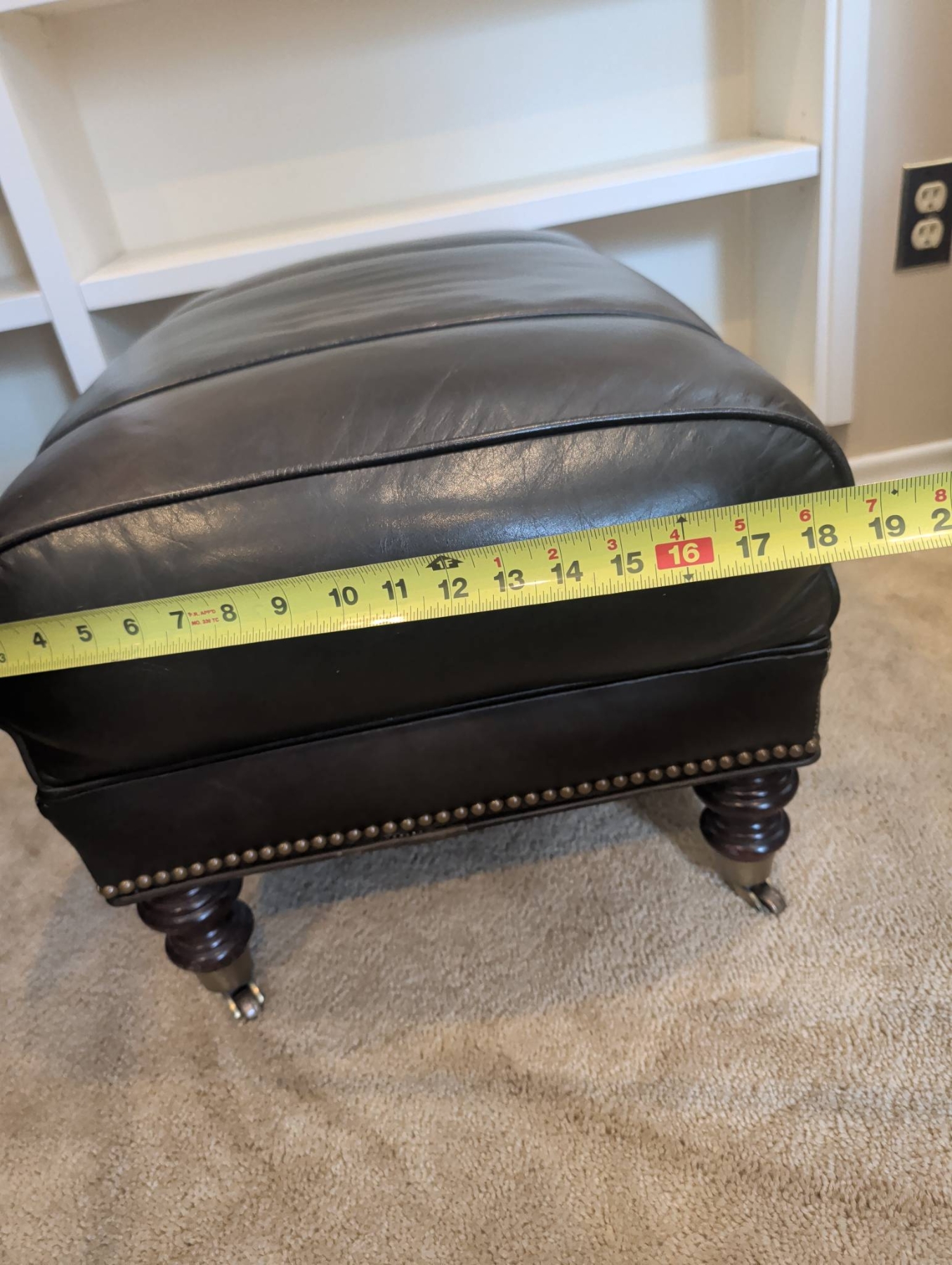 Brown leather ottoman featuring a rectangular cushioned top with paneled stitching, accentuated by a decorative nailhead trim along the edges. Supported by turned wooden legs with casters for easy mobility. Dimensions are approximately 16 inches in width, 23 inches in length, and 15.5 inches in height. Perfect for adding both function and style to any living space.