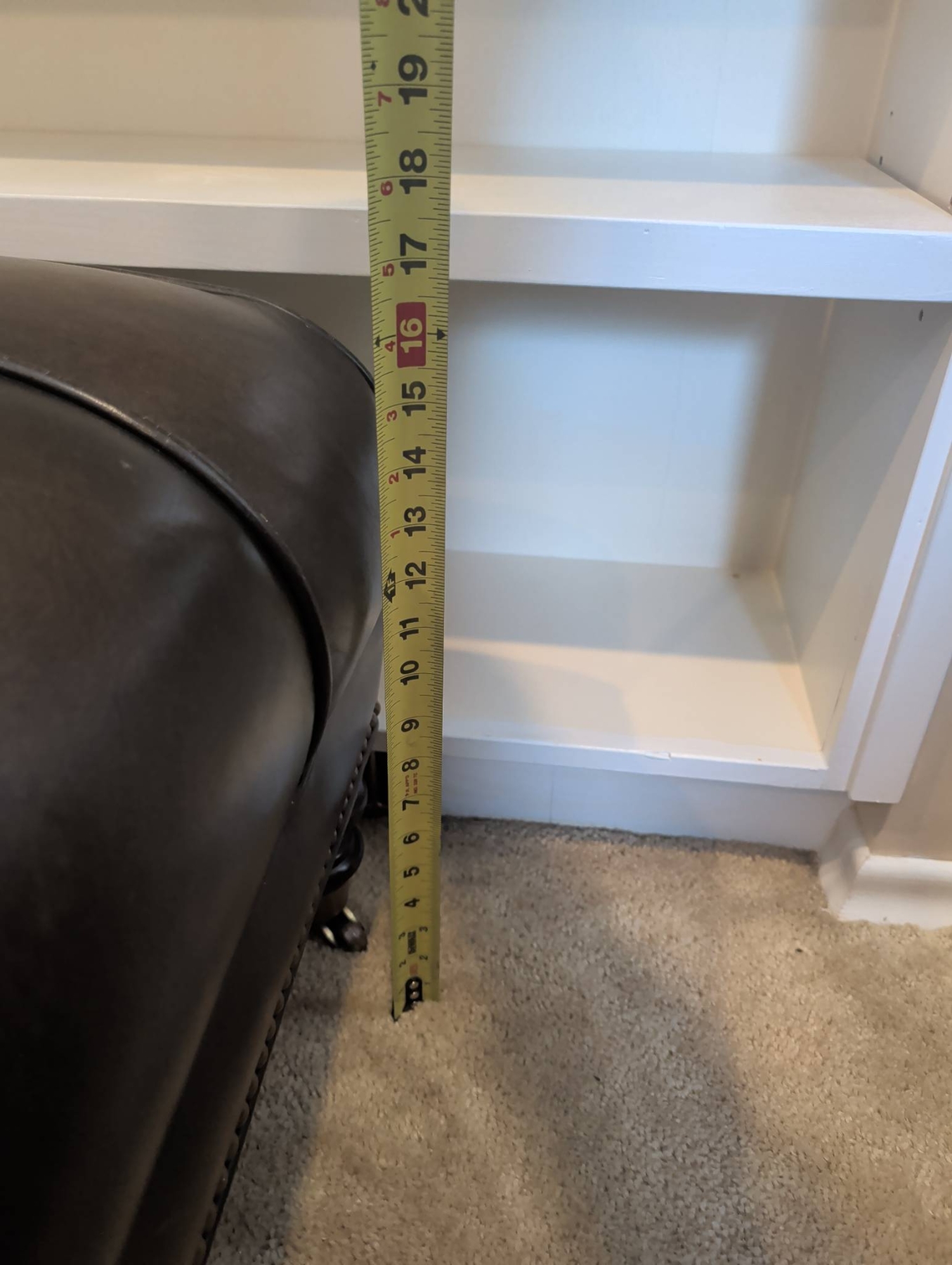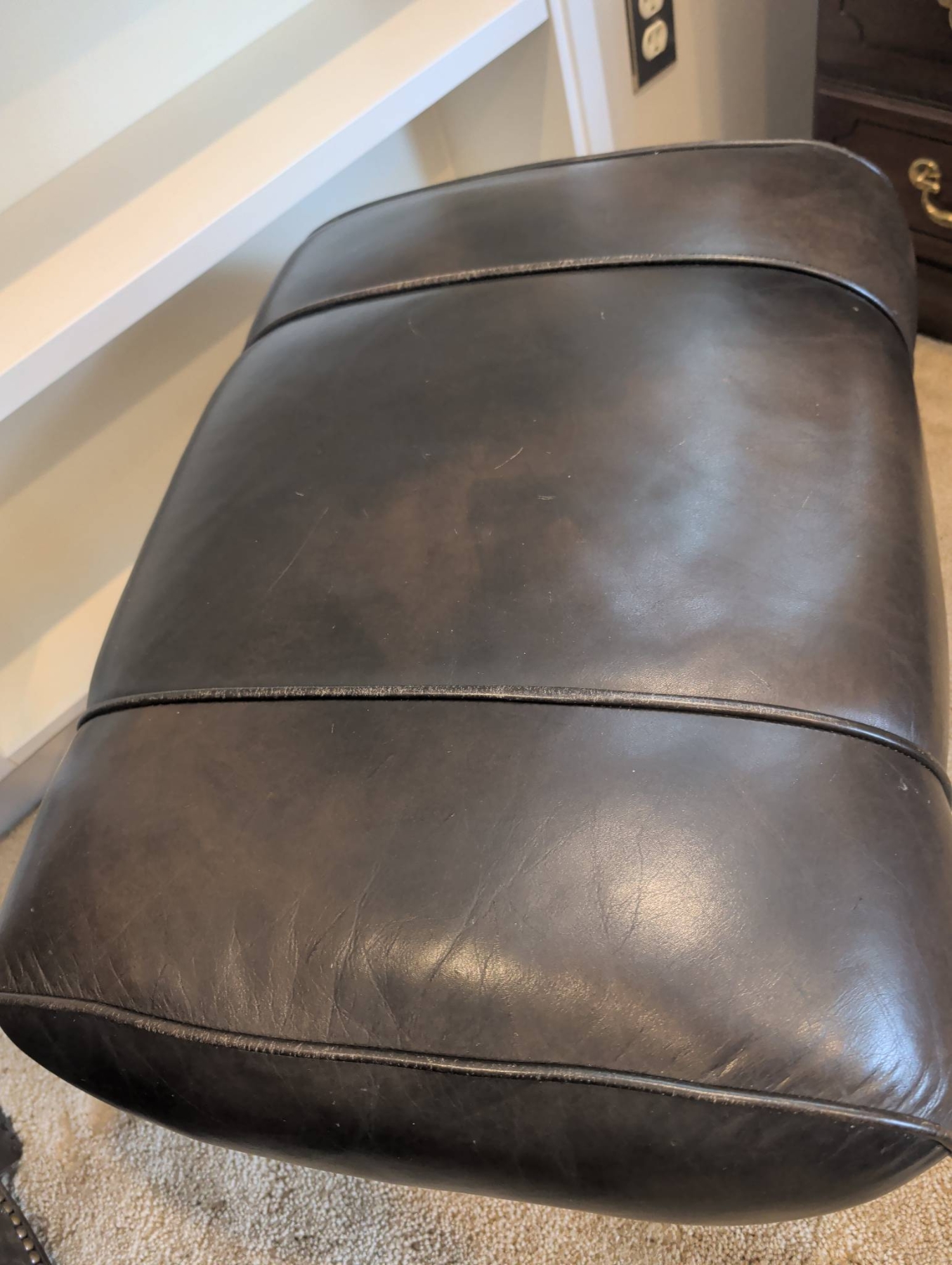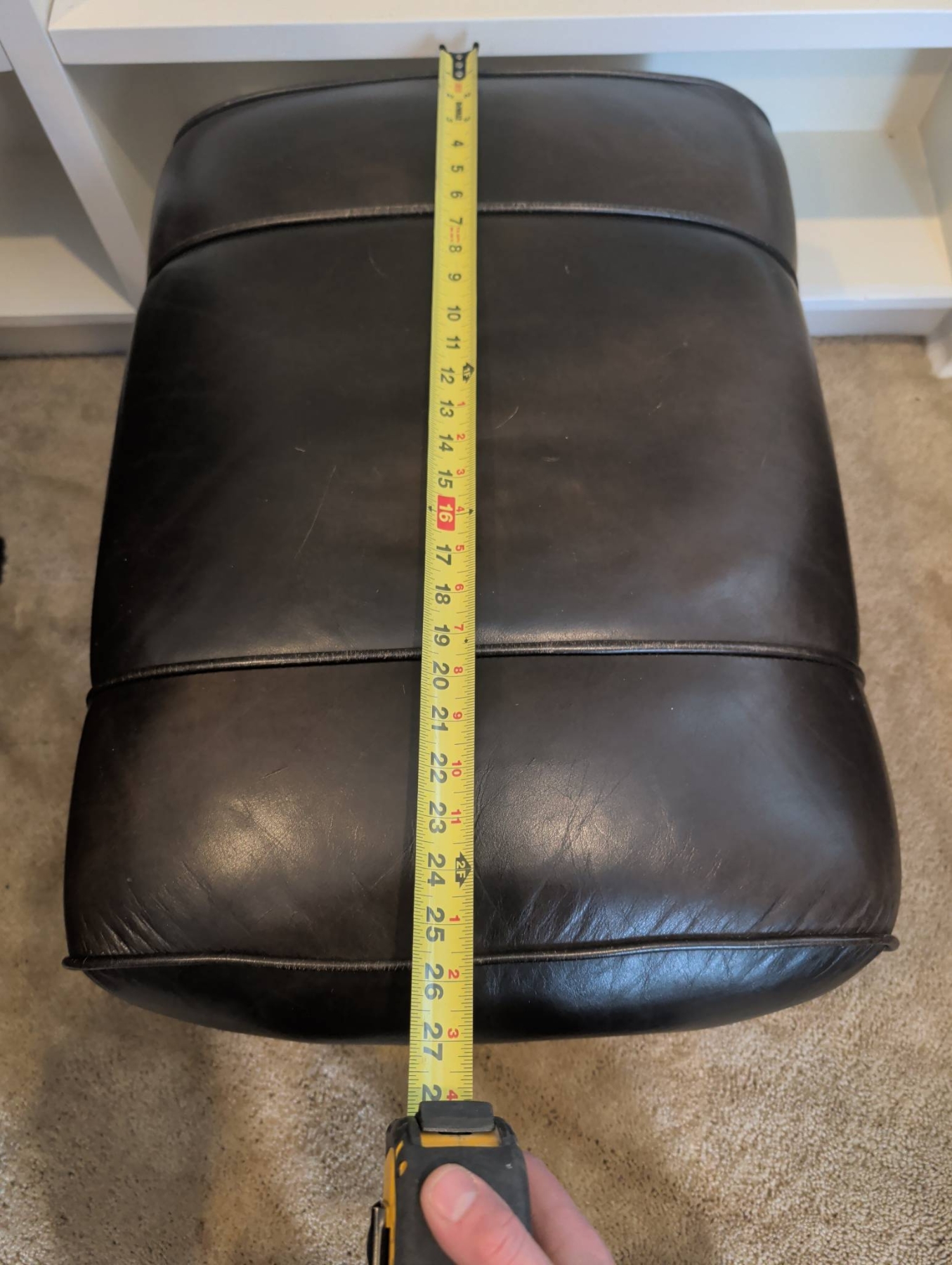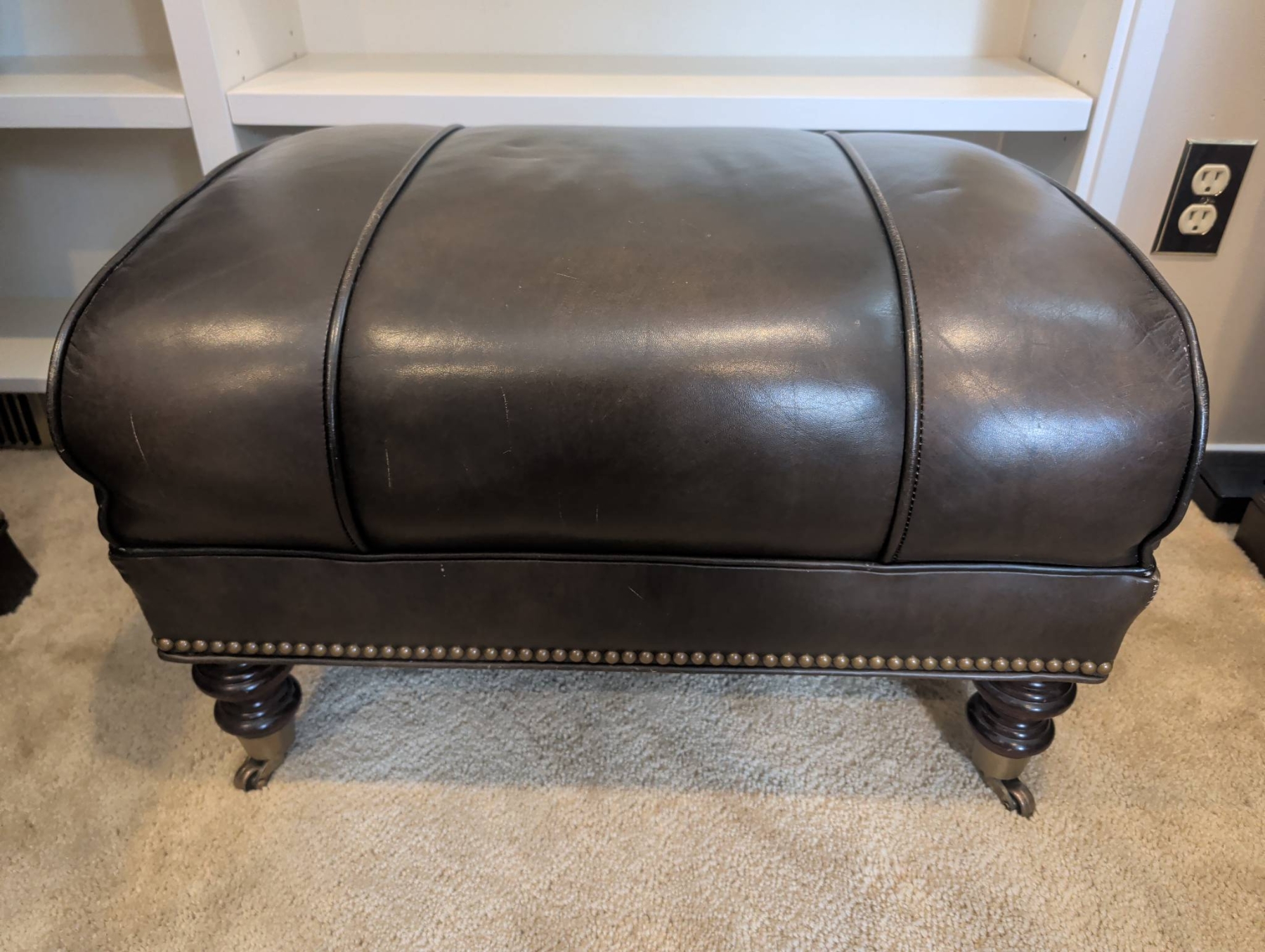 Brown leather ottoman featuring a rectangular cushioned top with paneled stitching, accentuated by a decorative nailhead trim along the edges. Supported by turned wooden legs with casters for easy mobility. Dimensions are approximately 16 inches in width, 23 inches in length, and 15.5 inches in height. Perfect for adding both function and style to any living space.