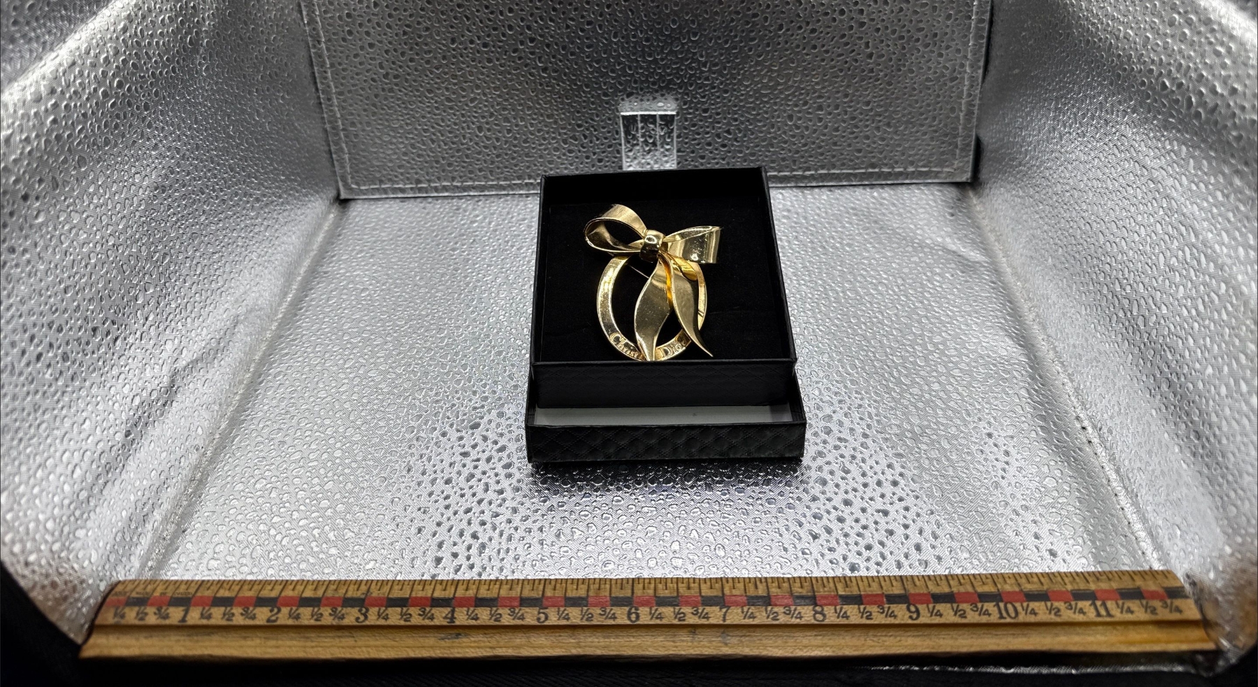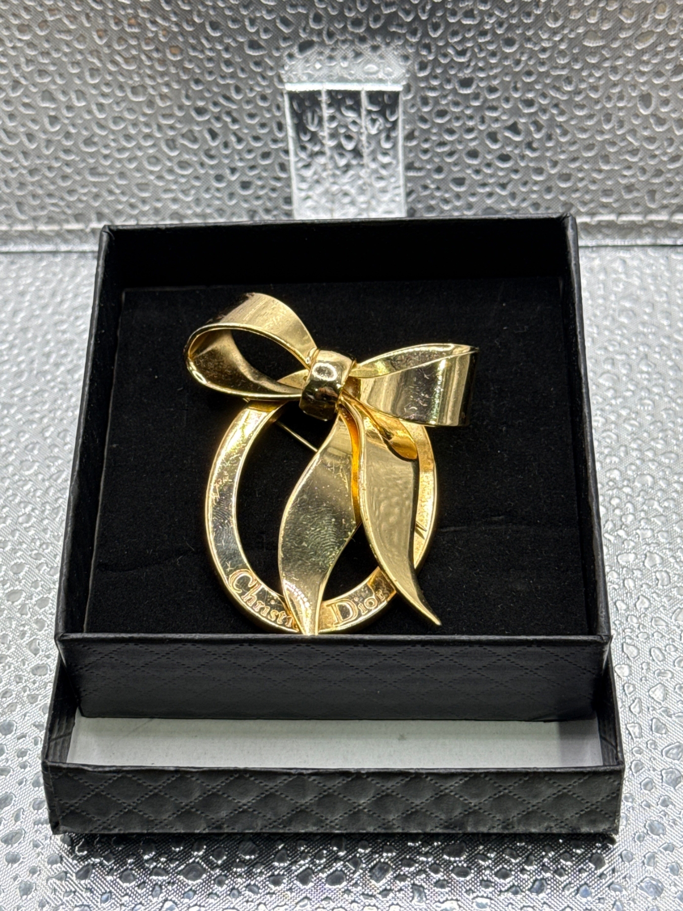 This gold plated ribbon bow tie brooch is must have. It is authentic signature piece.