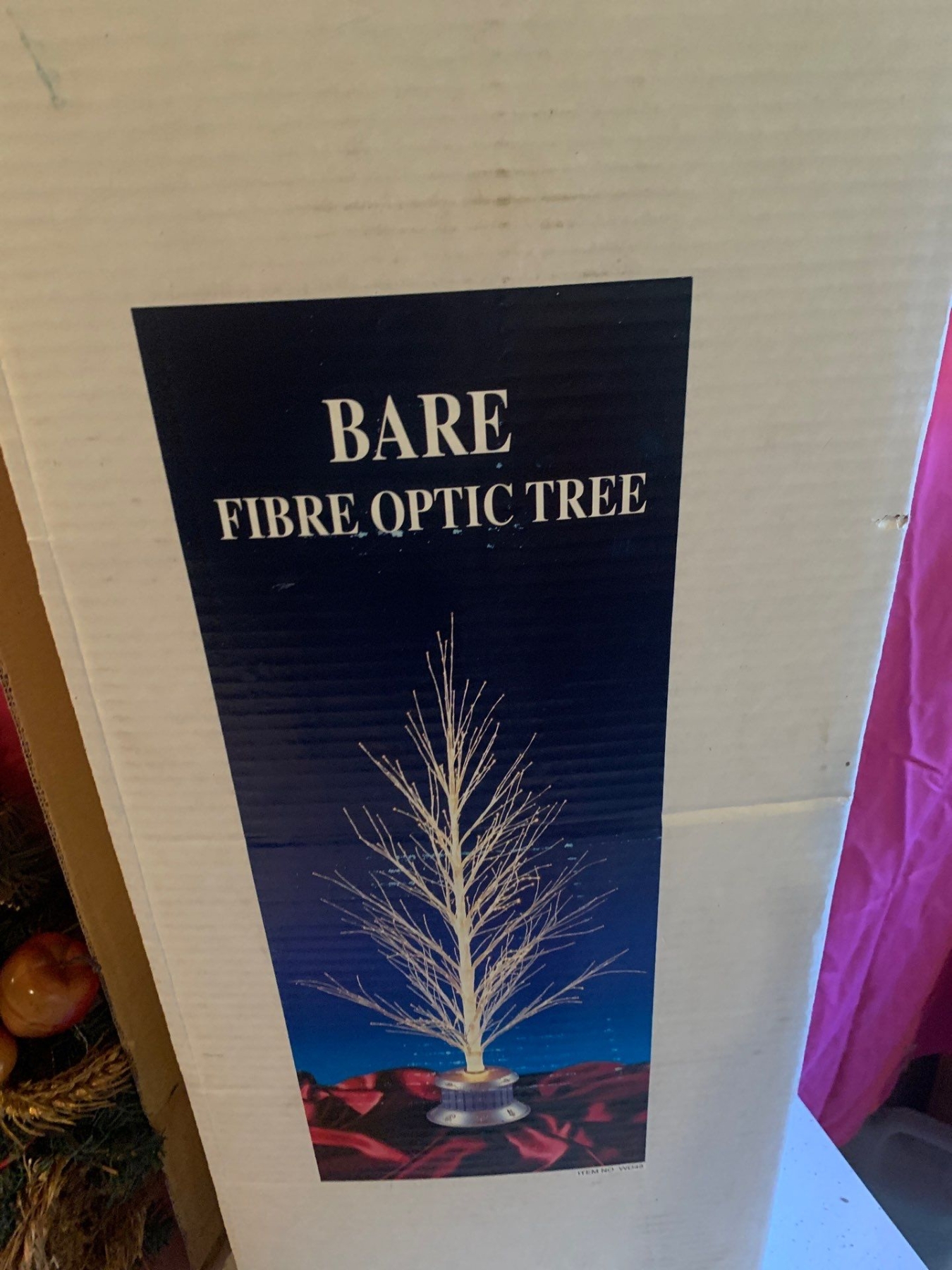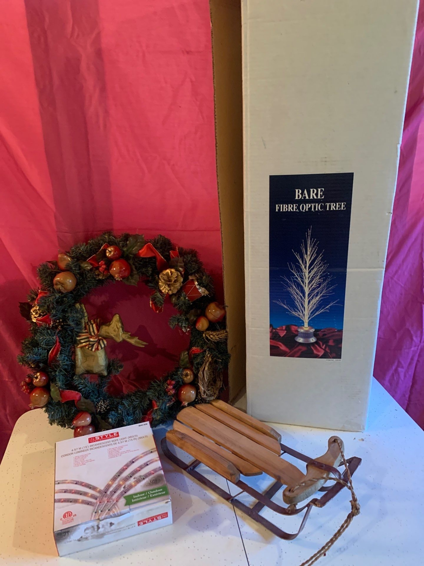 Christmas Lot, Lights New, Sled, Wreath and Fibre Optics Tree New In Box