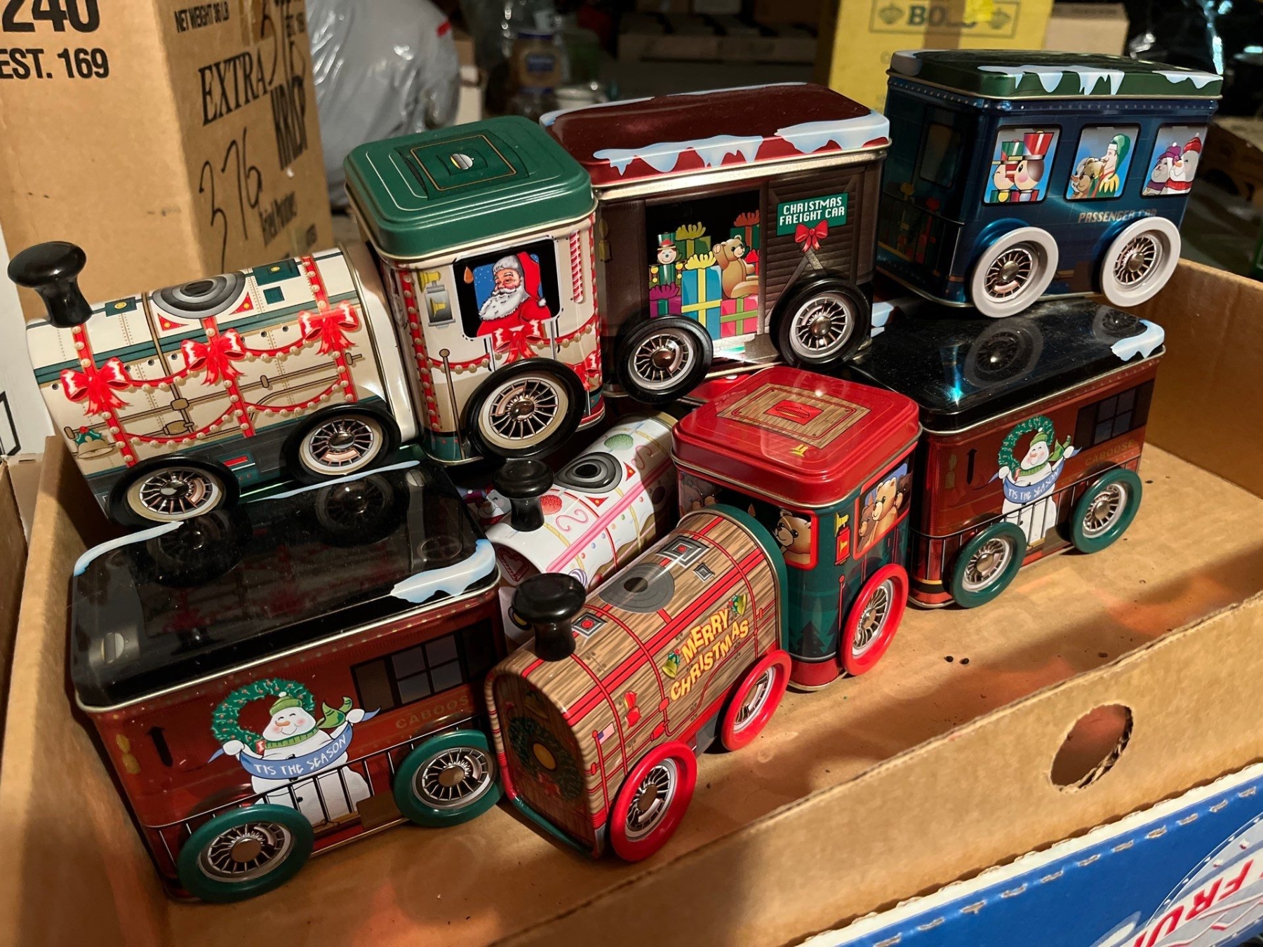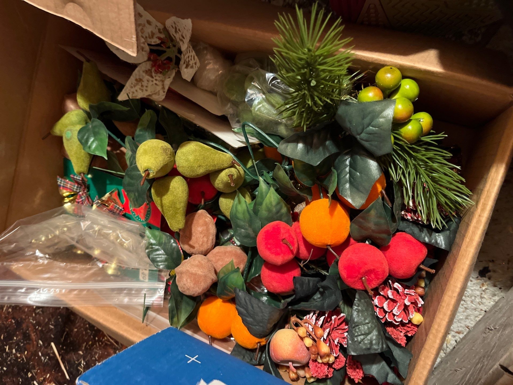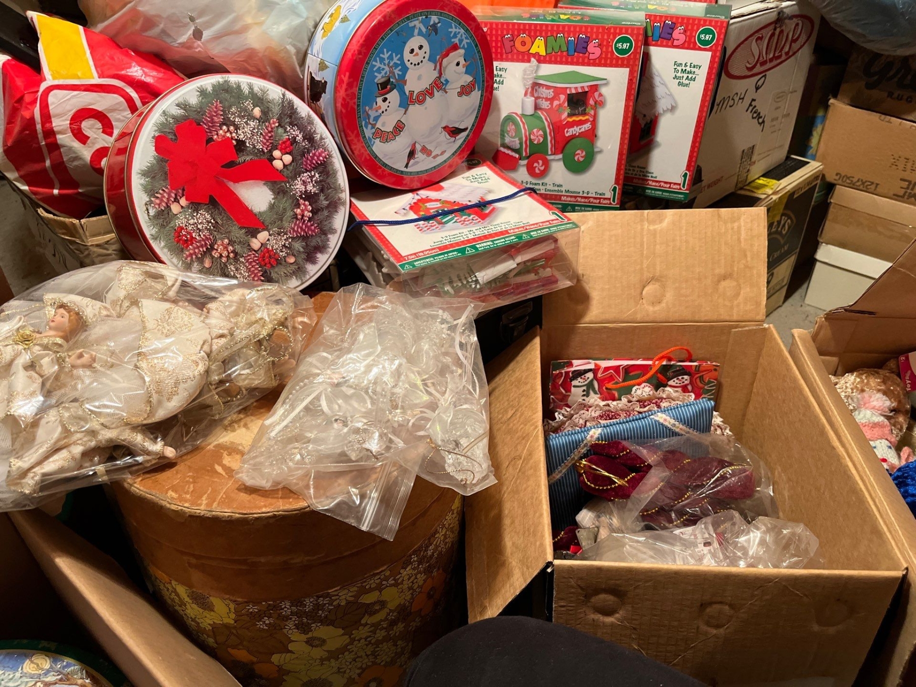 Christmas light with vintage ornaments, beautiful ceramic victorian angels, three toy tin trains crafts, and Christmas stuffy’s, and a number of vintage felt fruit ornaments