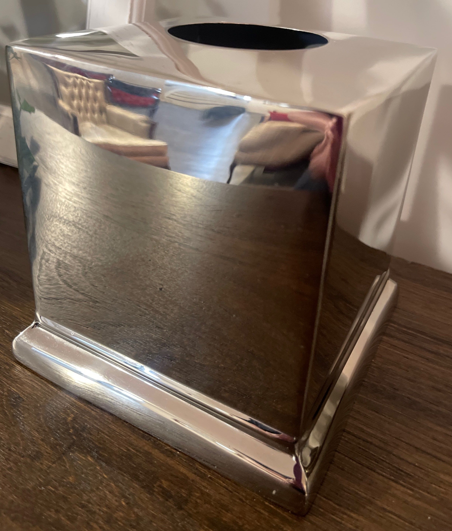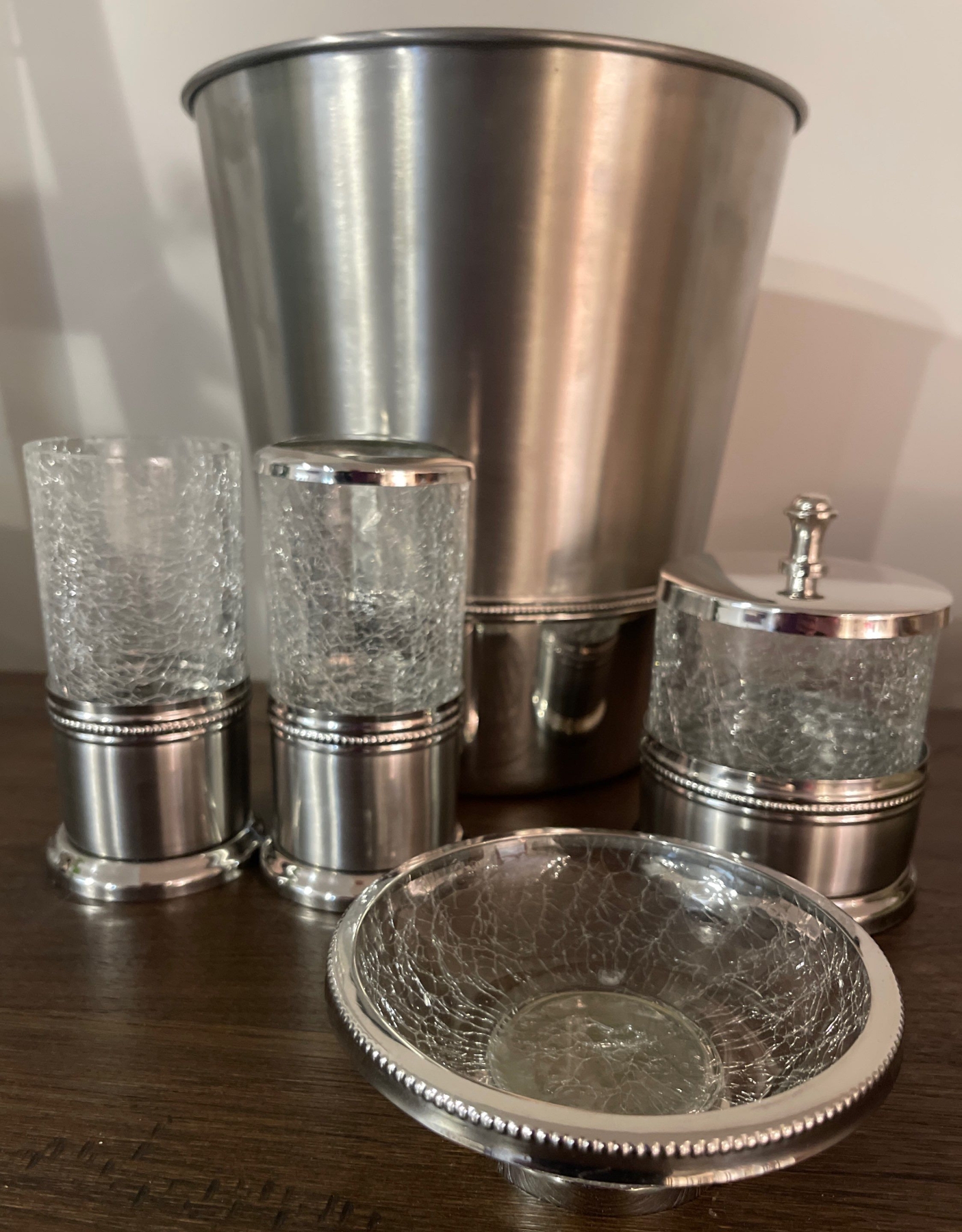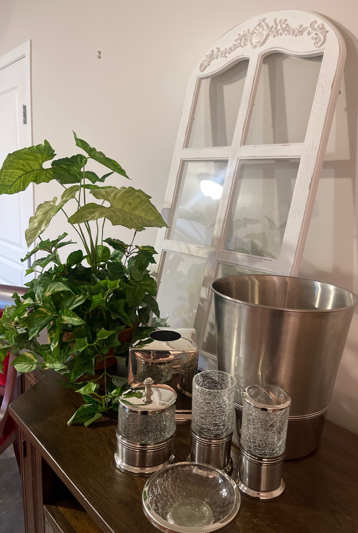Chrome & Mosaic Crinkle Glass Toiletry Collection w/ Farmhouse Window Photo Frame & Faux House Plant