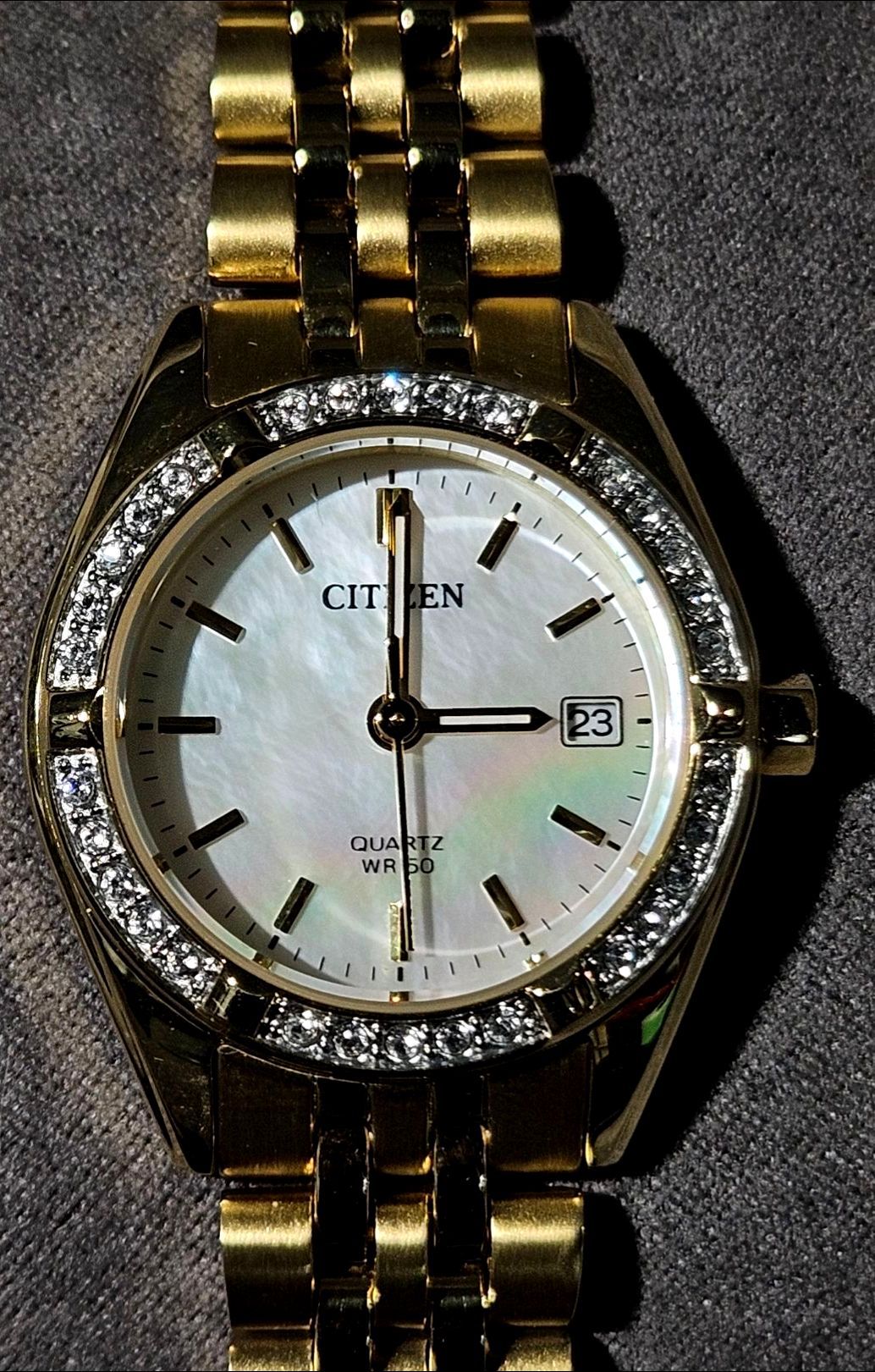 This dazzling accessory features a gold-toned bracelet, a mother-of-pearl dial, and a crystal-set bezel. Includes original factory packaging. Incredible gift or collector's item.