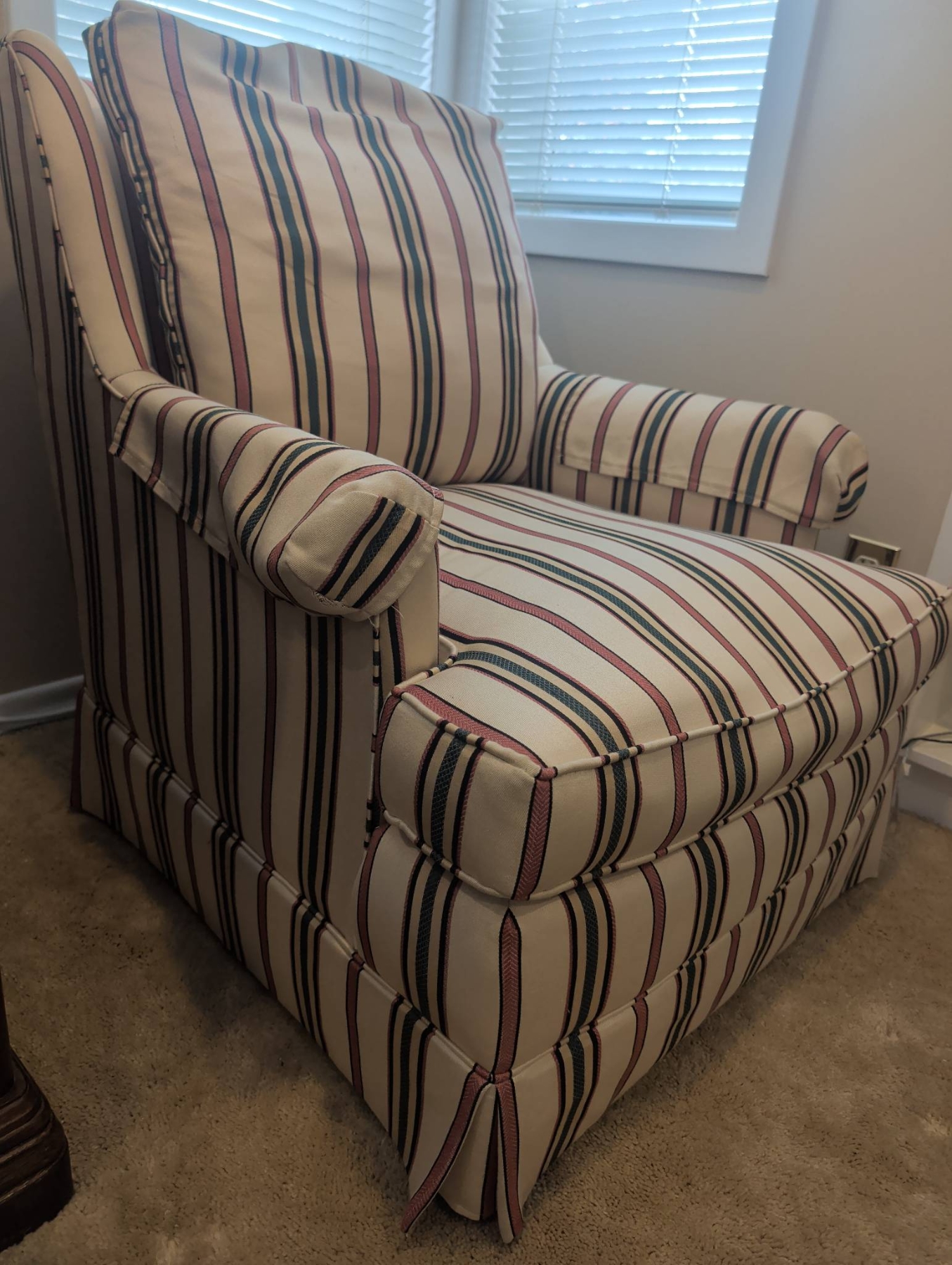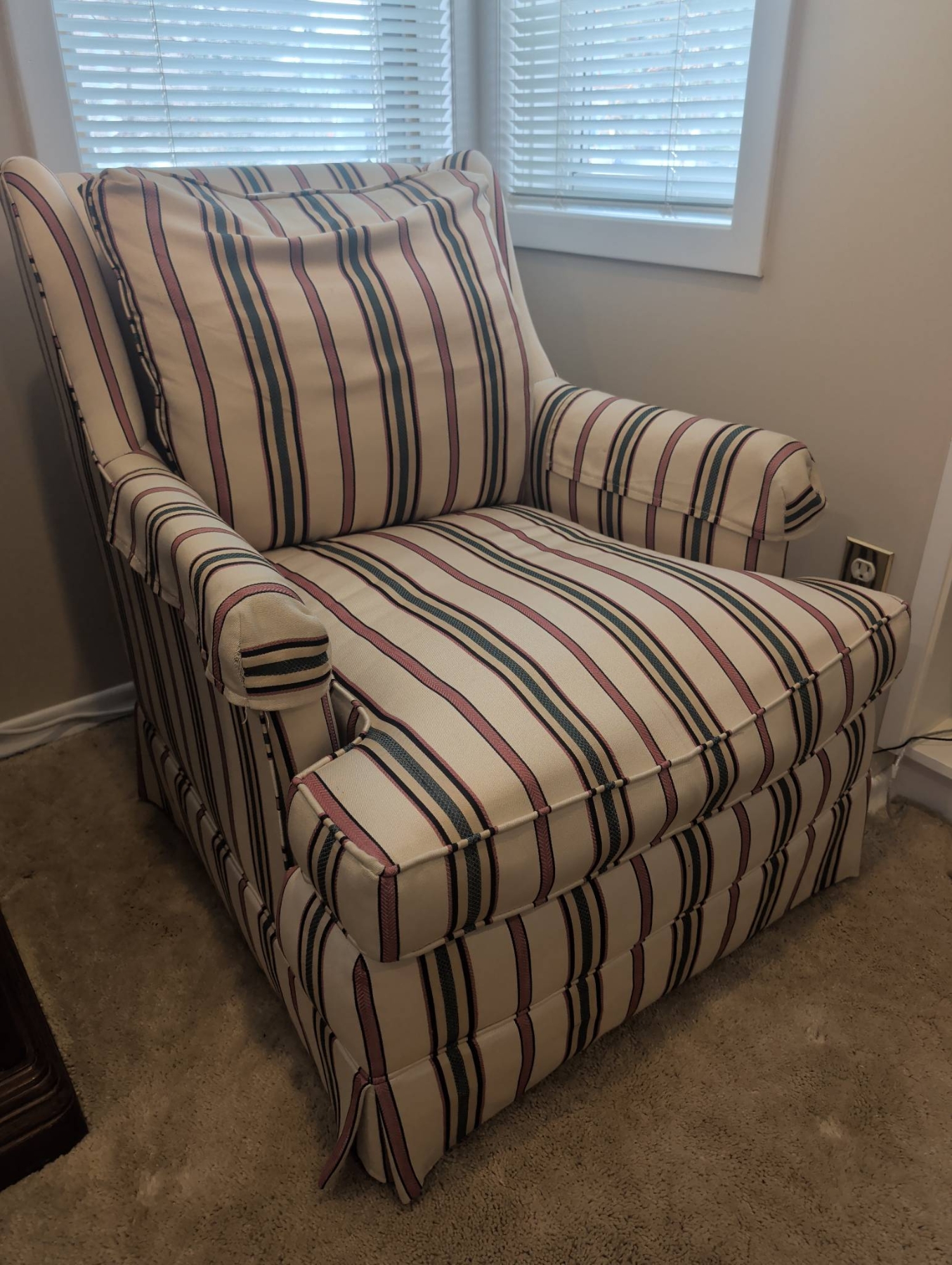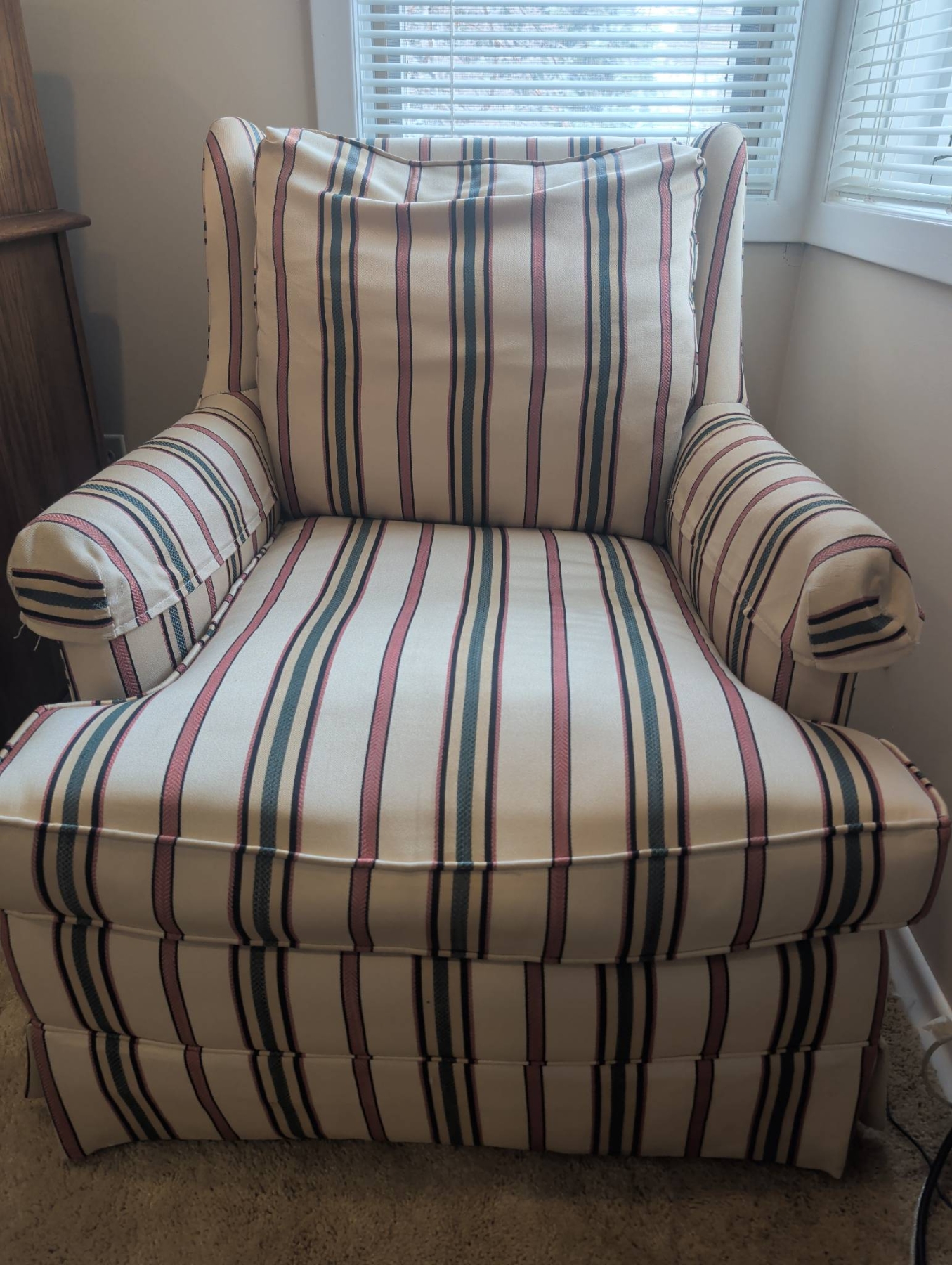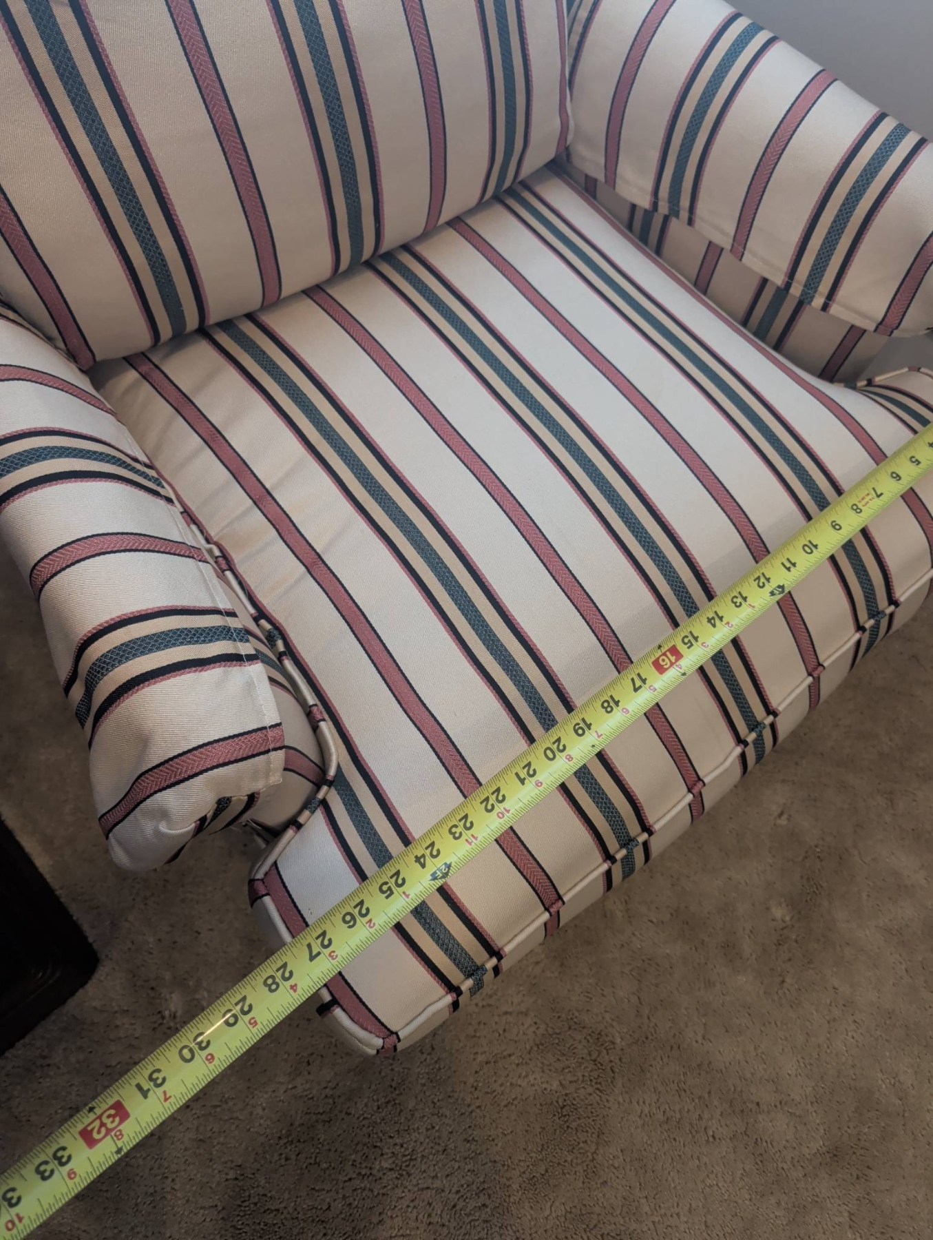 Clayton Marcus upholstered armchair featuring timeless striped fabric in shades of red, blue, and cream. The chair includes a tailored skirt, rolled arms, and cushioned seat and backrest for added comfort. Dimensions are approximately 34 inches tall, 32 inches wide, and 32 inches deep. Ideal for a cozy living space or reading nook. Condition is consistent with gentle use.