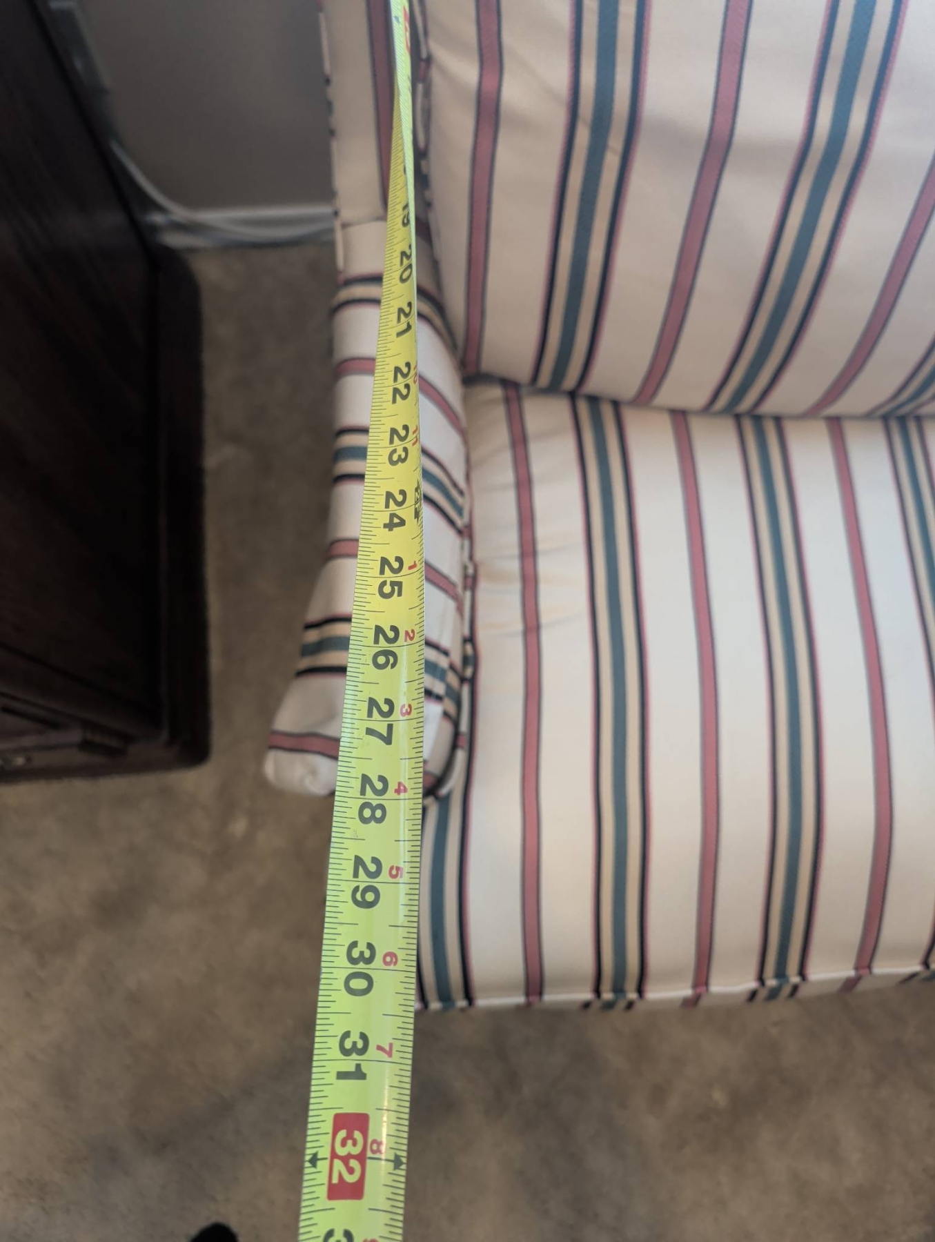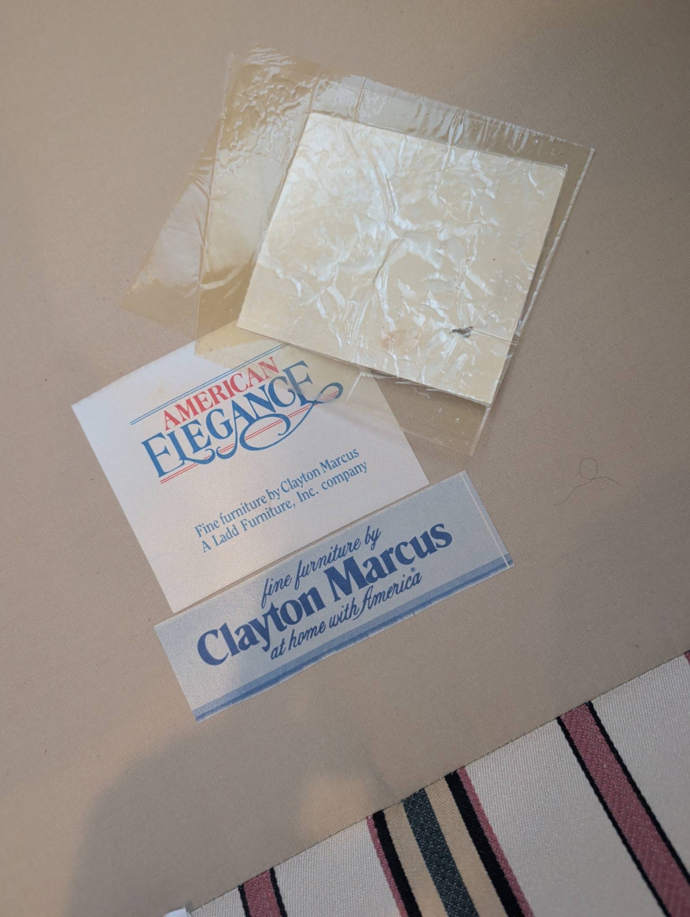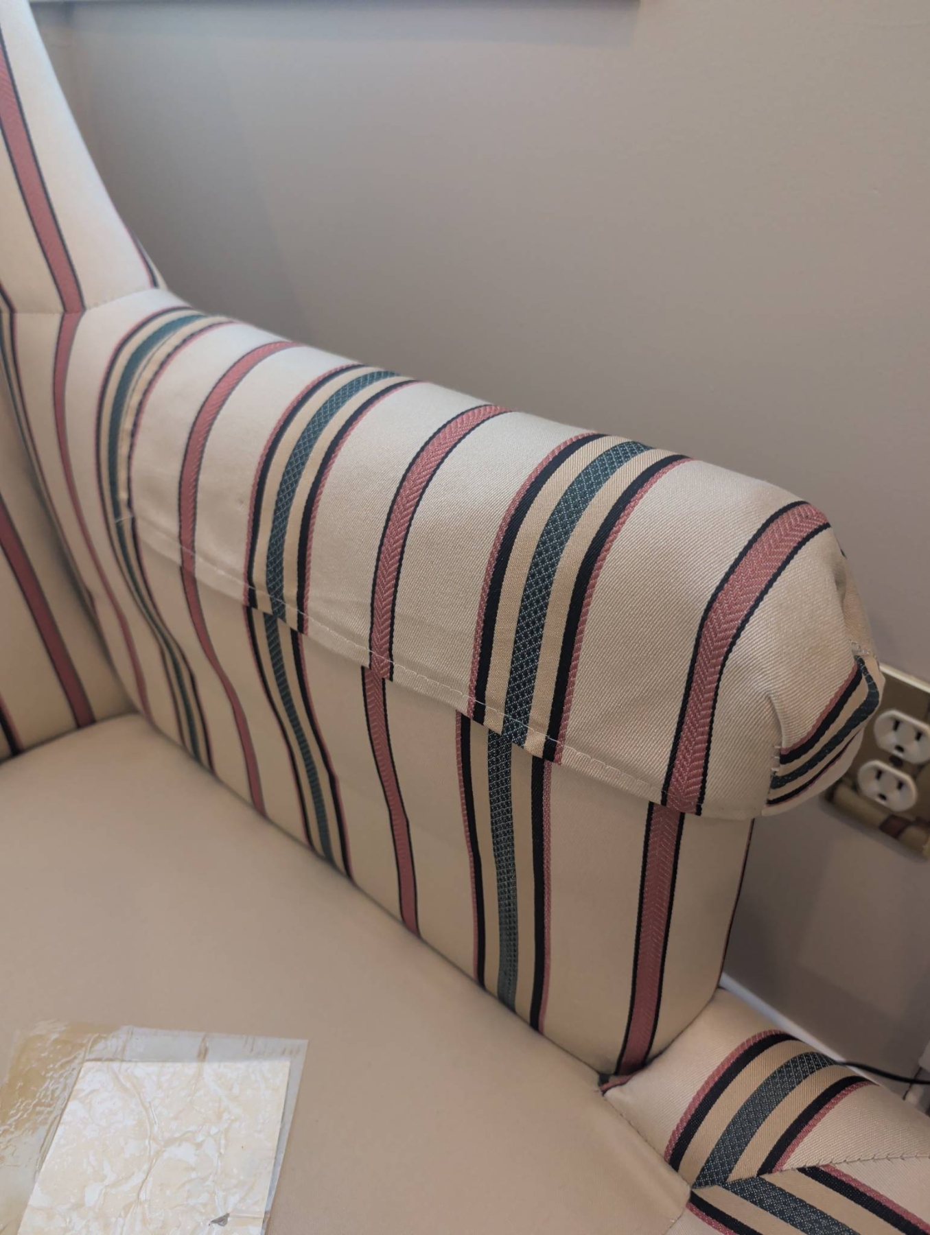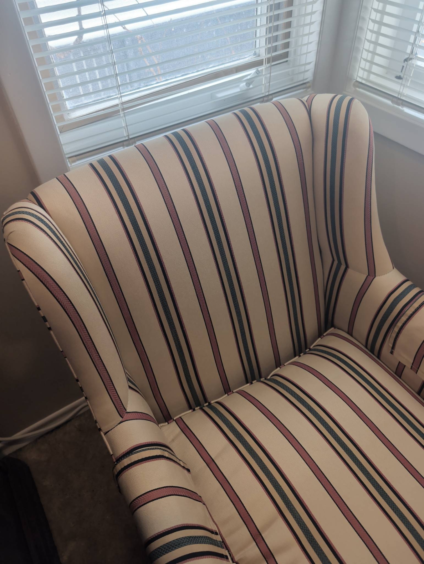 Clayton Marcus upholstered armchair featuring timeless striped fabric in shades of red, blue, and cream. The chair includes a tailored skirt, rolled arms, and cushioned seat and backrest for added comfort. Dimensions are approximately 34 inches tall, 32 inches wide, and 32 inches deep. Ideal for a cozy living space or reading nook. Condition is consistent with gentle use.