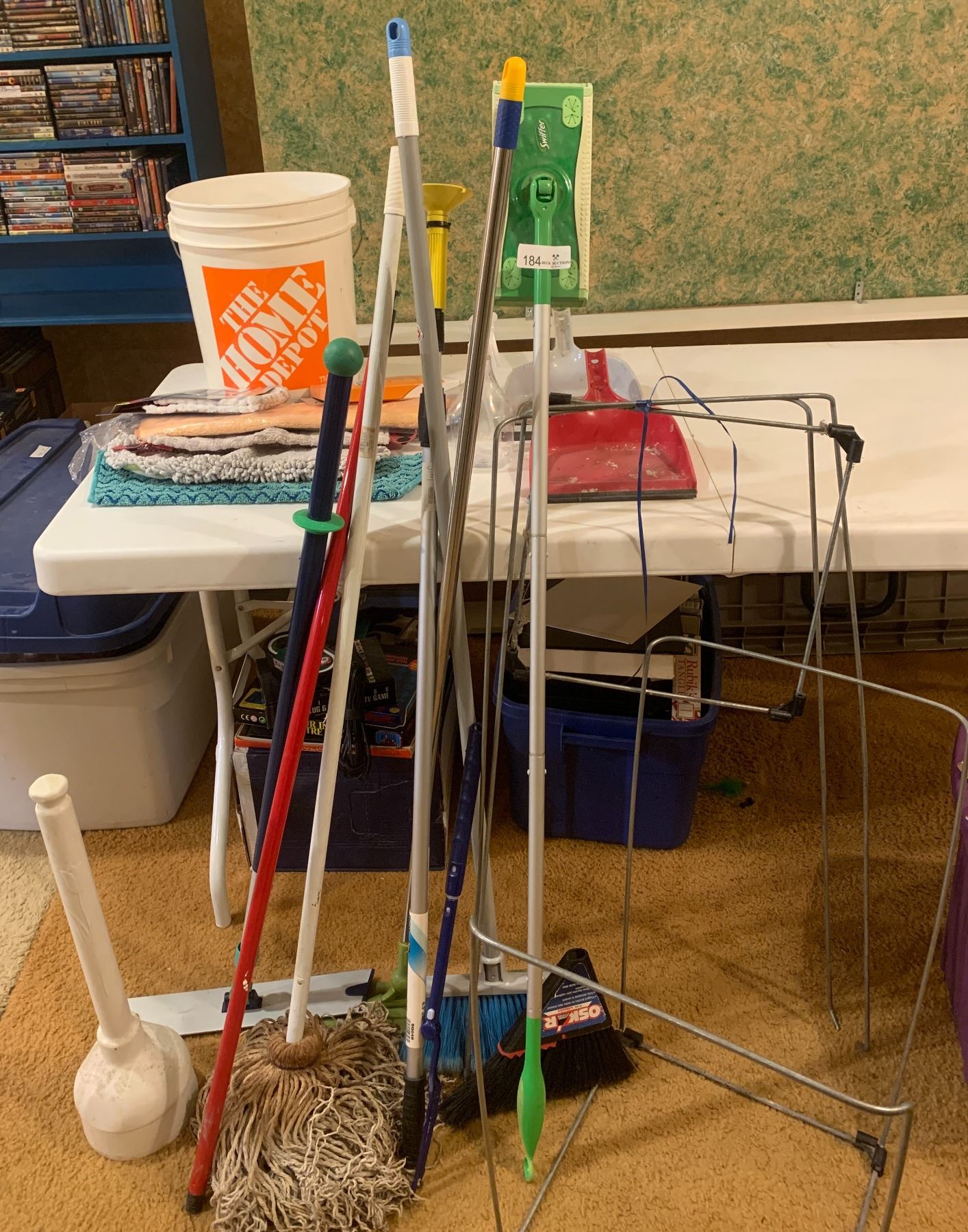 Cleaning Supplies Lot With Brooms, Mops, Gloves, Bag Holders, and More!