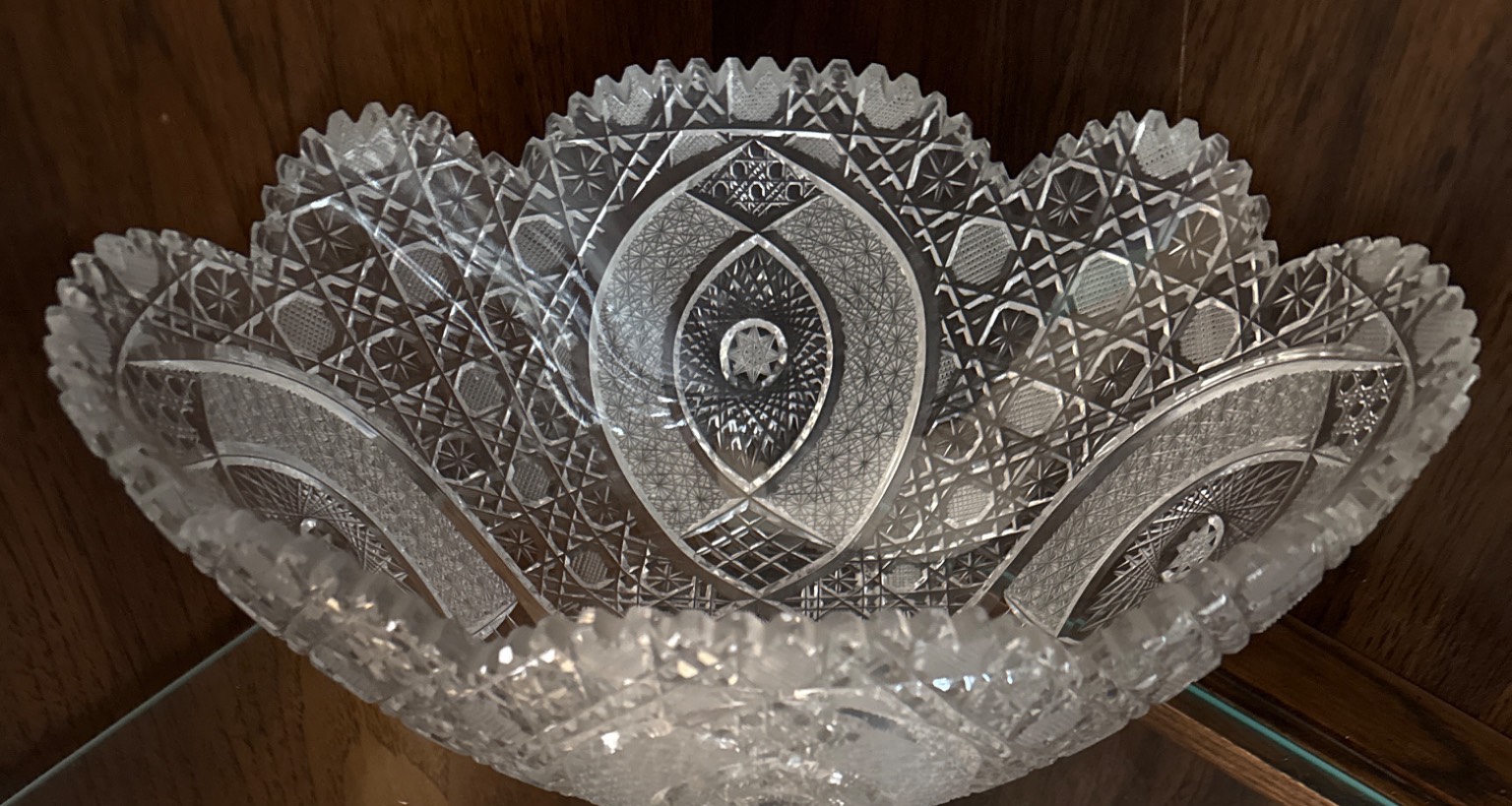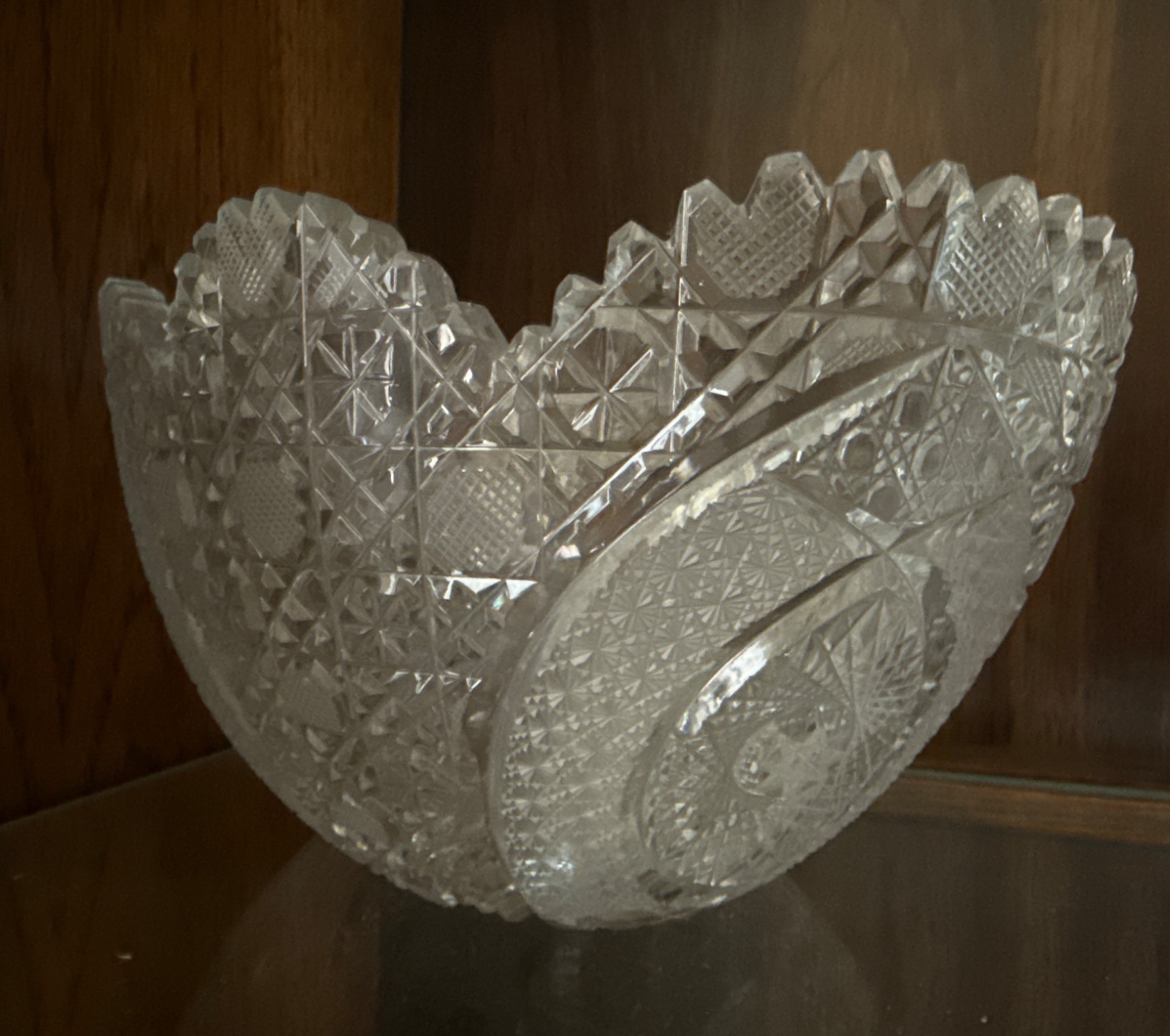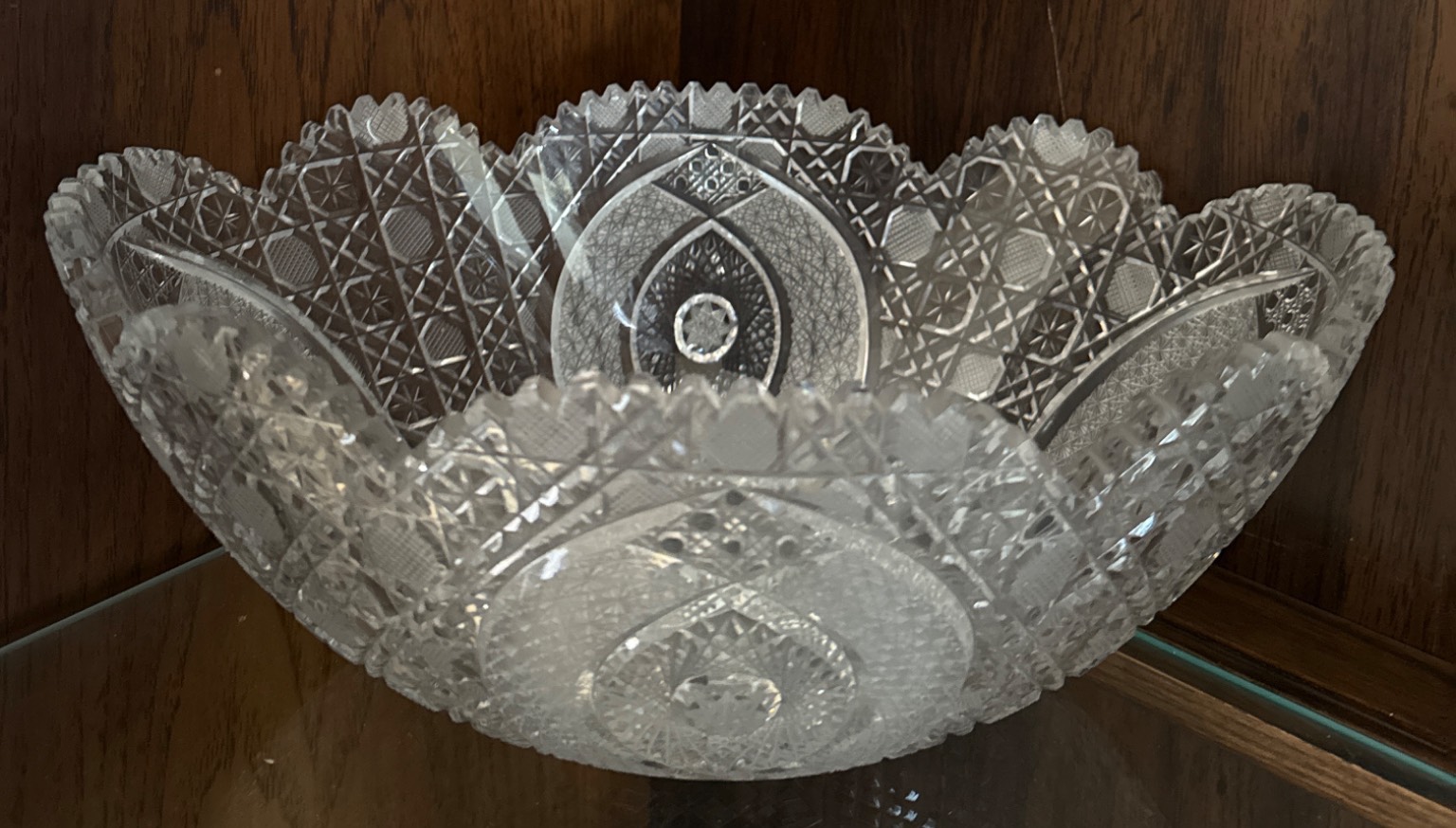 Clear pressed glass bowl featuring a scalloped rim and detailed ornate patterns, including floral and geometric motifs. The design enhances the light-catching and reflective surface of the glass. Estimated dimensions are approximately 10in in diameter and 5in in height. A perfect decorative centerpiece or serving piece for special occasions.