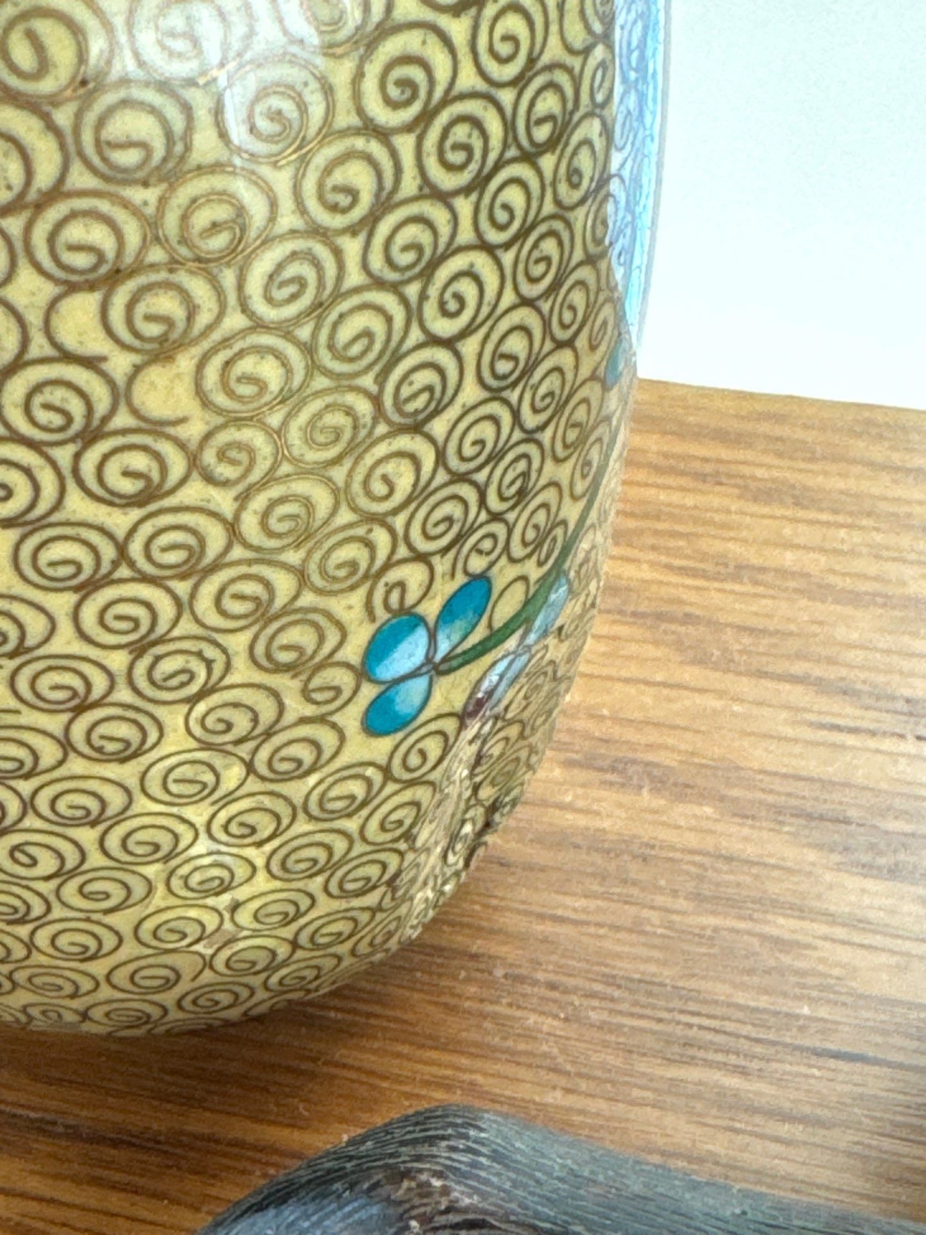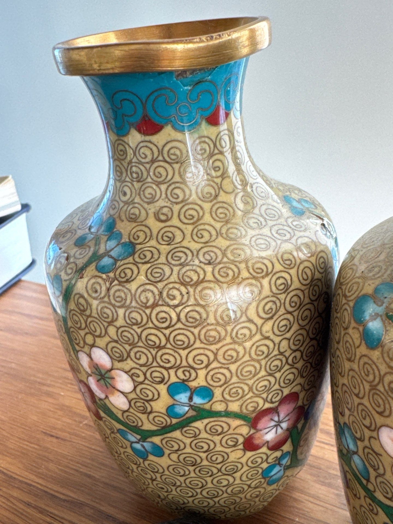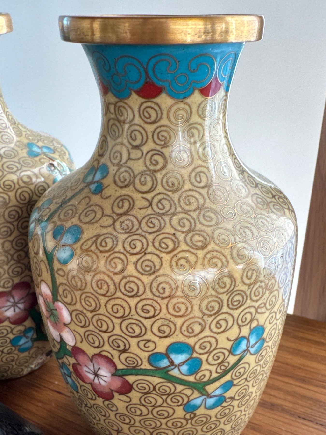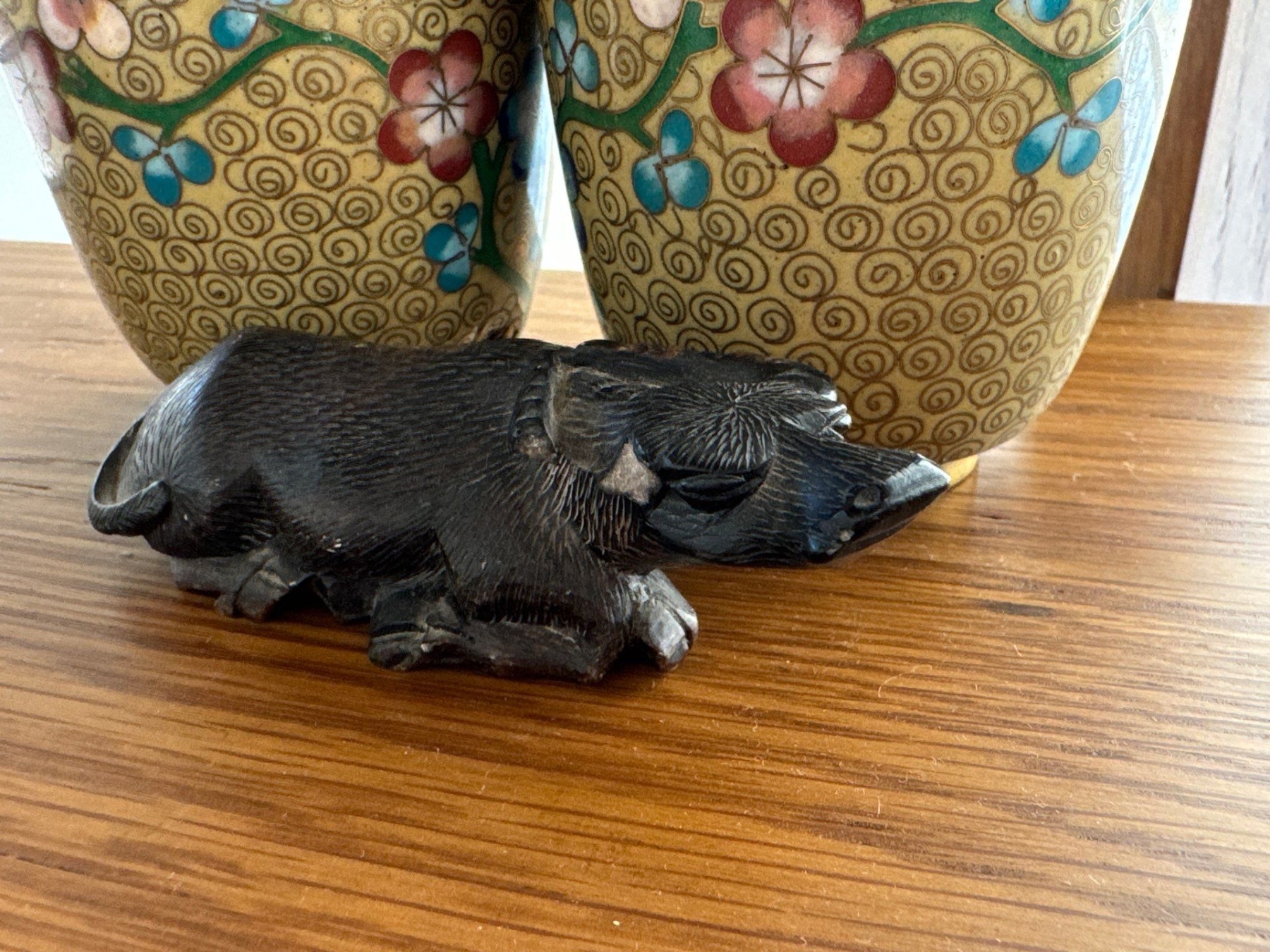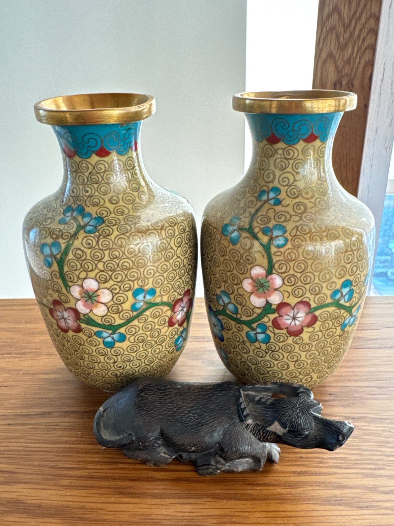 Cloisonne Chrysanthemum Vase Duo w/ Stone Carved Fengshui Zodiac Bull 4L