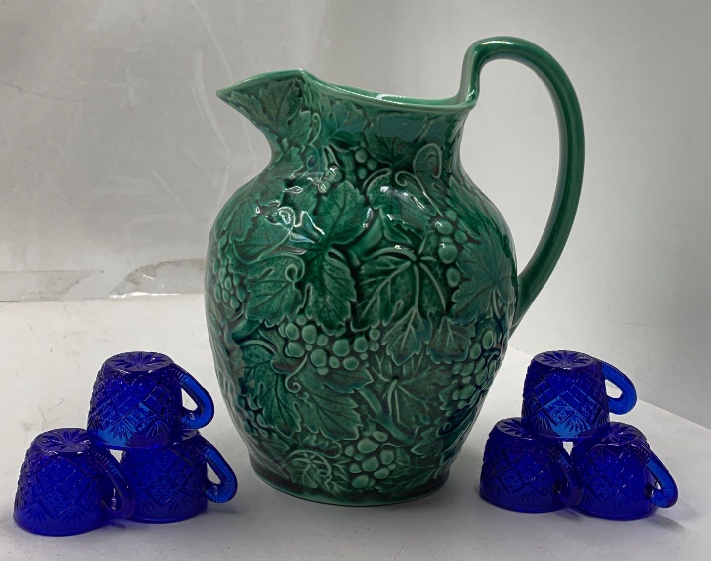 Cobalt Antique Cups w/ Wedgewood (Etruria + Barlaston) Green Grapeleaf Pitcher 8T