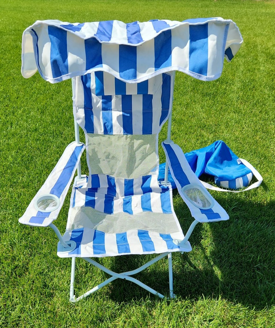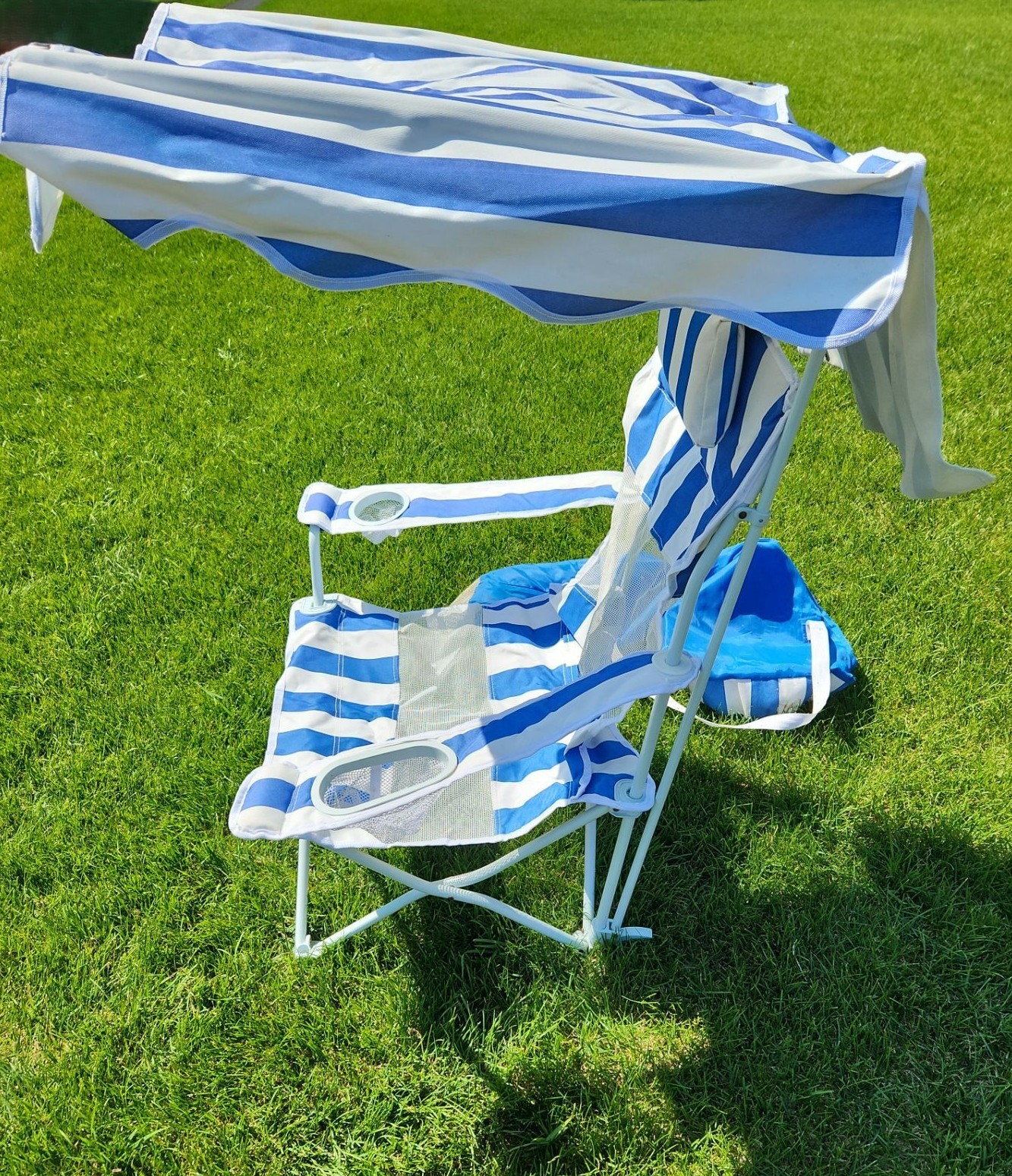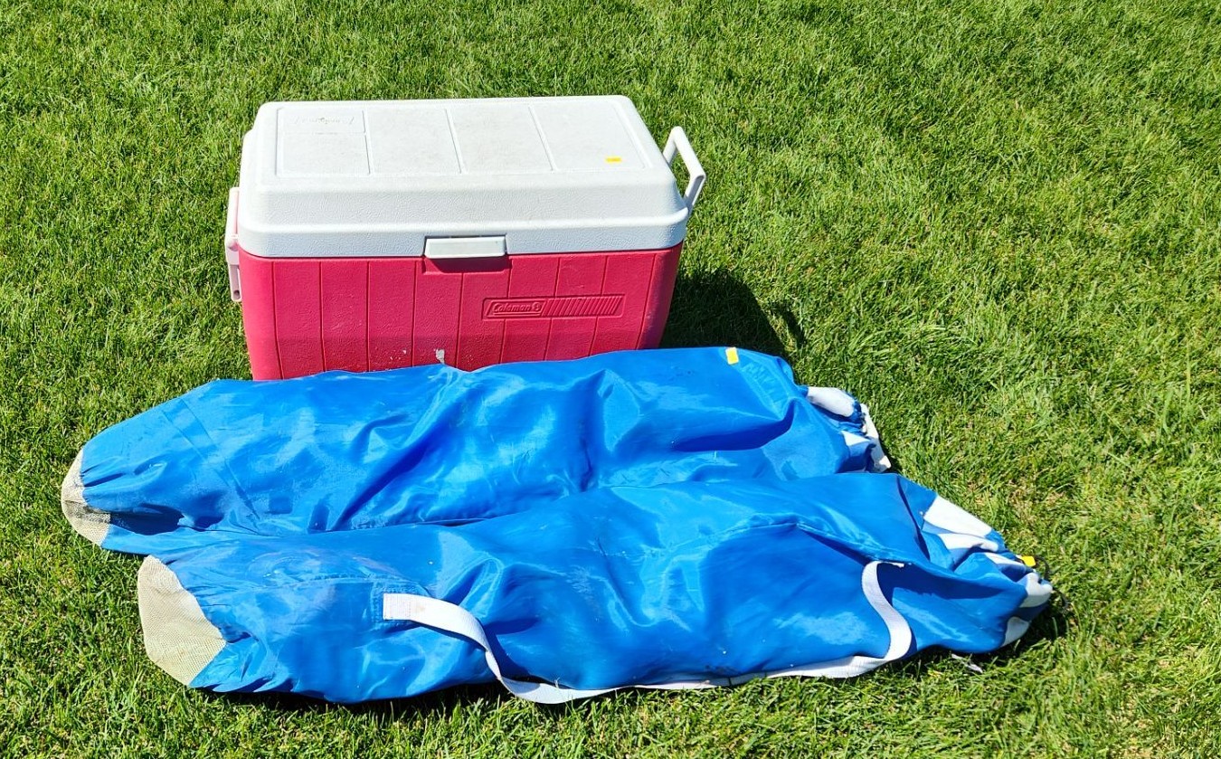 Coleman Cooler 24 W, 12 D, 7 T and Two Folding Striped Chairs 31 W, 21 D, 34 T w/ Sunshades