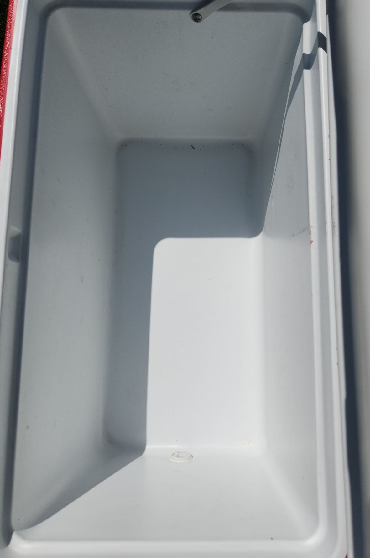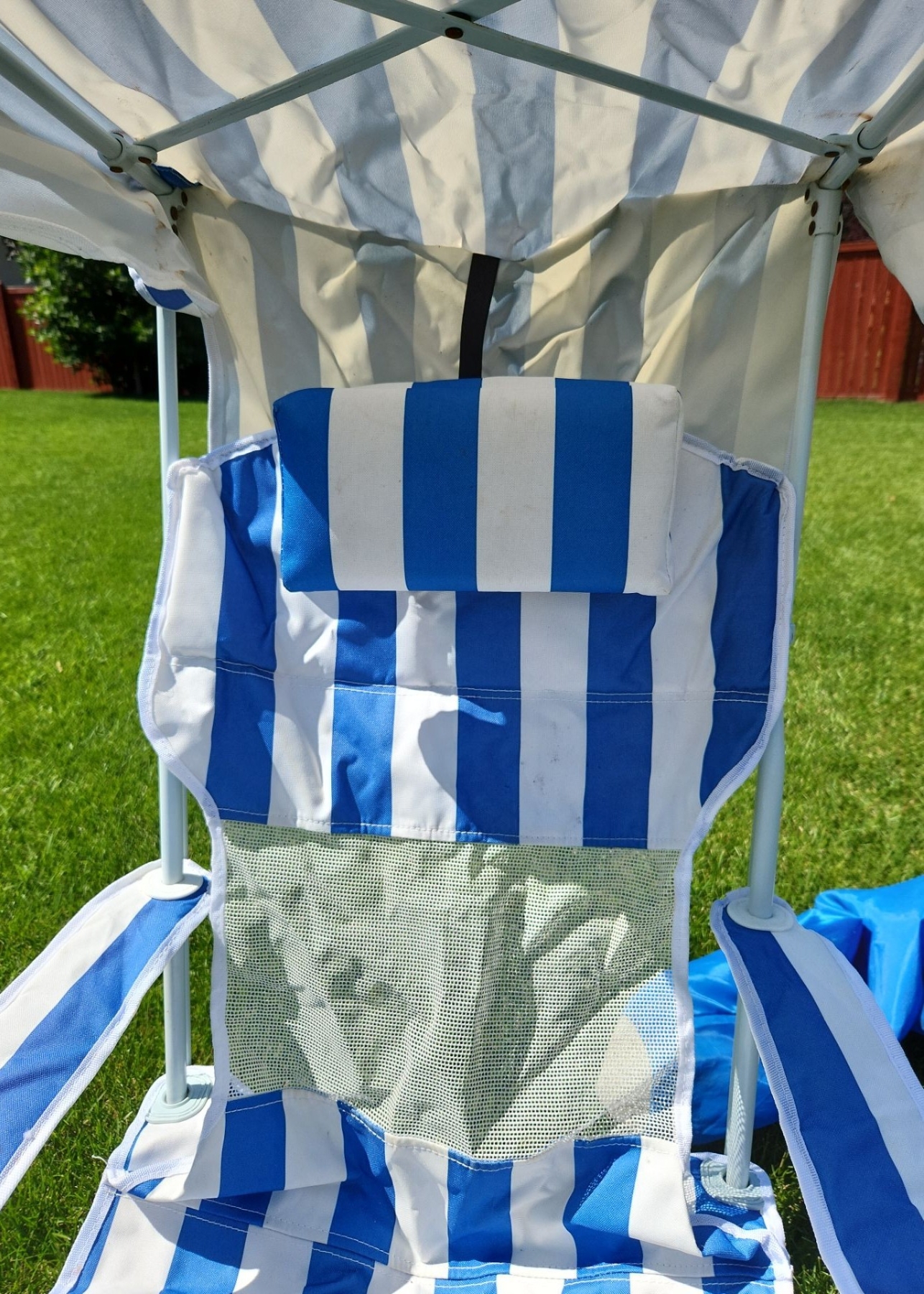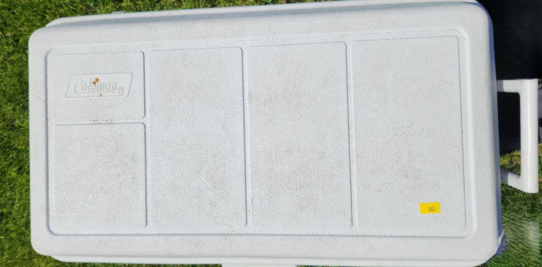 Coleman Cooler 24 W, 12 D, 7 T and Two Folding Striped Chairs 31 W, 21 D, 34 T w/ Sunshades