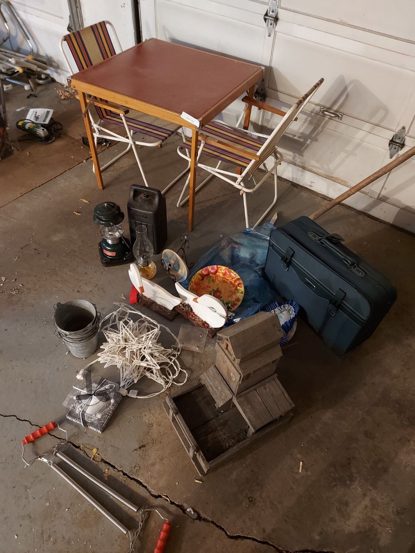 Coleman lantern; vintage Alberta Wheat Pool bird feeder; asst home decor; card table (needs repair); 2 vintage outdoor chairs; arm exerciser