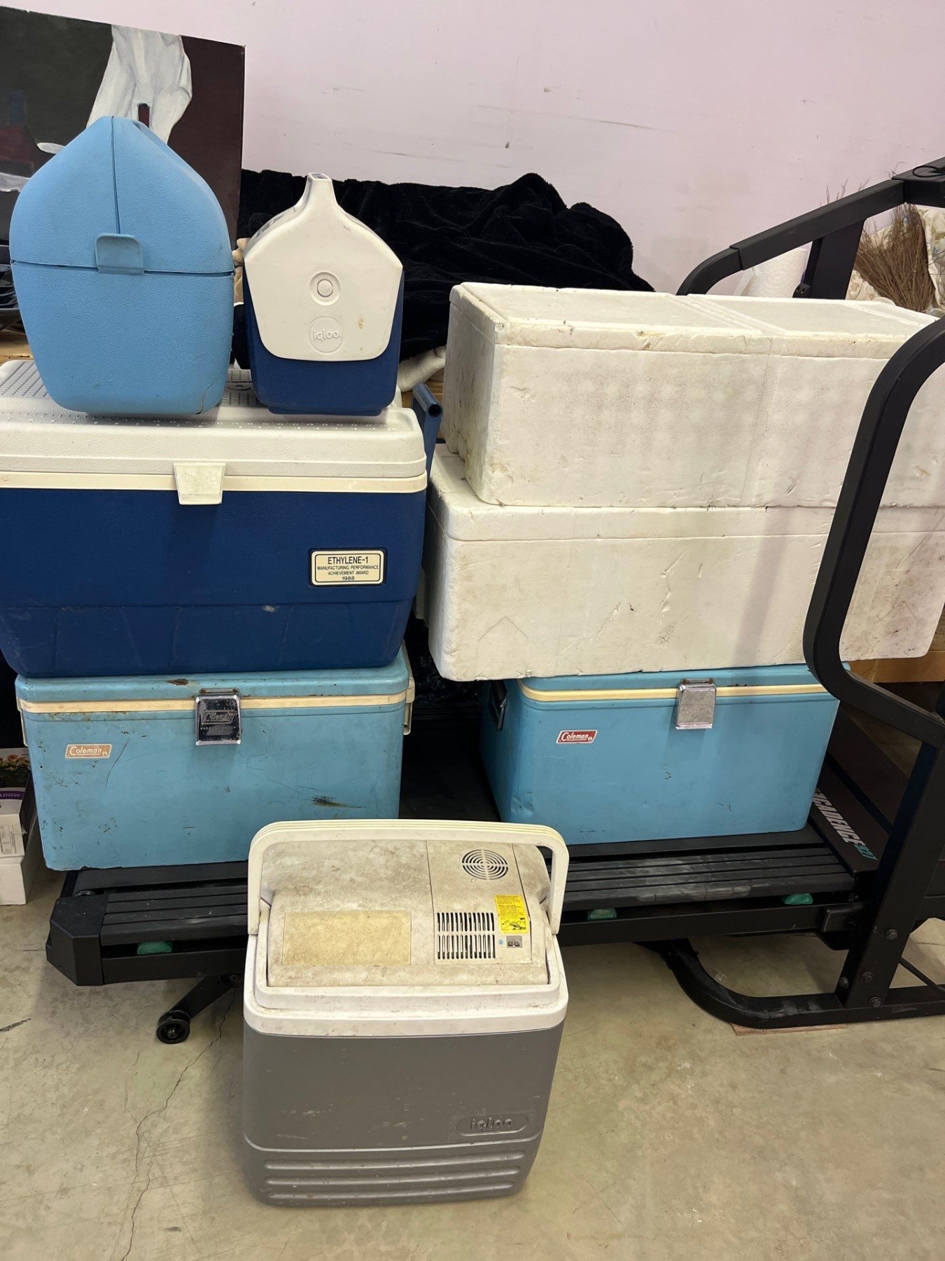 Coleman vintage Coleman coolers a couple of Styrofoam coolers couple of igloo coolers and then an electric igloo cooler. No cord included.