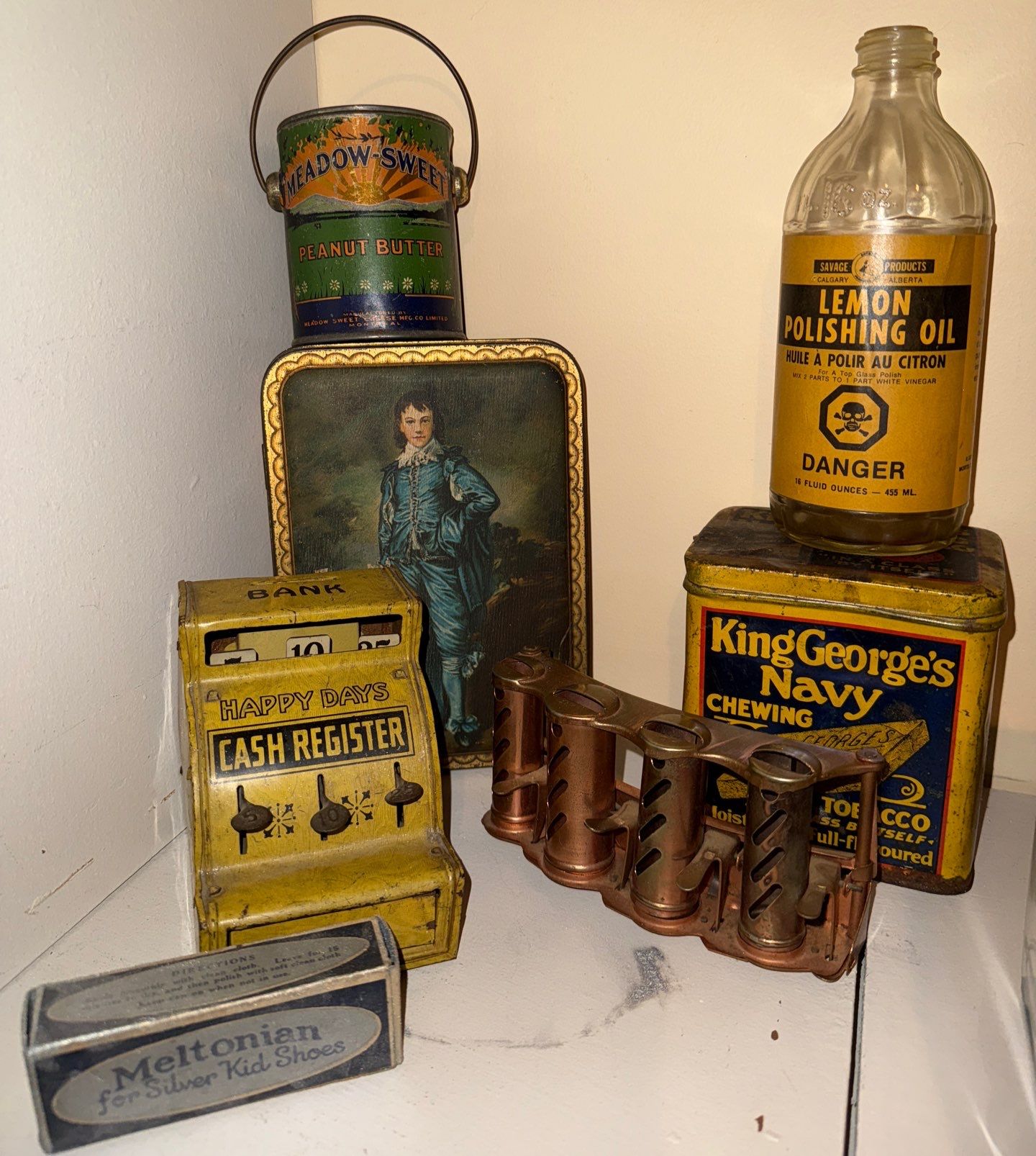Collectible Bottles, Jars & Tins- Boy Blue Tin, Mini Cash Register & Change Sorter