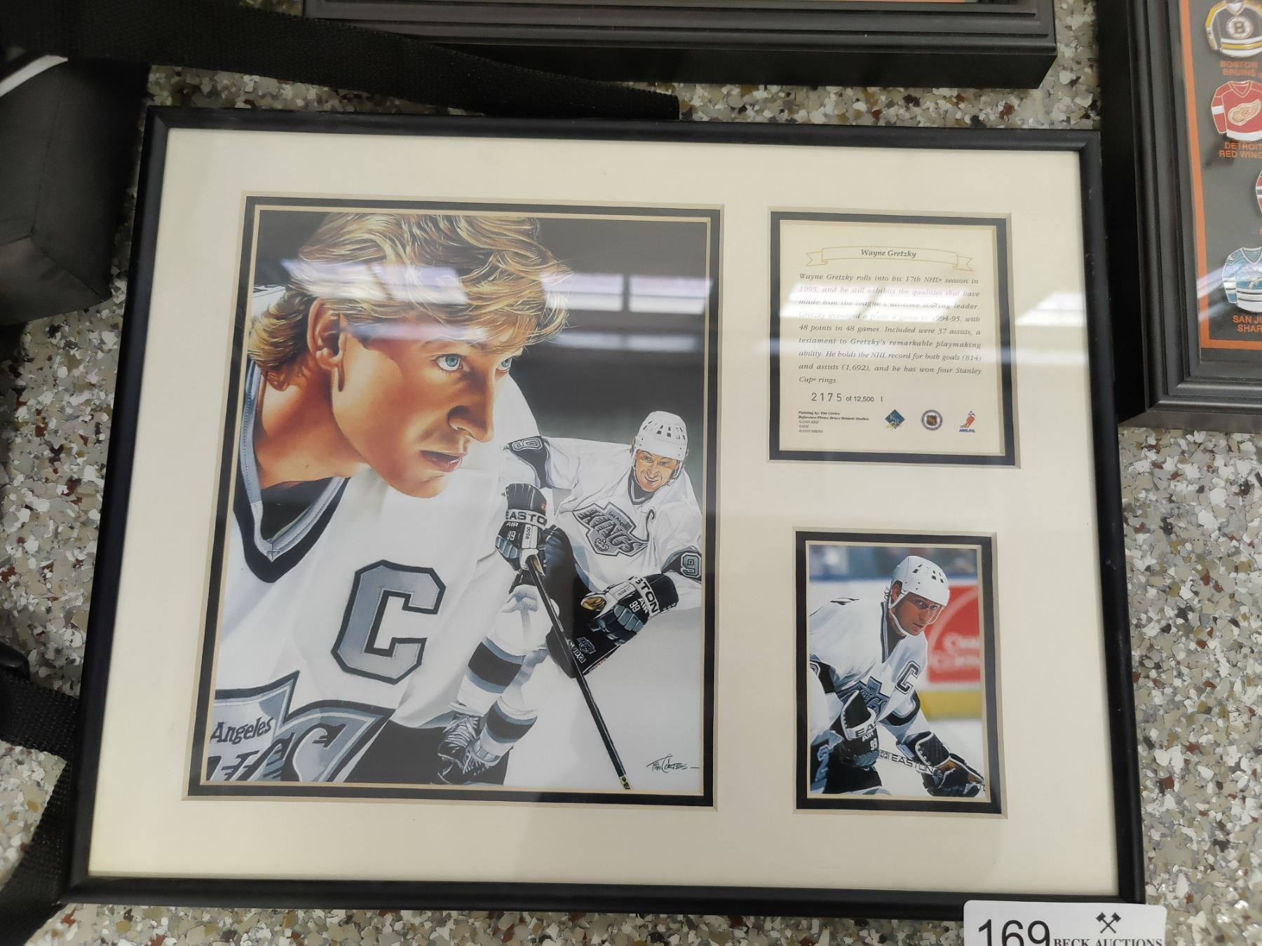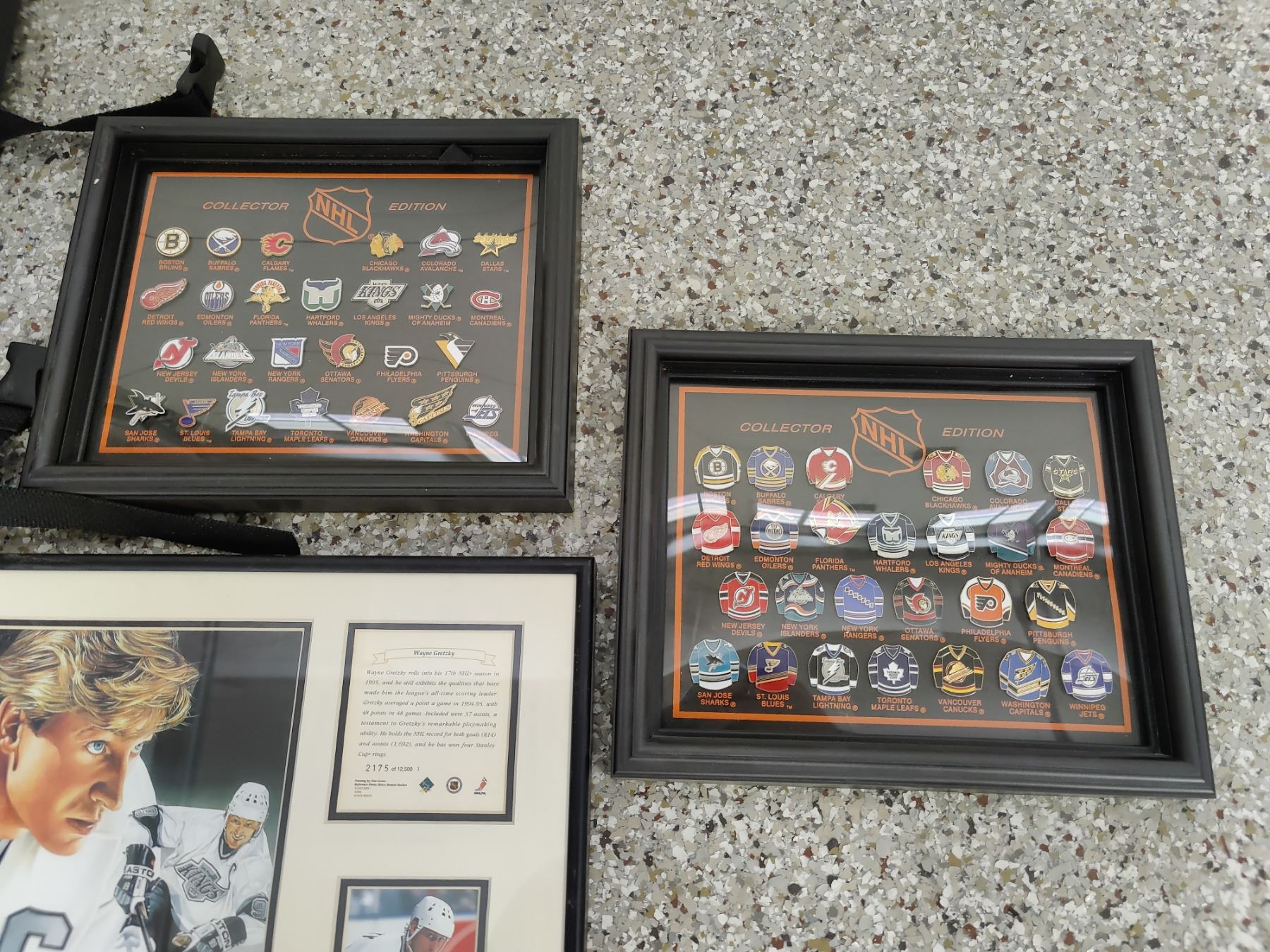 Youth street hockey goalie pads, collectible hockey pin sets (2), framed Wayne Gretzky collectors artwork (2175/12500) and hockey stick blades.
