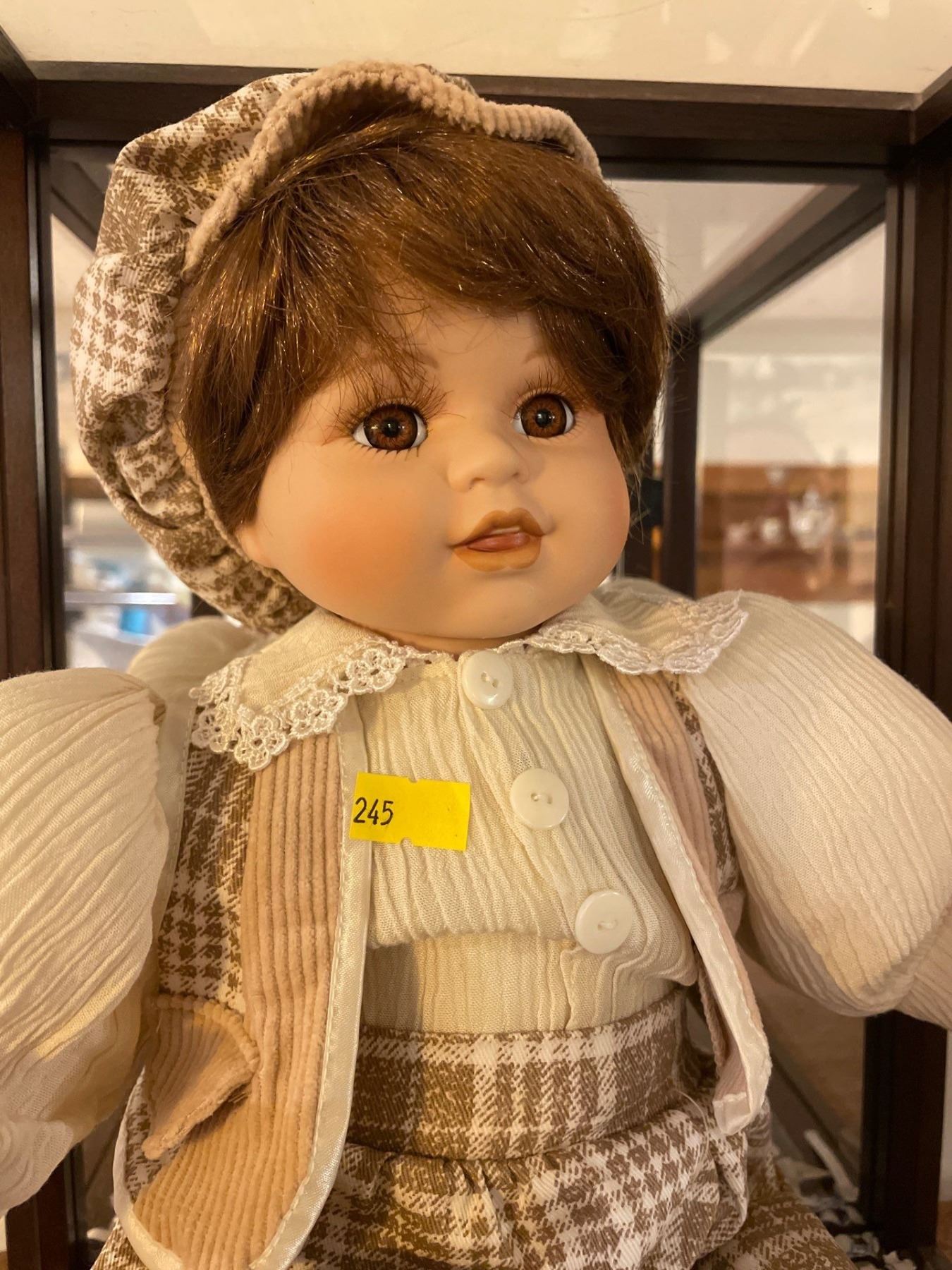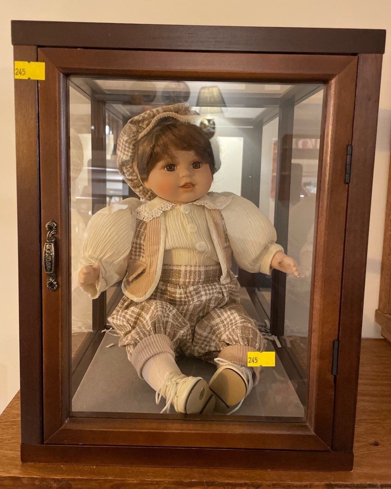 Collectible Porcelain Doll In Wooden Glass Display Case With Front Door Opening 10.5Lx10.5Dx14H