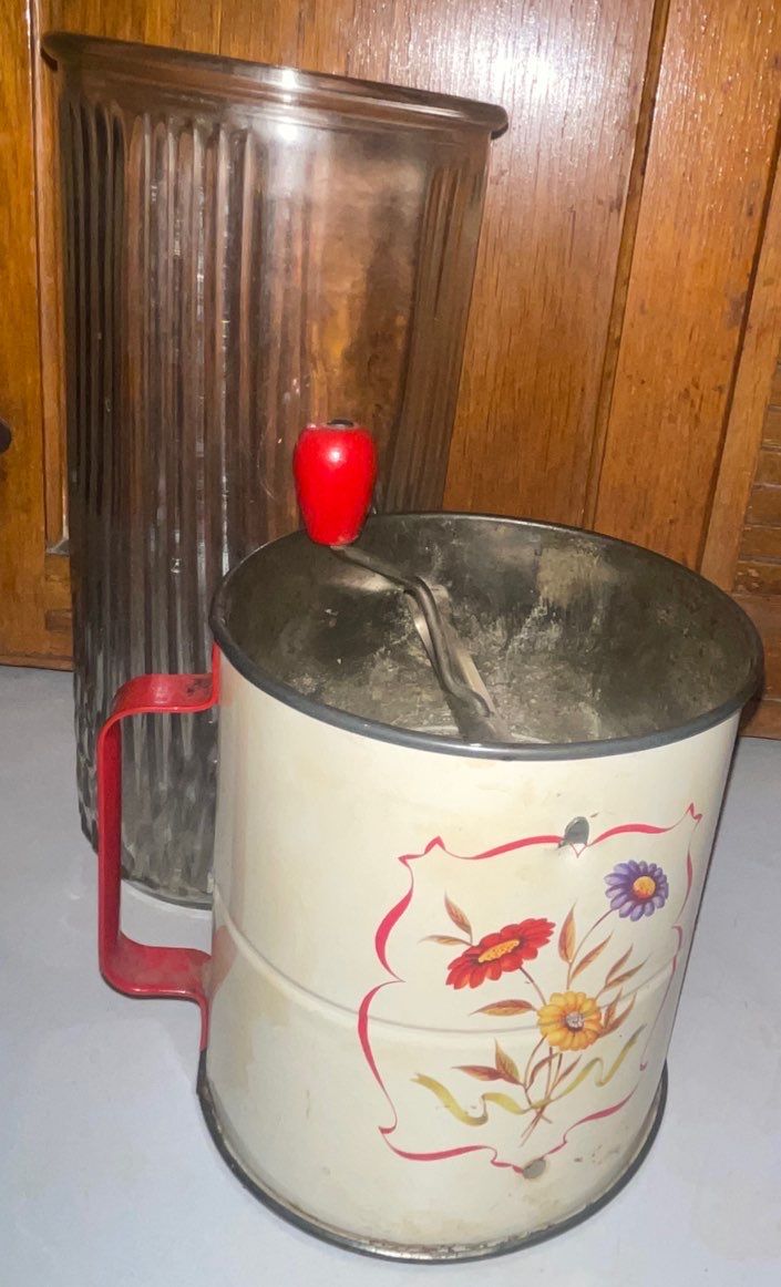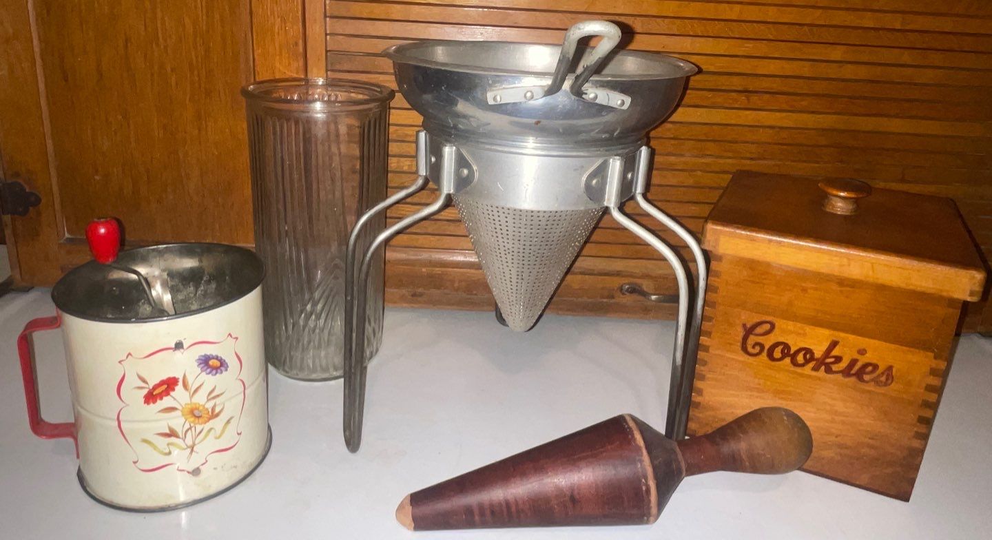 Collection Of Antique Kitchen Utensils- Cookie Box, Sifter, Vase & More