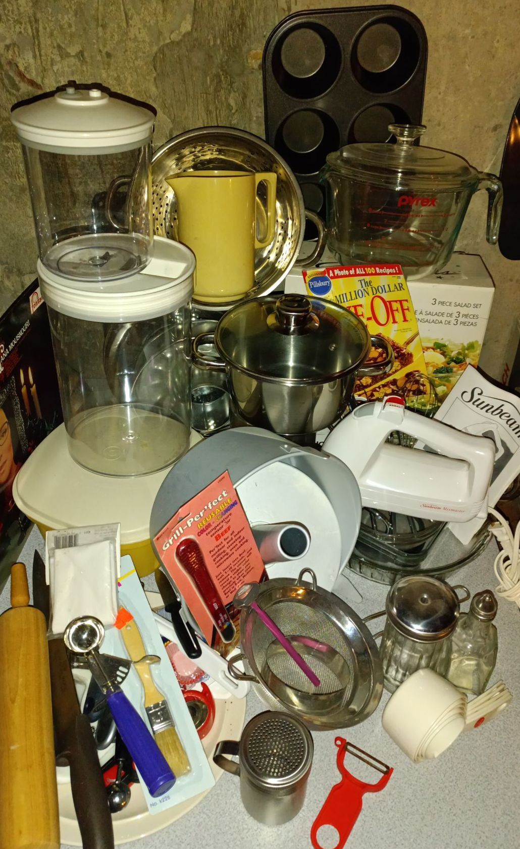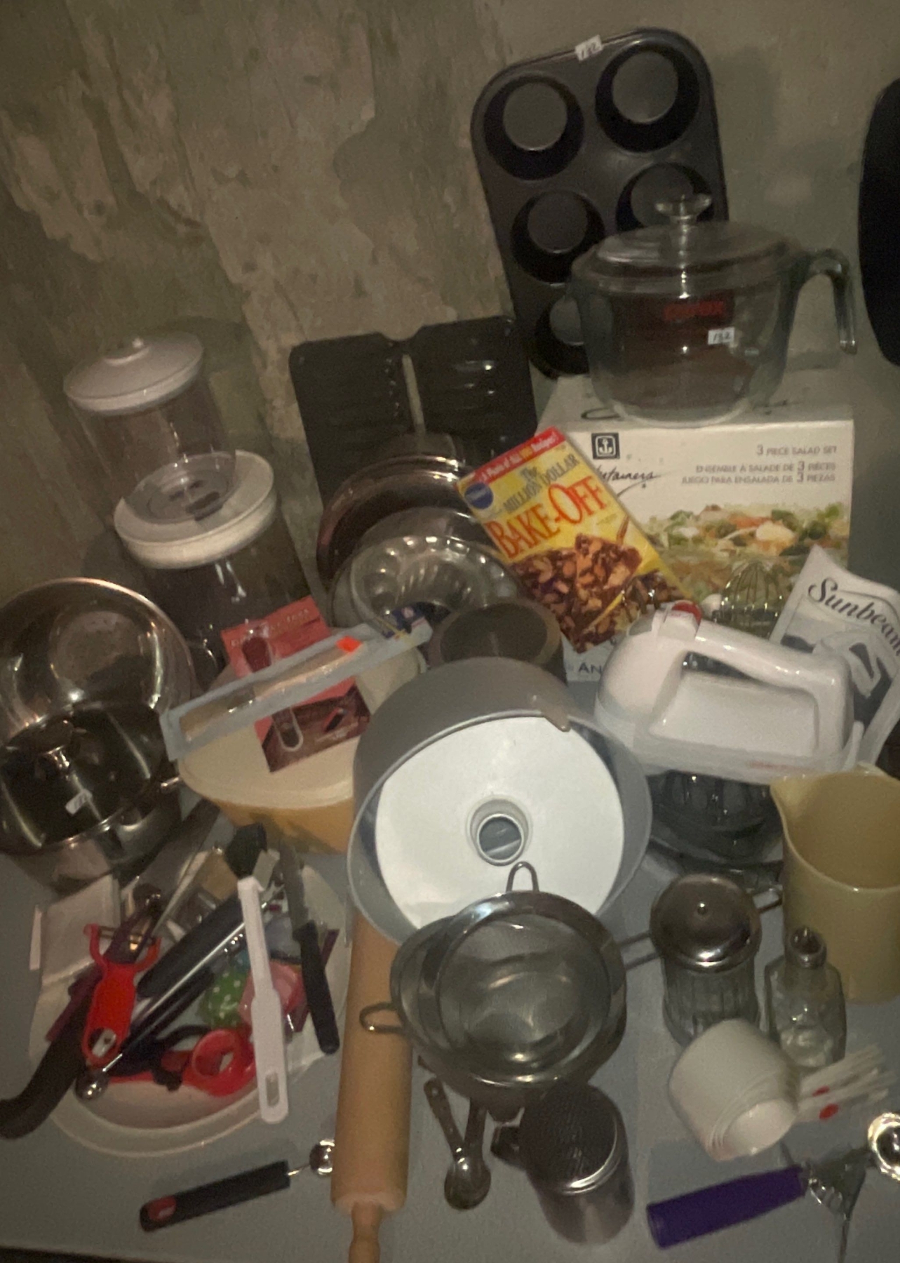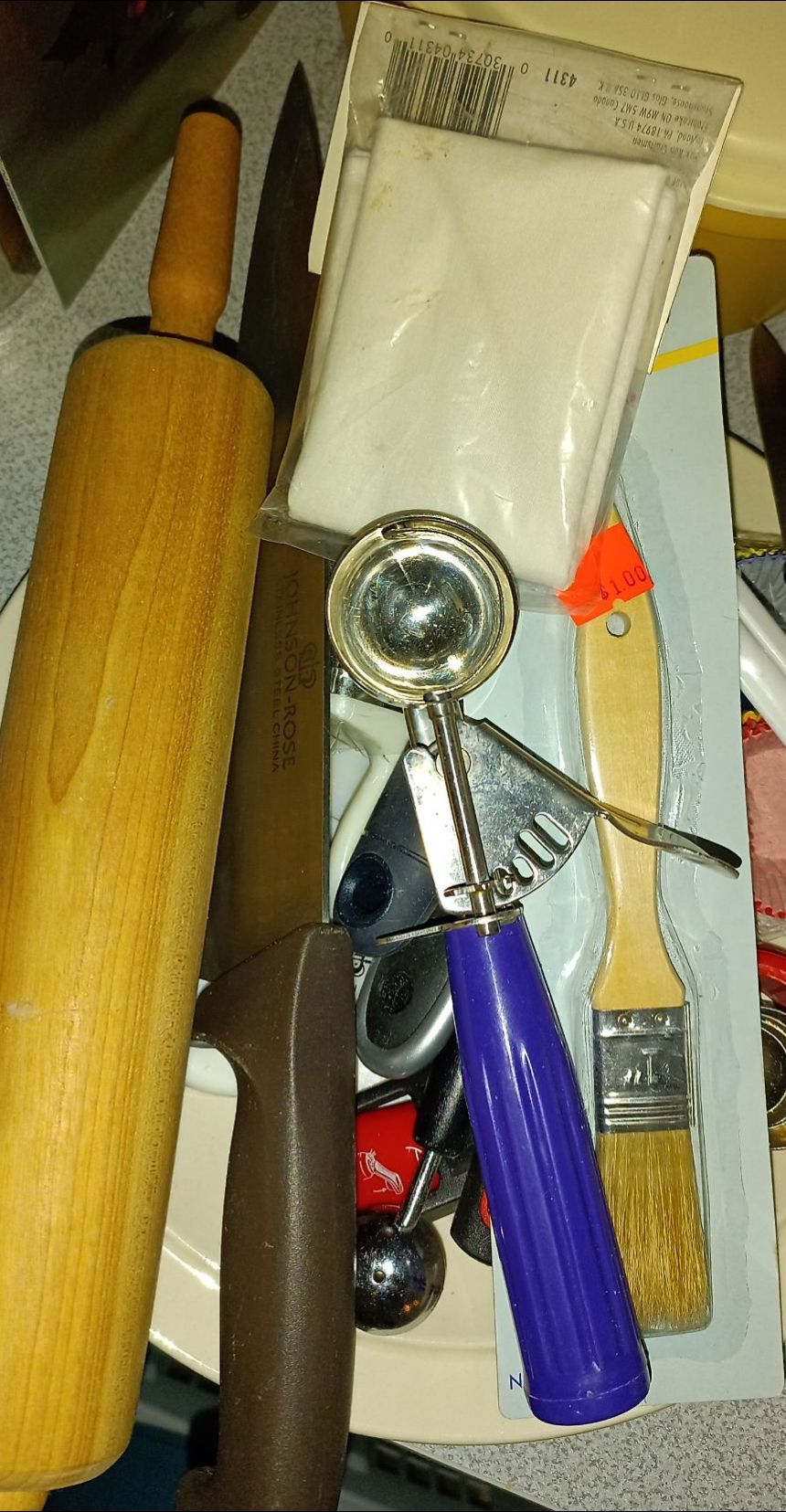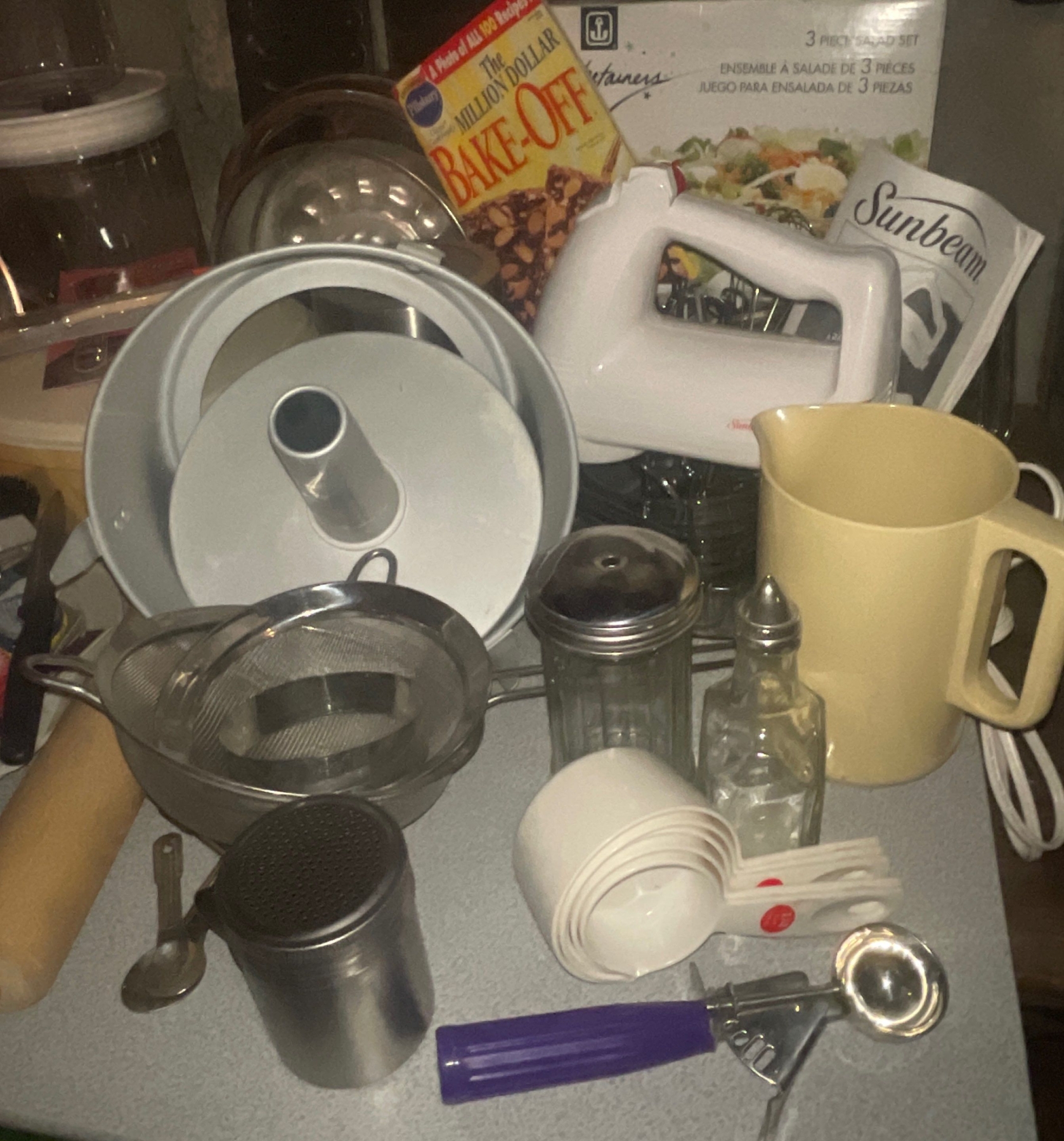 Collection Of Baking & Kitchen Items To Cook And Bake Rolling Pin, Measure Cups, Cannisters, Pyrex Measuring Cup Sunbeam Mixer Angel food Cake Pan Muffin Trays Too