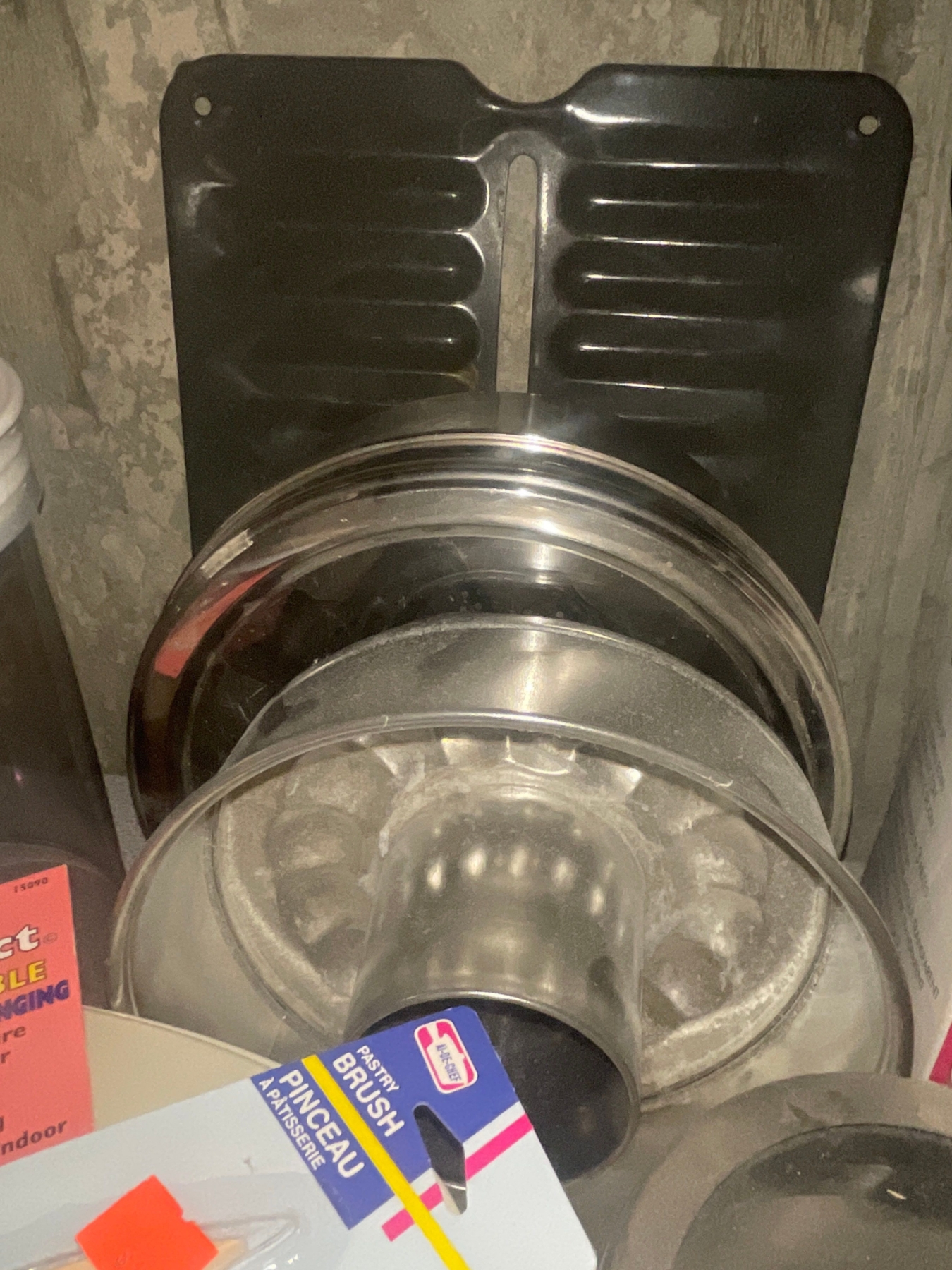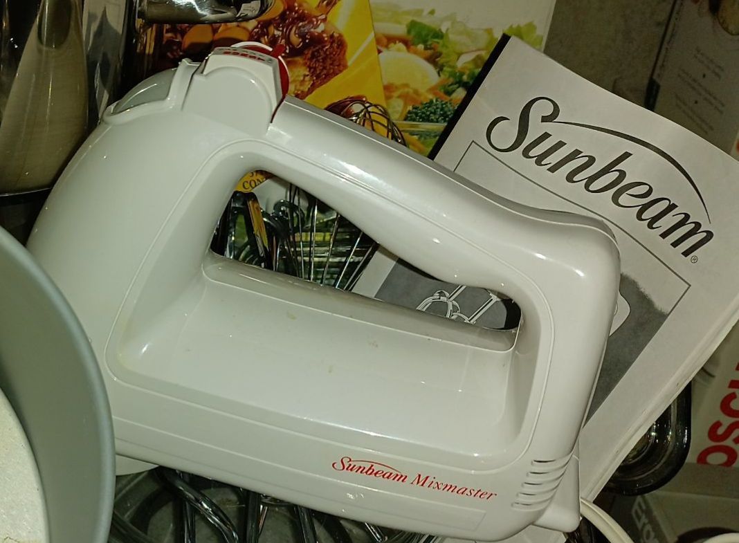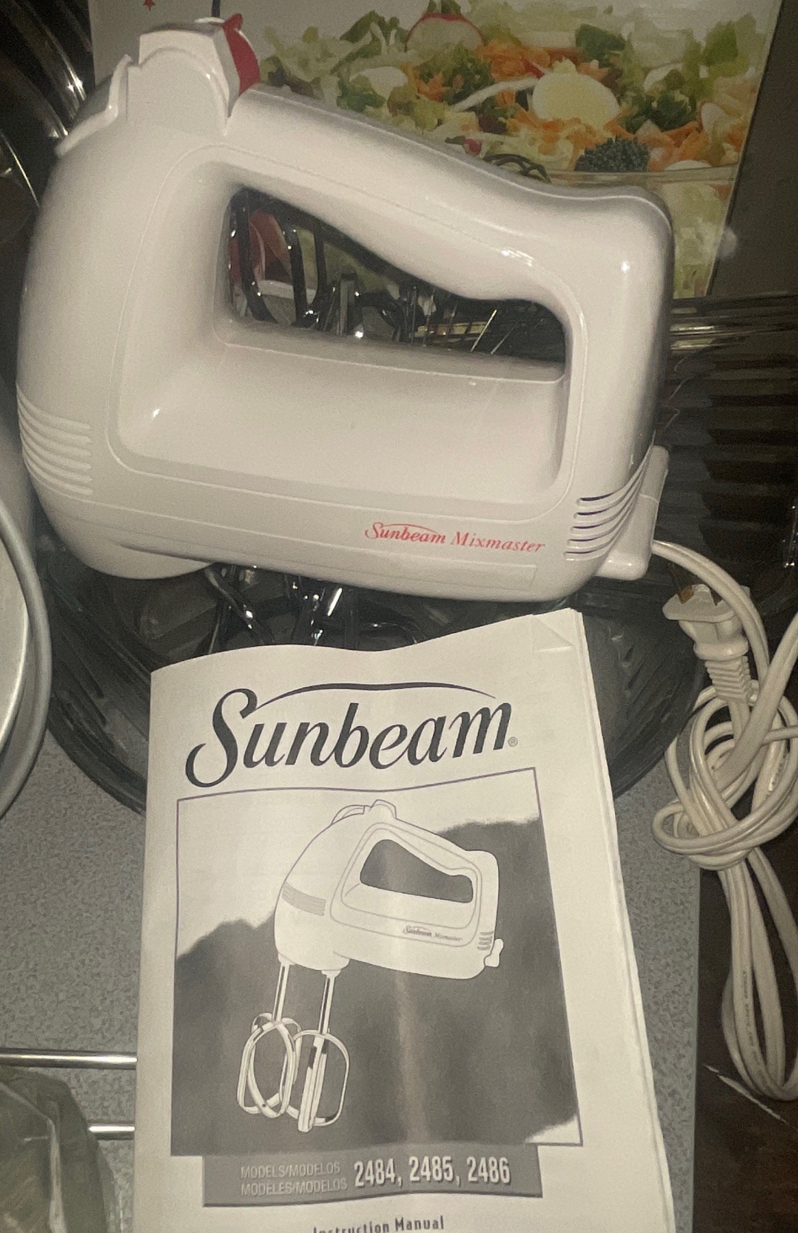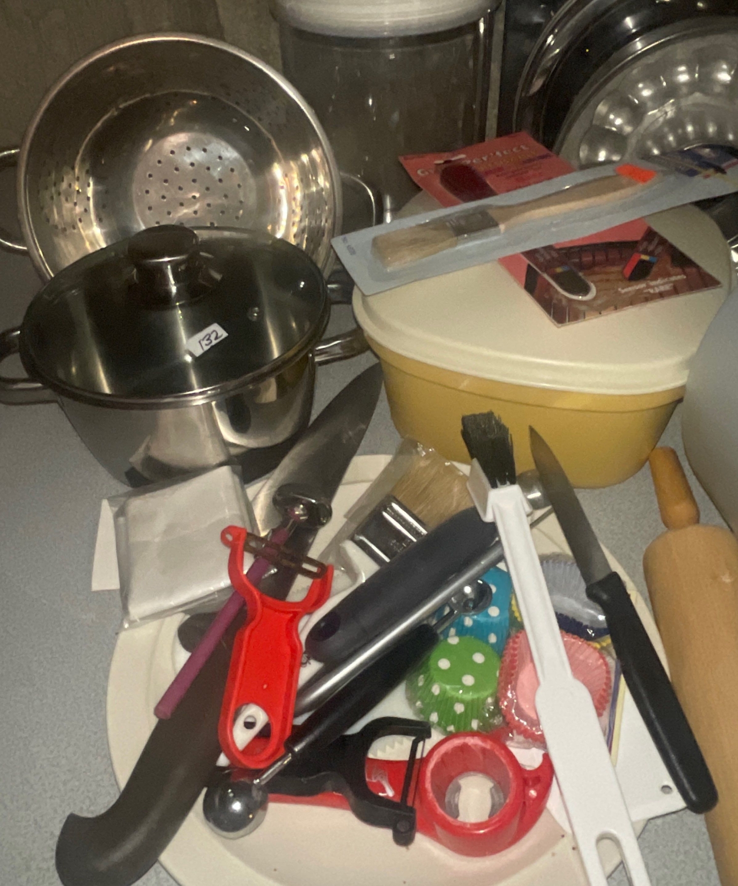 Collection Of Baking & Kitchen Items To Cook And Bake Rolling Pin, Measure Cups, Cannisters, Pyrex Measuring Cup Sunbeam Mixer Angel food Cake Pan Muffin Trays Too