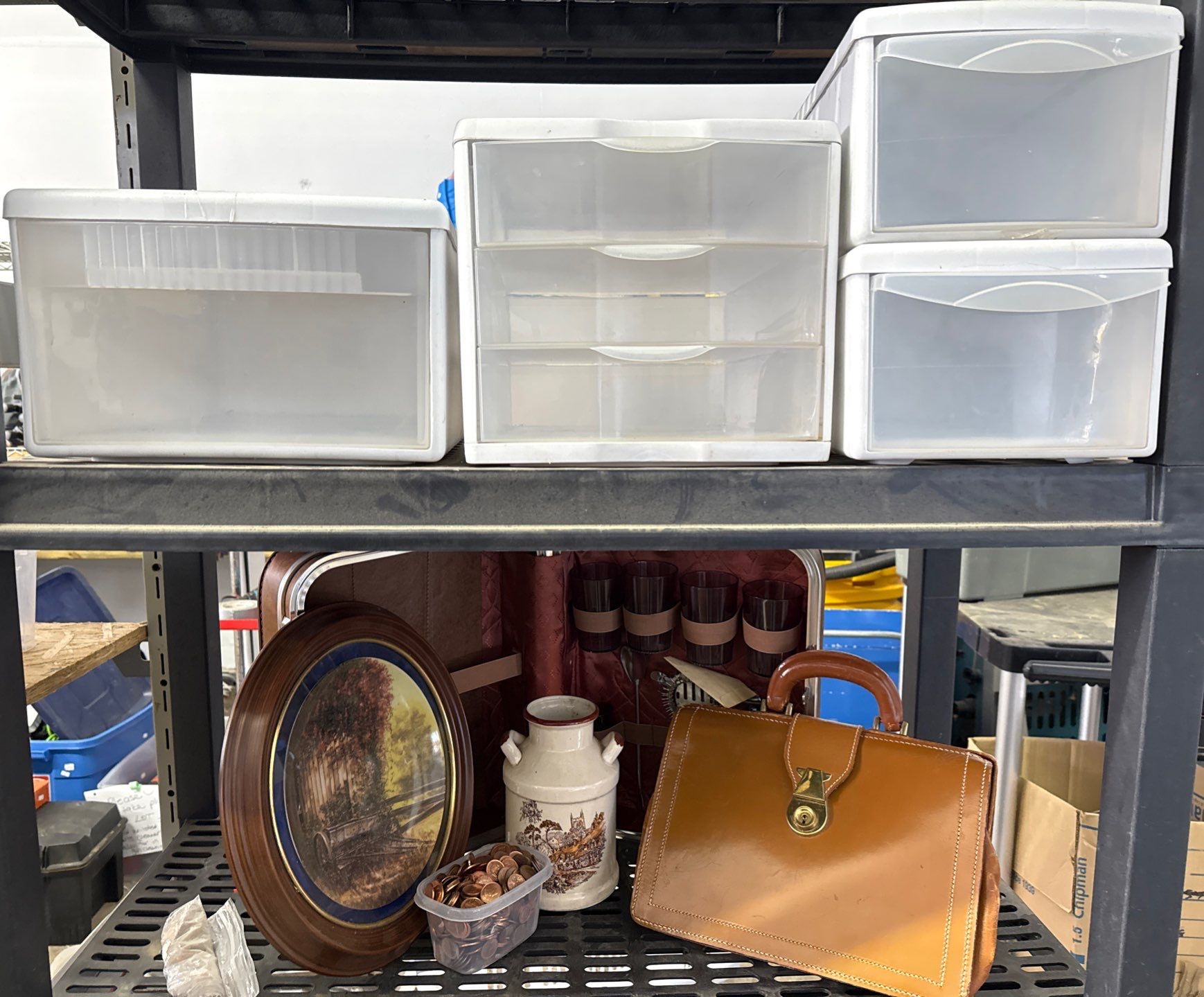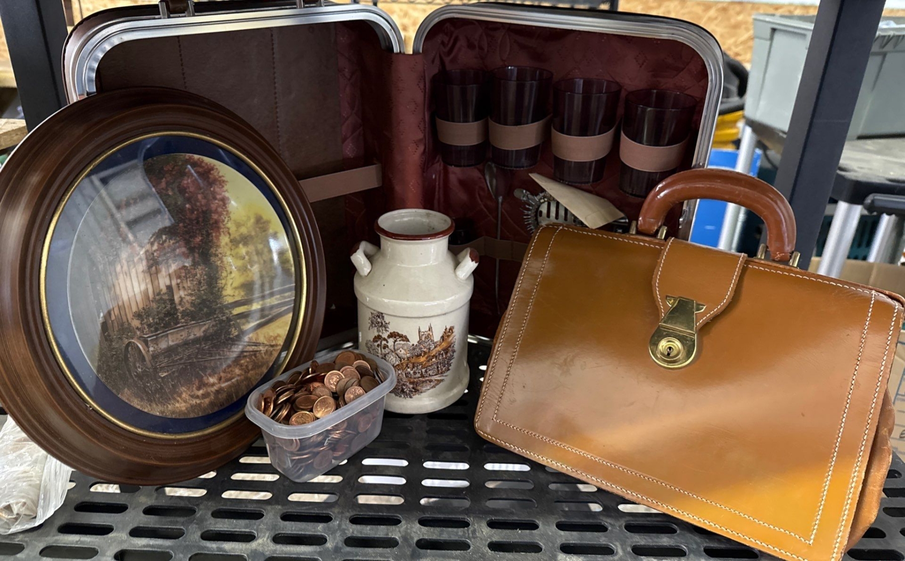 Collection Of Household Collectibles, Container Of Pennies, Bag, Vase, Wall Hanging & More