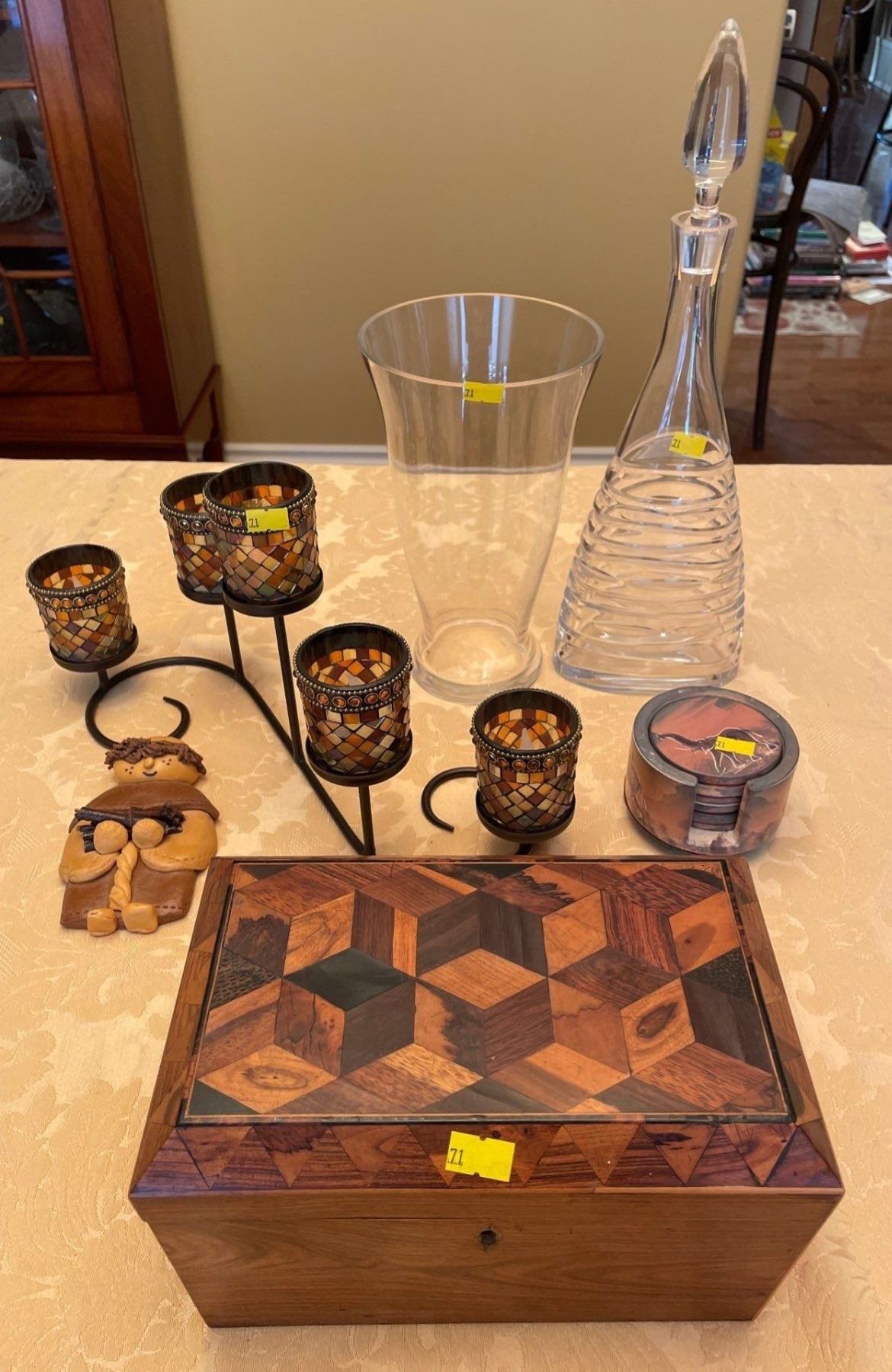 Collection Of Inside Home Decor - Decanter, Antique Handcrafted Humidor Box, & More