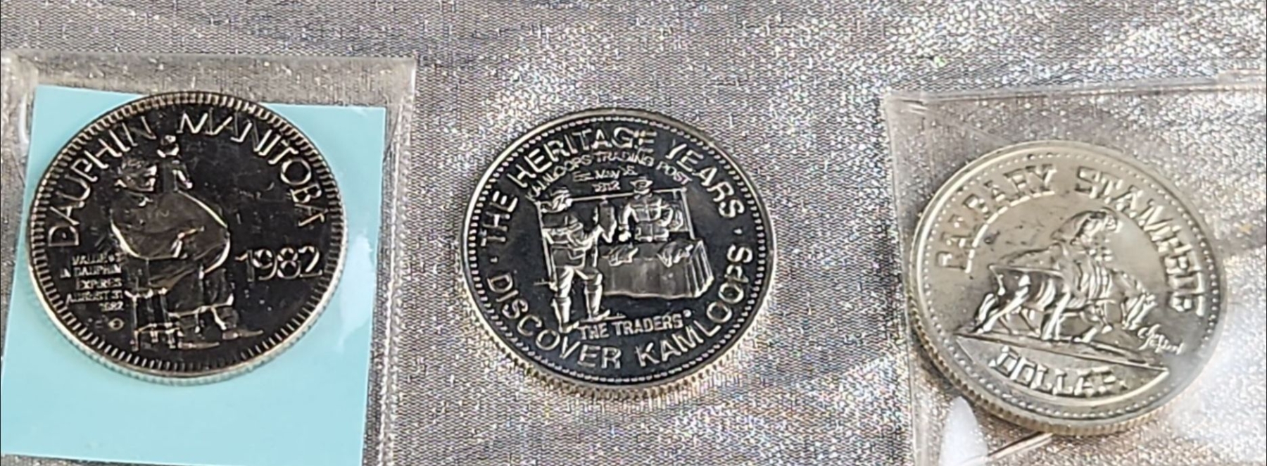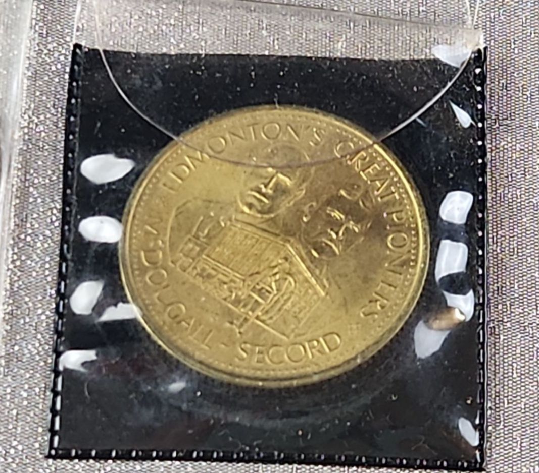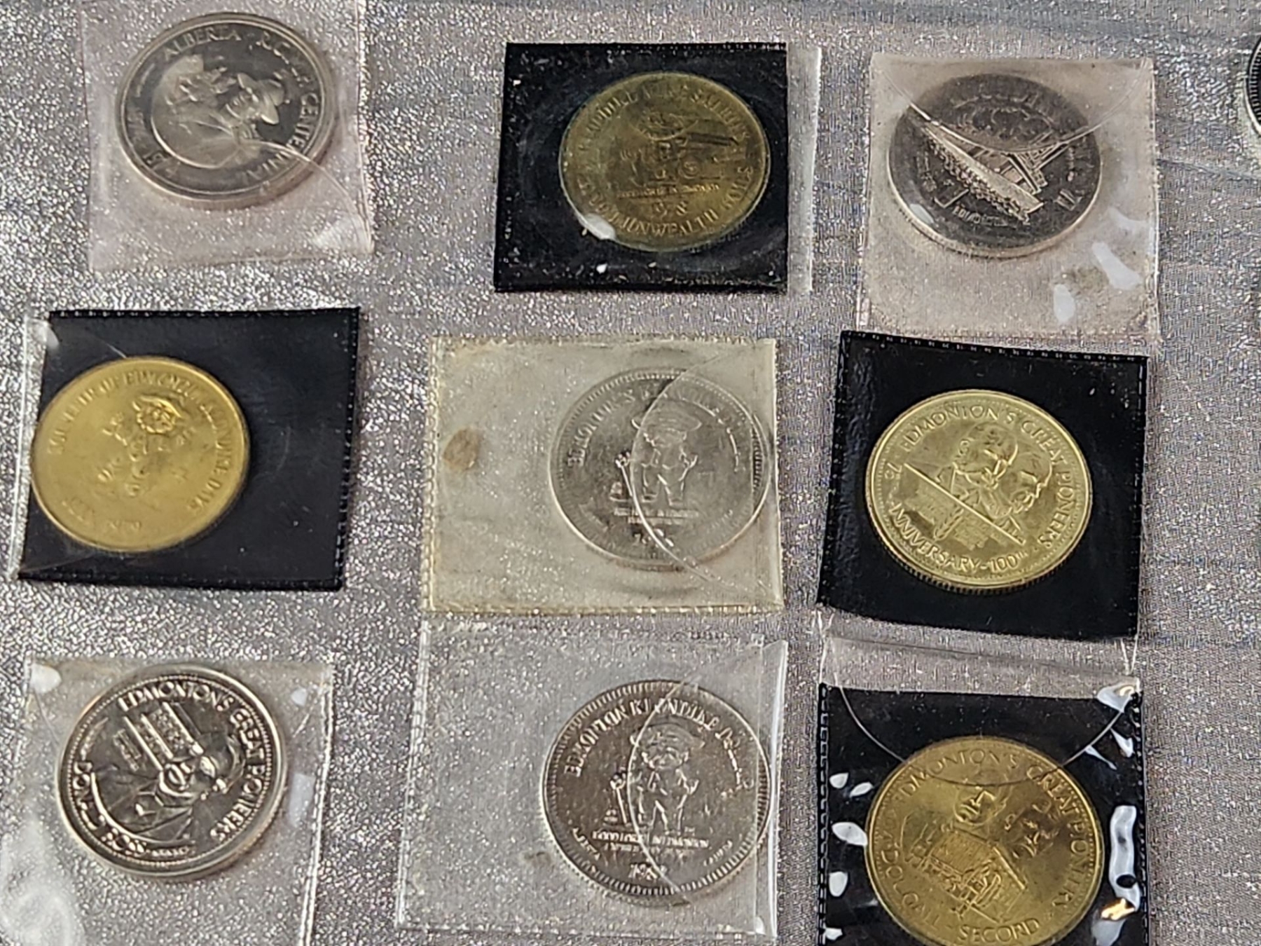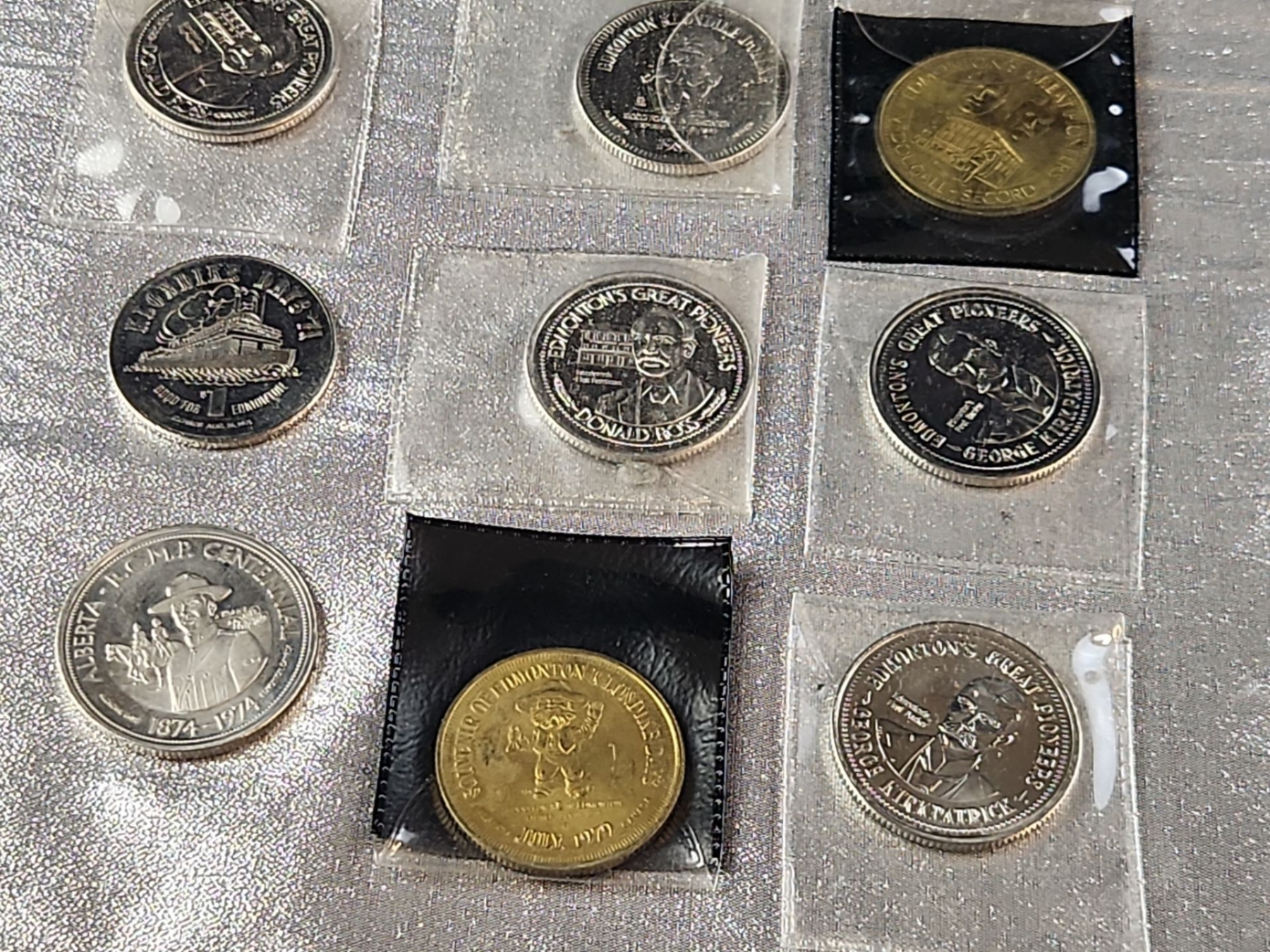 A collection of various vintage coins and numismatic tokens, related to Edmonton, Alberta, and the surrounding region, as well as Canadian commemorative coins from various places. Some in plastic protective cases.