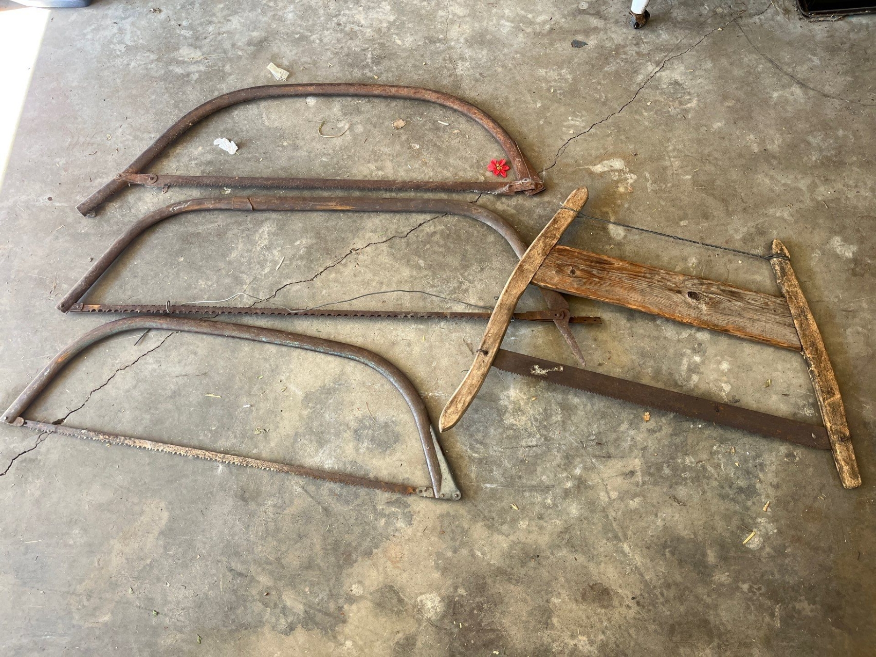 Collection of 4 Antique Saws 3 metal framed and 1 wood framed .