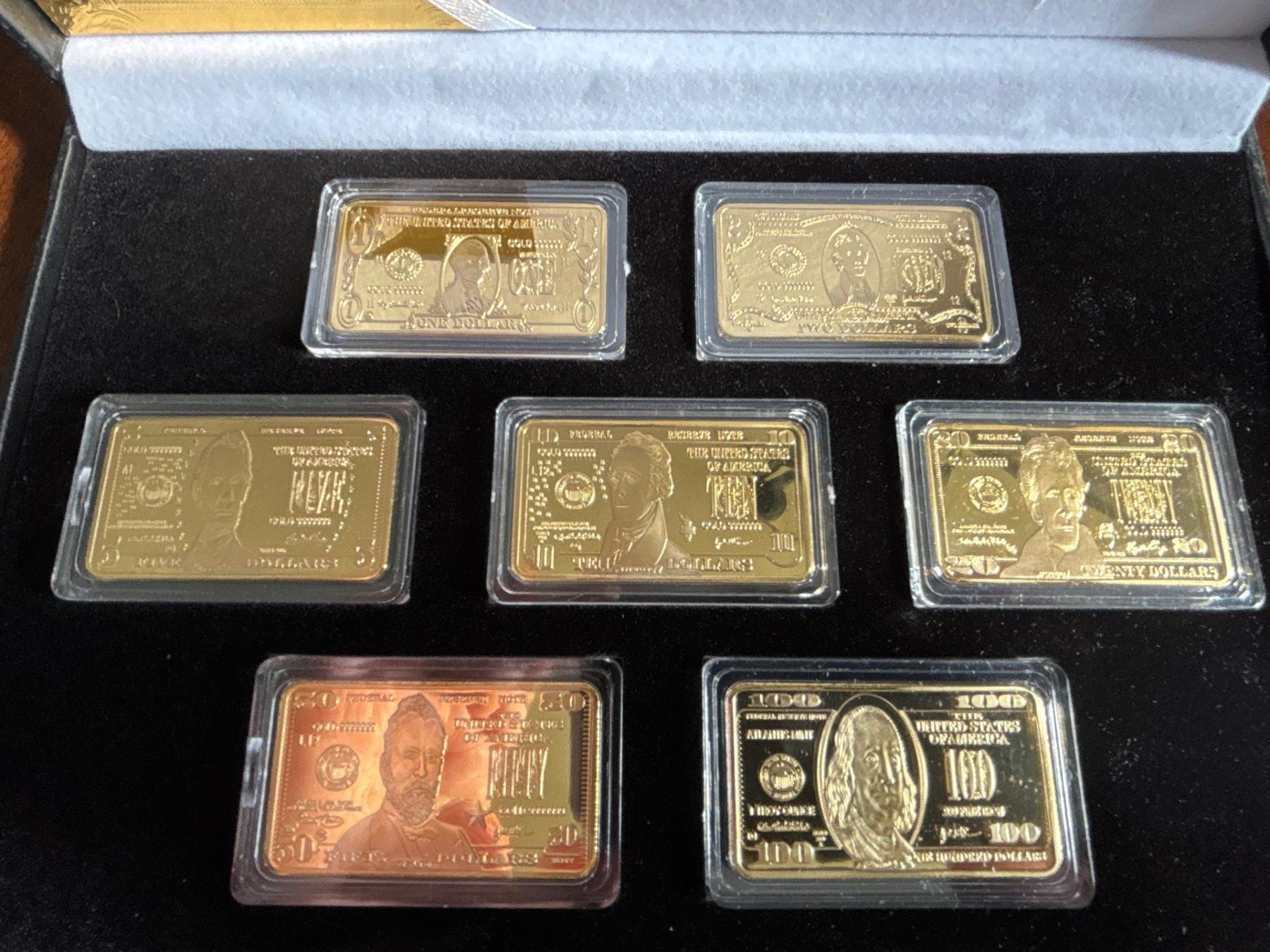 Collection of 7 Gold plated US Dollars from $1-$100 With certificate and Black Collectors box